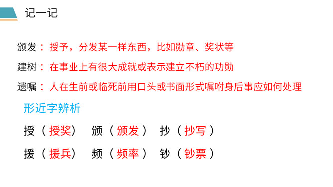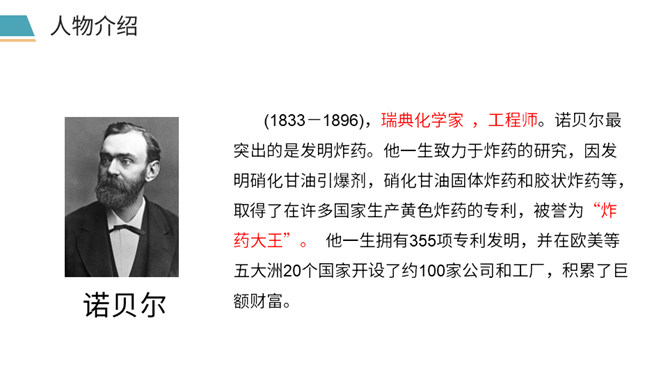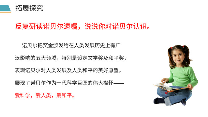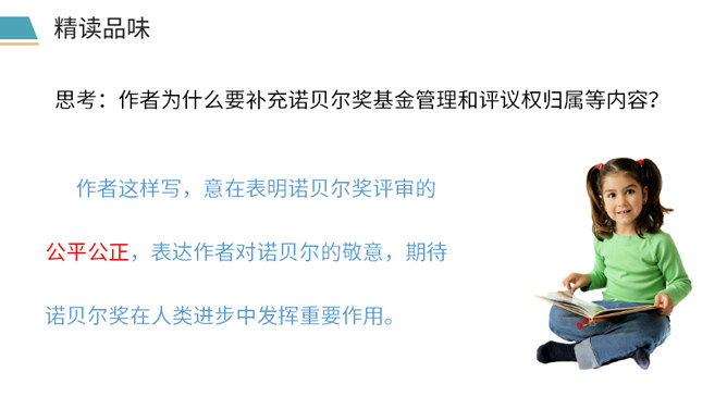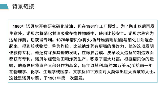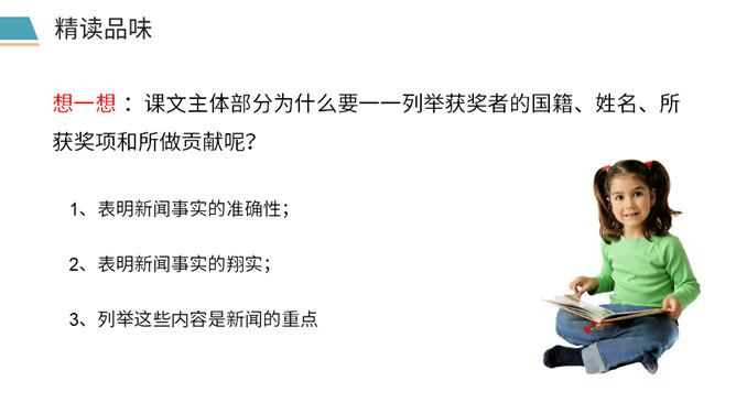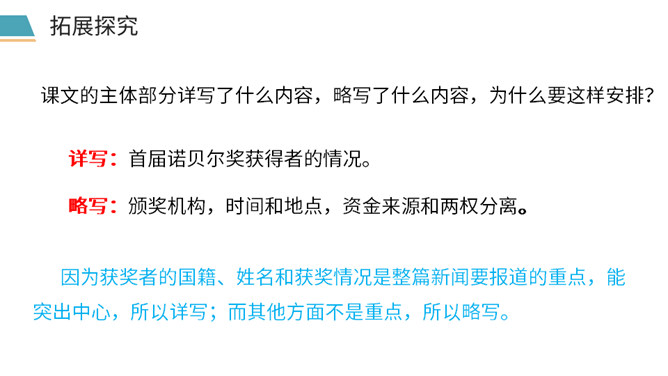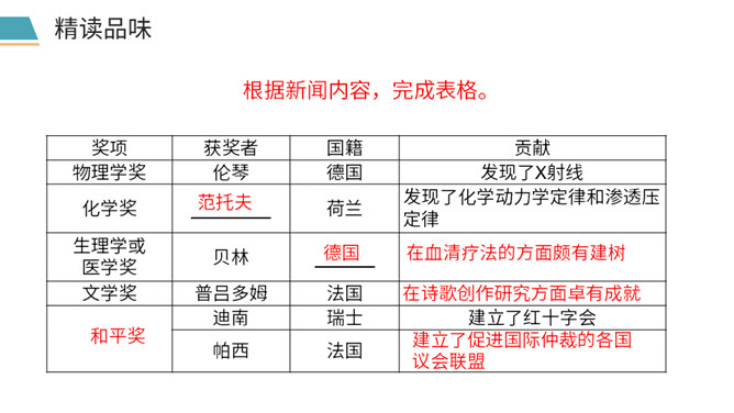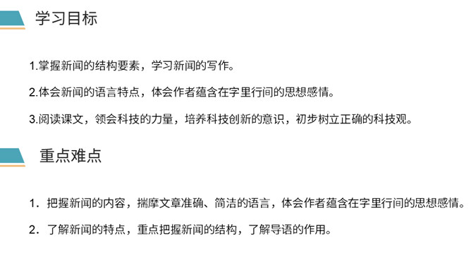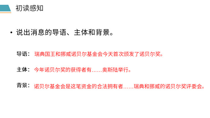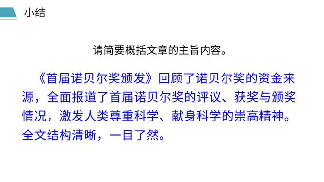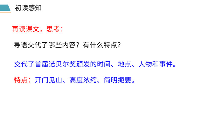 学习目标:1.掌握新闻的结构要素,学习新闻的写作。2.体会新闻的语言特点,体会作者蕴含在字里行间的思想感情。3.阅读课文,领会科技的力量,培养科技创新的意识,初步树立正确的科技观。重点难点:1.把握新闻的内容,揣摩文章准确、简洁的语言,体会作者蕴含在字里行间的思想感情。2.了解新闻的特点,重点把握新闻的结构,了解导语的作用。再读课文,思考:导语交代了哪些内容?有什么特点?交代了首届诺贝尔奖颁发的时间、地点、人物和事件。特点:开门见山、高度浓缩、简明扼要。所属专题:首届诺贝尔奖颁发ppt。