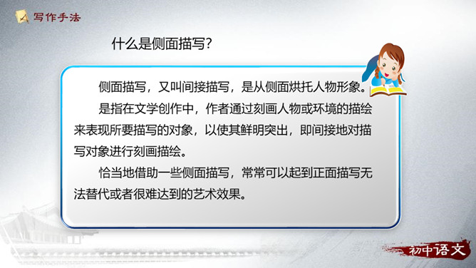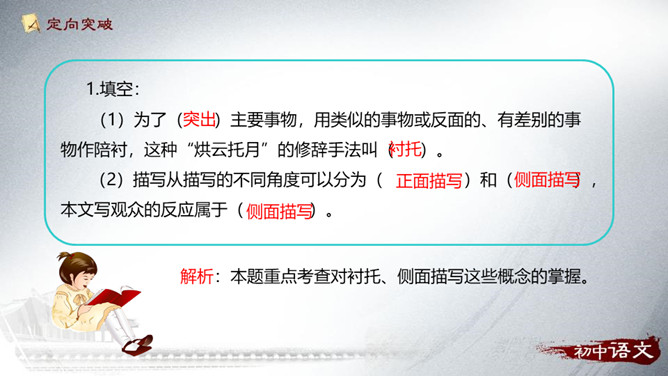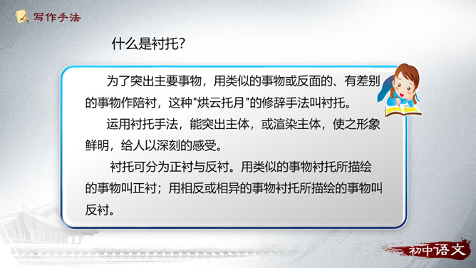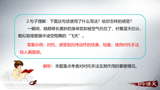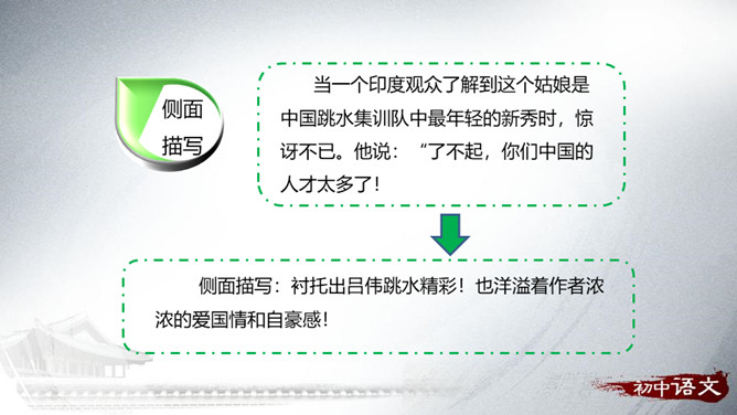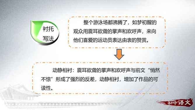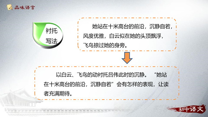 以白云、飞鸟的动衬托吕伟此时的沉静。 “她站在十米高台的前沿,沉静自若”会有怎样的表现,让读者充满期待。动静相衬:震耳欲聋的掌声和欢呼声与前文“悄然不惊”形成了强烈的反差,动静相衬,增加了作品的可读性。侧面描写:衬托出吕伟跳水精彩!也洋溢着作者浓浓的爱国情和自豪感!为了突出主要事物,用类似的事物或反面的、有差别的事物作陪衬,这种"烘云托月"的修辞手法叫衬托。运用衬托手法,能突出主体,或渲染主体,使之形象鲜明,给人以深刻的感受。衬托可分为正衬与反衬。所属专题:飞天凌空ppt。