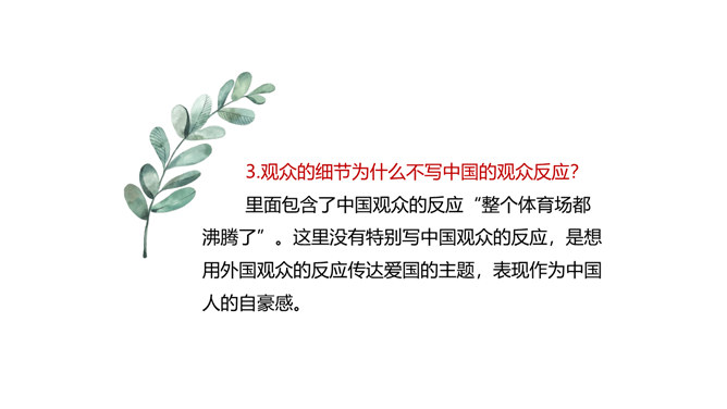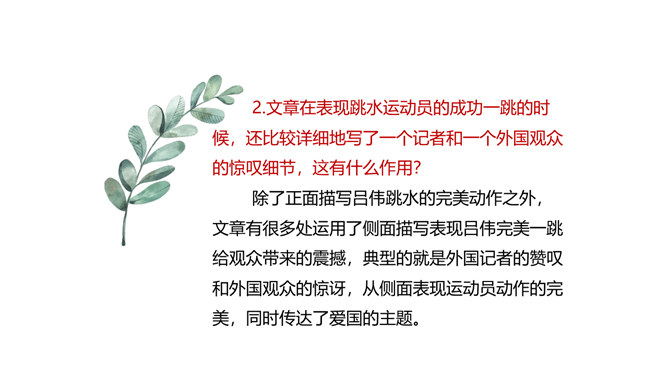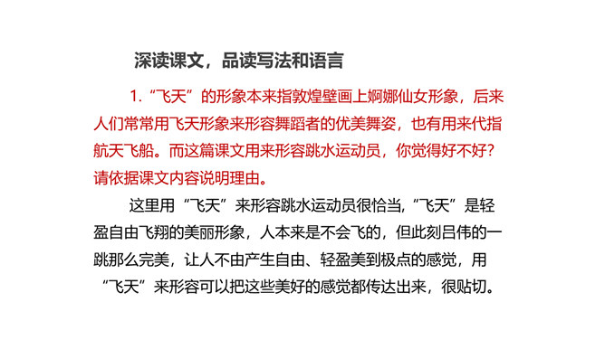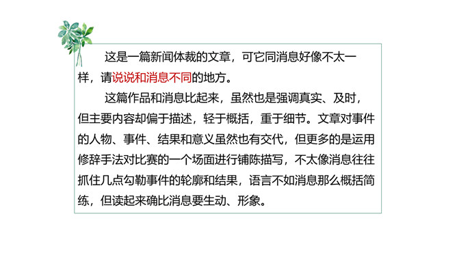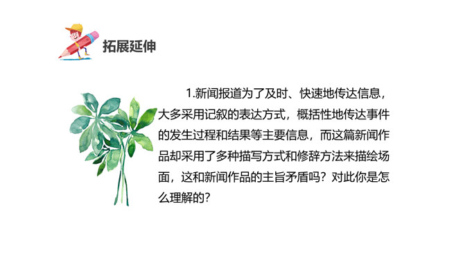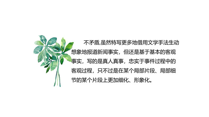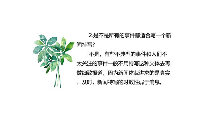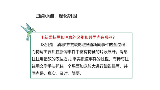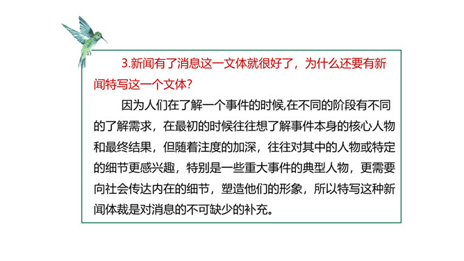 本堂课我们接触了一个新的新闻体裁一一新闻特写。不同于消息的概括简练,新闻特写注重对重大事件某一个场面做一个细致的描述,常常在记叙的基础上用较多的描写手法来对事件的某方面的细节展开。新闻特写不同于一般记叙文的地方是,和所有的新闻作品一样强调真实、及时,虽然有时用一点文学手法,但也是建立在事件真实的基础之上的。和消息不同的地方是,消息注重事件的对象、过程和结果,新闻特写注重事件的某一个横断面的展开,在时间上和空间上往往都是抓住一个点一个片段的形象画面来展开,起到局部强调的作用。所属专题:飞天凌空ppt。