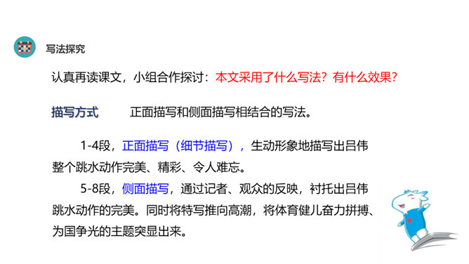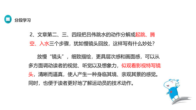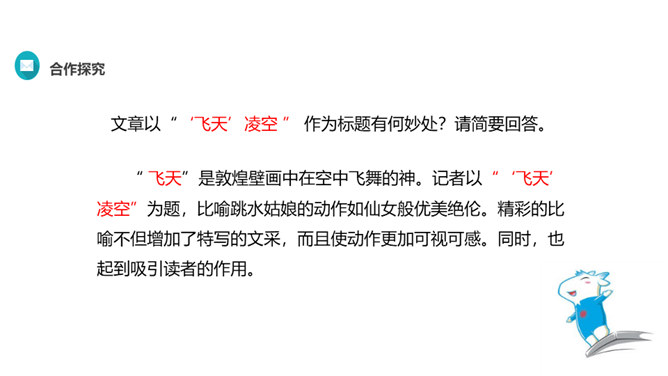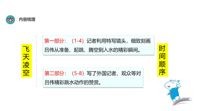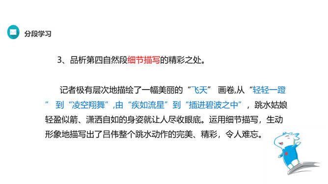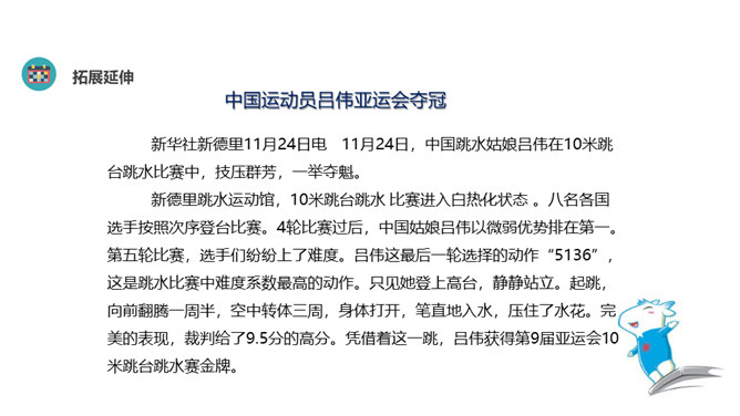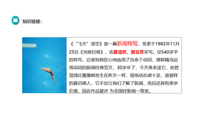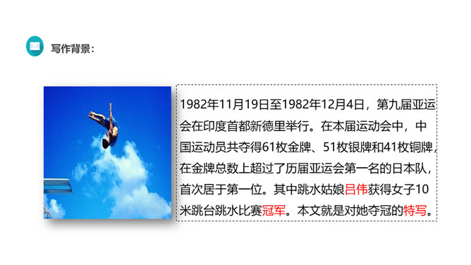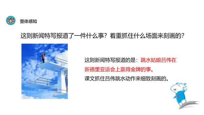 这则新闻特写报道了一件什么事?着重抓住什么场面来刻画的?这则新闻特写报道的是:跳水姑娘吕伟在新德里亚运会上赢得金牌的事。课文抓住吕伟跳水动作来细致刻画的。第一部分:(1-4)记者利用特写镜头,细致刻画吕伟从准备、起跳、腾空到入水的精彩瞬间。第二部分:(5-8)写了外国记者、观众等对吕伟精彩跳水动作的赞赏。文章以“‘飞天’凌空 ” 作为标题有何妙处?请简要回答。“ 飞天”是敦煌壁画中在空中飞舞的神。记者以“‘飞天’凌空”为题,比喻跳水姑娘的动作如仙女般优美绝伦。所属专题:飞天凌空ppt。