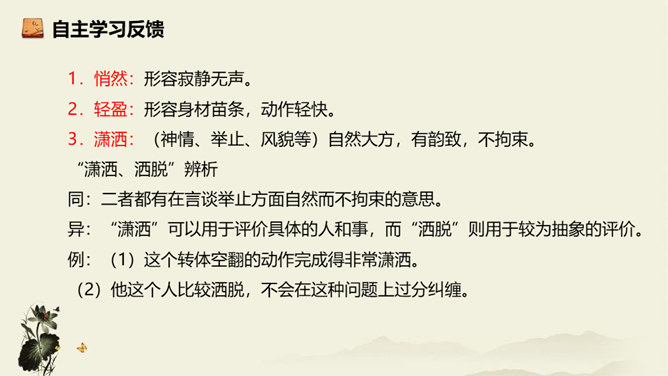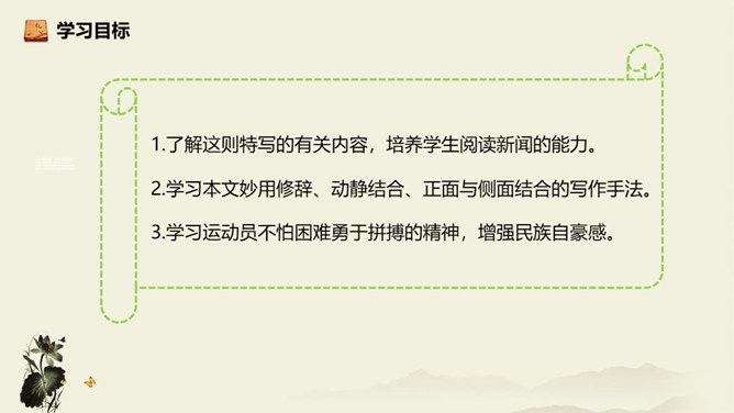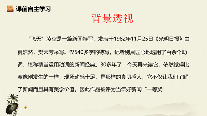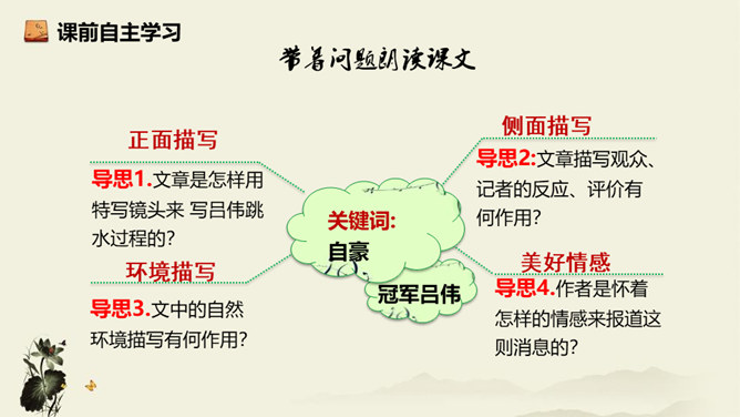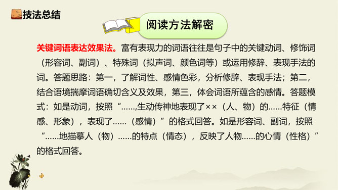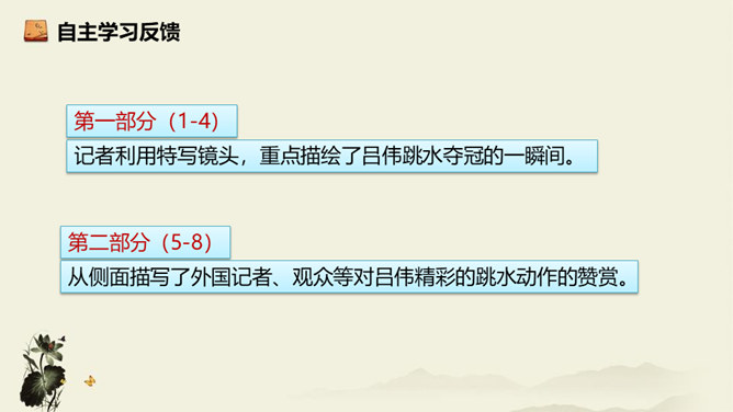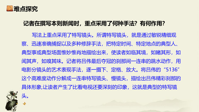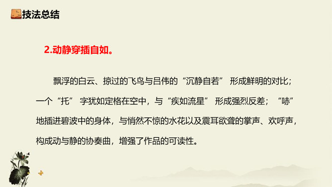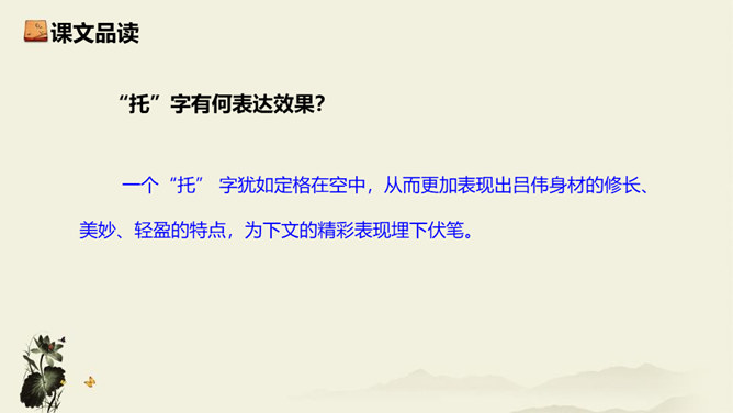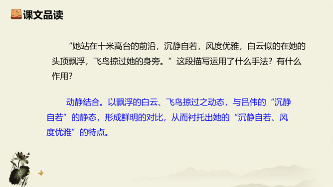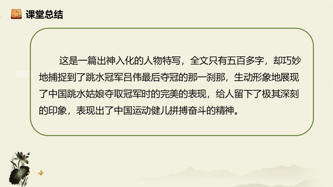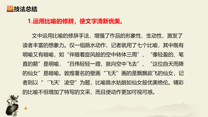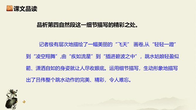 记者极有层次地描绘了一幅美丽的“飞天” 画卷,从“轻轻一蹬” 到“凌空翔舞”,由“疾如流星”到“插进碧波之中”,跳水姑娘轻盈似箭、潇洒自如的身姿就让人尽收眼底。运用细节描写,生动形象地描写出了吕伟整个跳水动作的完美、精彩,令人难忘。关键词语表达效果法。富有表现力的词语往往是句子中的关键动词、修饰词(形容词、副词)、特殊词(拟声词、颜色词等)或运用修辞、表现手法的词。答题思路:第一,了解词性、感情色彩,分析修辞、表现手法;第二,结合语境揣摩词语确切含义及效果,第三,体会词语所蕴含的感情。所属专题:飞天凌空ppt。