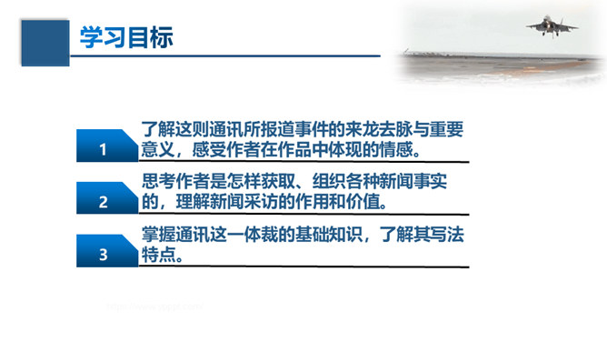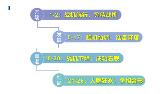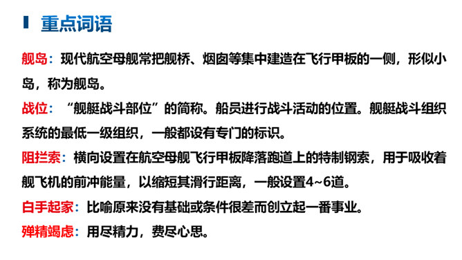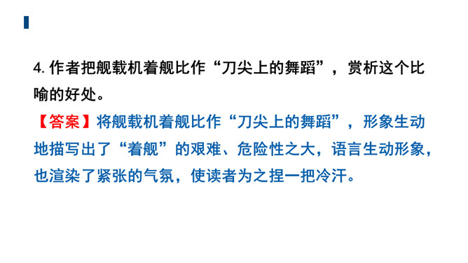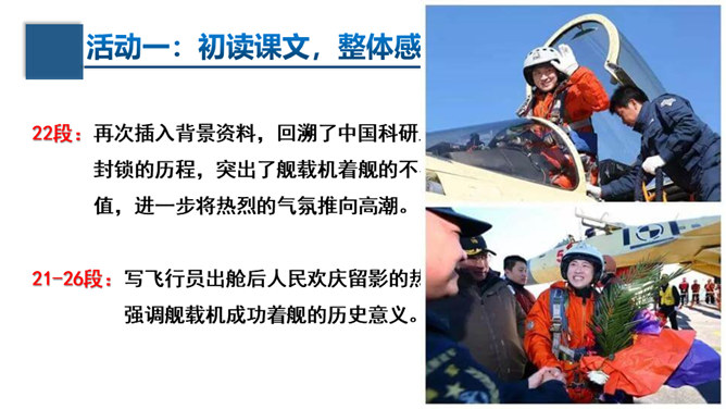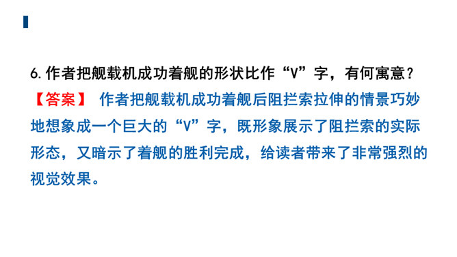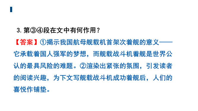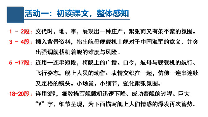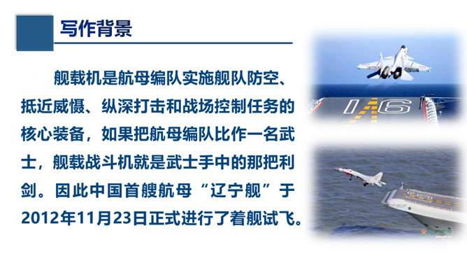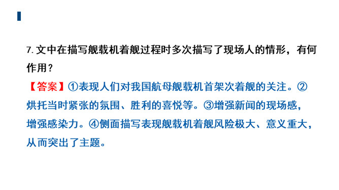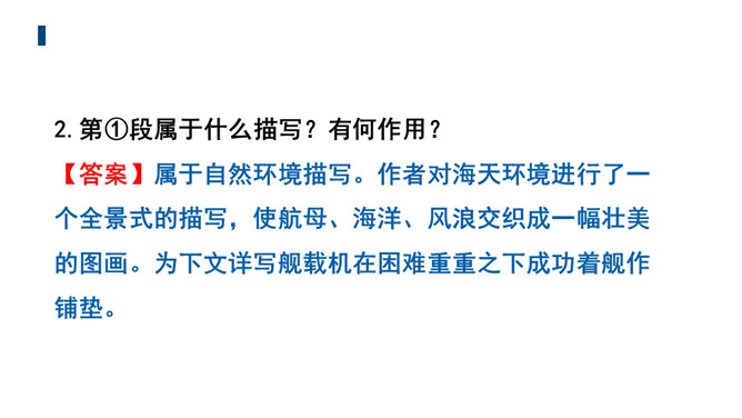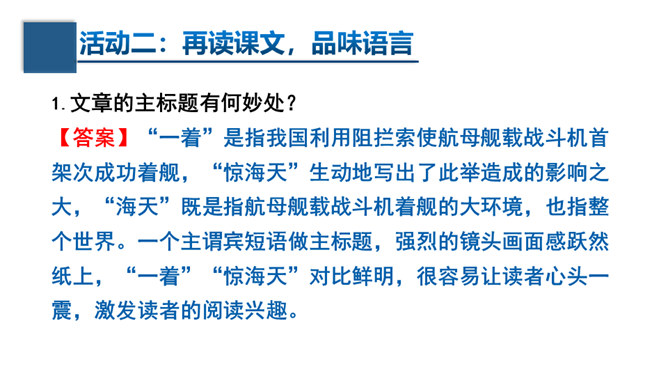 文章的主标题有何妙处?“一着”是指我国利用阻拦索使航母舰载战斗机首架次成功着舰,“惊海天”生动地写出了此举造成的影响之大,“海天”既是指航母舰载战斗机着舰的大环境,也指整个世界。一个主谓宾短语做主标题,强烈的镜头画面感跃然纸上,“一着”“惊海天”对比鲜明,很容易让读者心头一震,激发读者的阅读兴趣。第①段属于什么描写?有何作用?属于自然环境描写。作者对海天环境进行了一个全景式的描写,使航母、海洋、风浪交织成一幅壮美的图画。为下文详写舰载机在困难重重之下成功着舰作铺垫。所属专题:一着惊海天ppt。