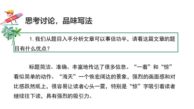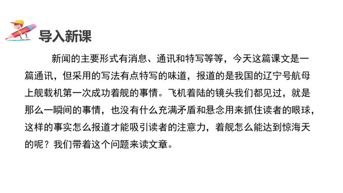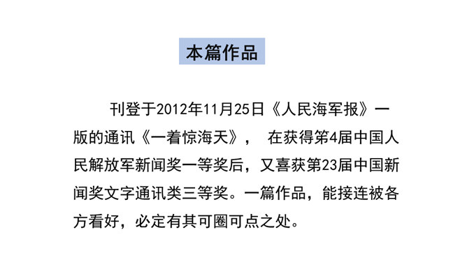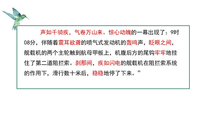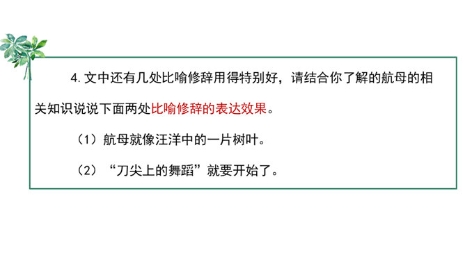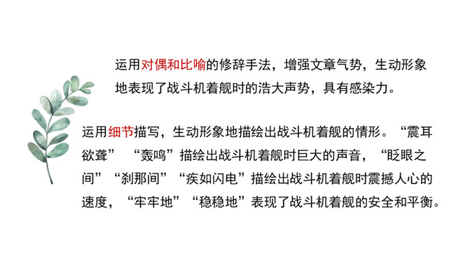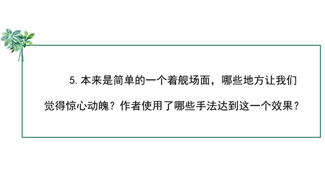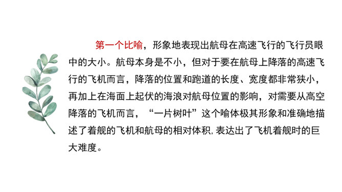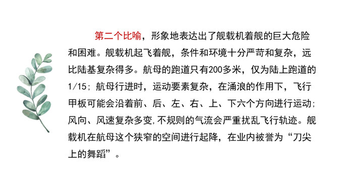 第一个比喻,形象地表现出航母在高速飞行的飞行员眼中的大小。航母本身是不小,但对于要在航母上降落的高速飞行的飞机而言,降落的位置和跑道的长度、宽度都非常狭小,再加上在海面上起伏的海浪对航母位置的影响,对需要从高空降落的飞机而言,“一片树叶”这个喻体极其形象和准确地描述了着舰的飞机和航母的相对体积,表达出了飞机着舰时的巨大难度。第二个比喻,形象地表达出了舰载机着舰的巨大危险和困难。舰载机起飞着舰,条件和环境十分严苛和复杂,远比陆基复杂得多。所属专题:一着惊海天ppt。