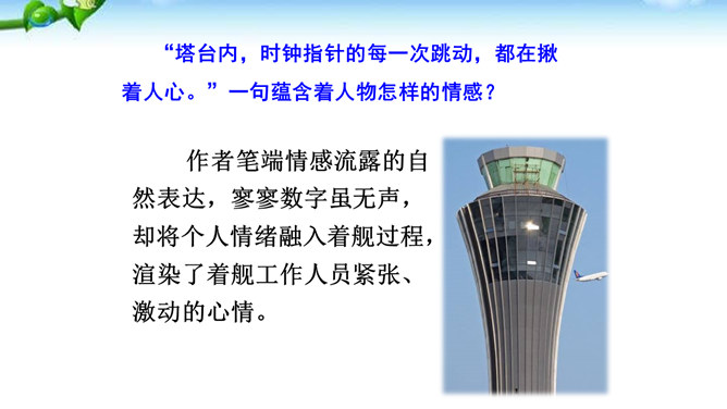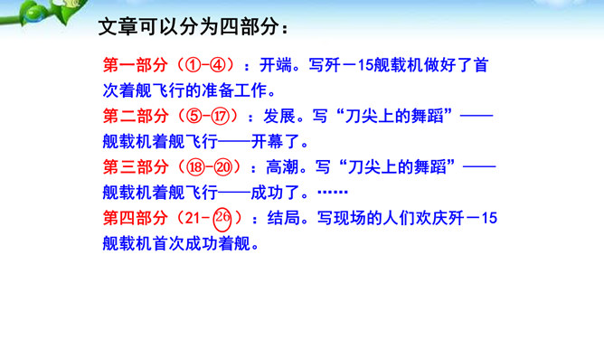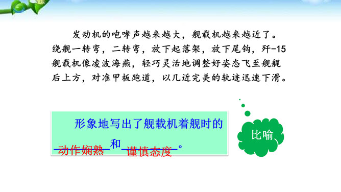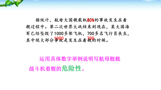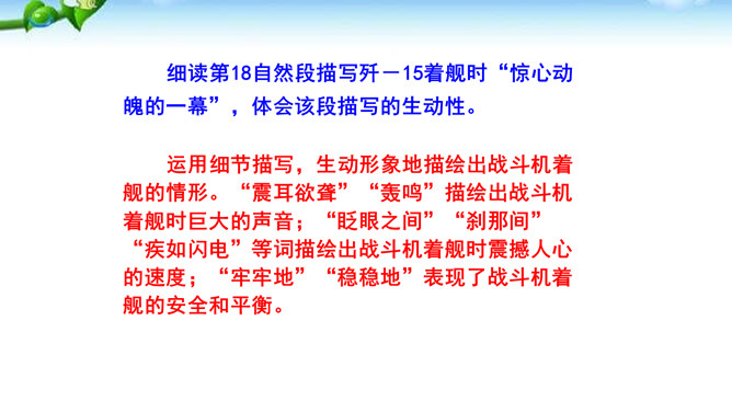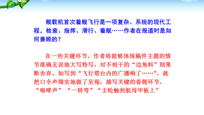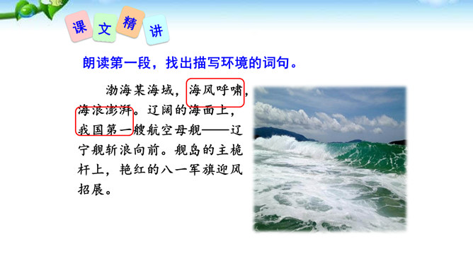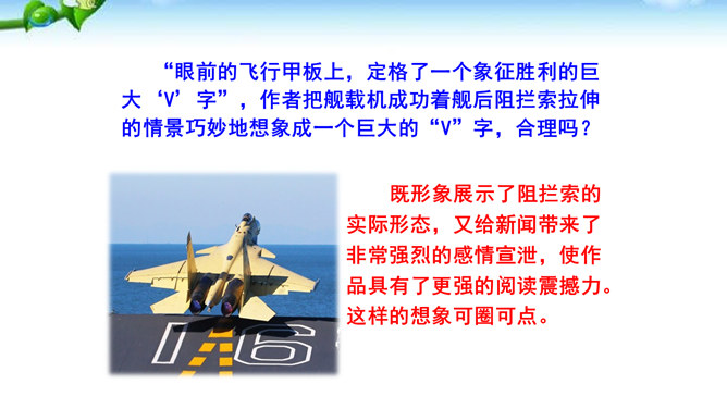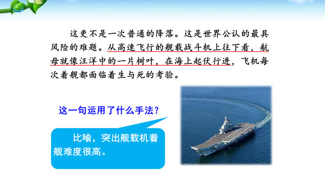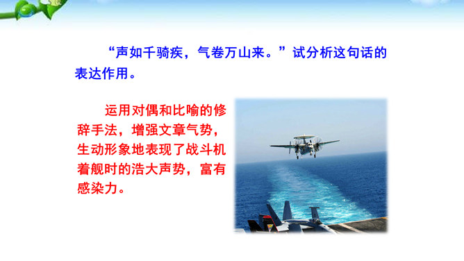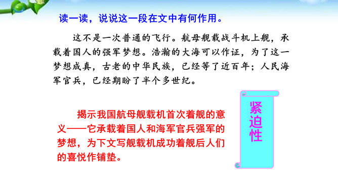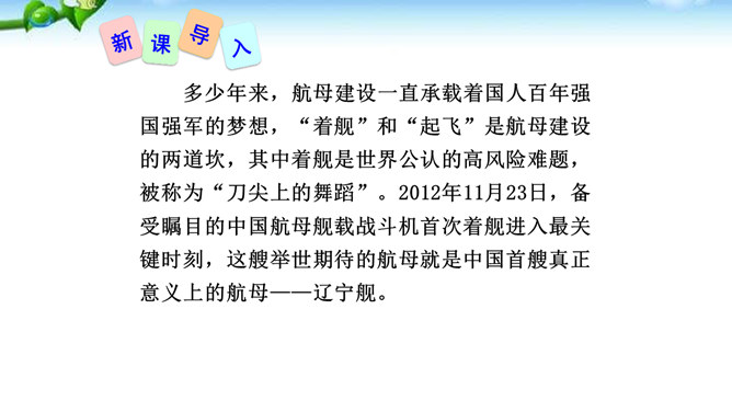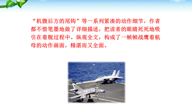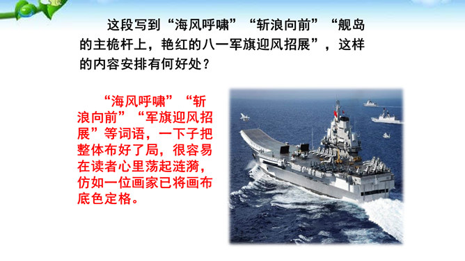 多少年来,航母建设一直承载着国人百年强国强军的梦想,“着舰”和“起飞”是航母建设的两道坎,其中着舰是世界公认的高风险难题,被称为“刀尖上的舞蹈”。2012年11月23日,备受瞩目的中国航母舰载战斗机首次着舰进入最关键时刻,这艘举世期待的航母就是中国首艘真正意义上的航母——辽宁舰。这段写到“海风呼啸”“斩浪向前”“舰岛的主桅杆上,艳红的八一军旗迎风招展”,这样的内容安排有何好处?“海风呼啸”“斩浪向前”“军旗迎风招展”等词语,一下子把整体布好了局,很容易在读者心里荡起涟漪,仿如一位画家已将画布底色定格。所属专题:一着惊海天ppt。