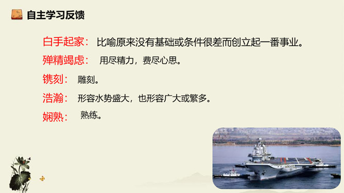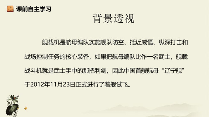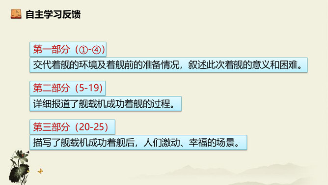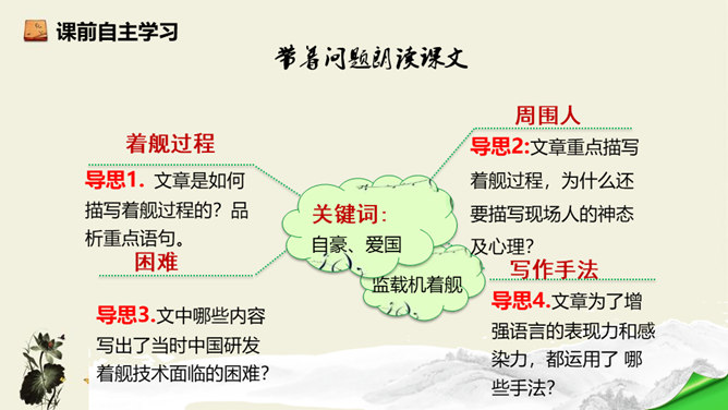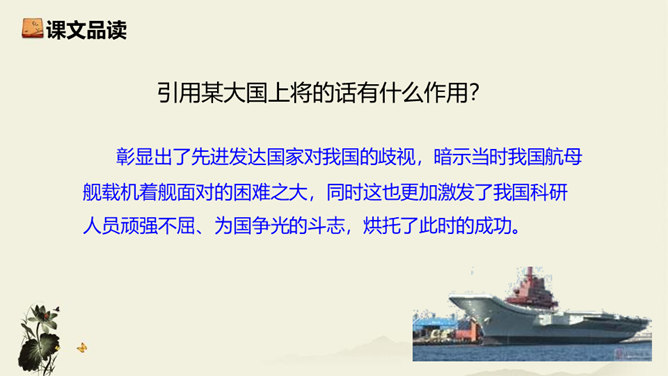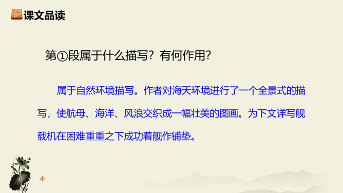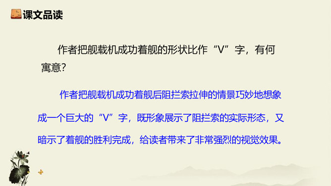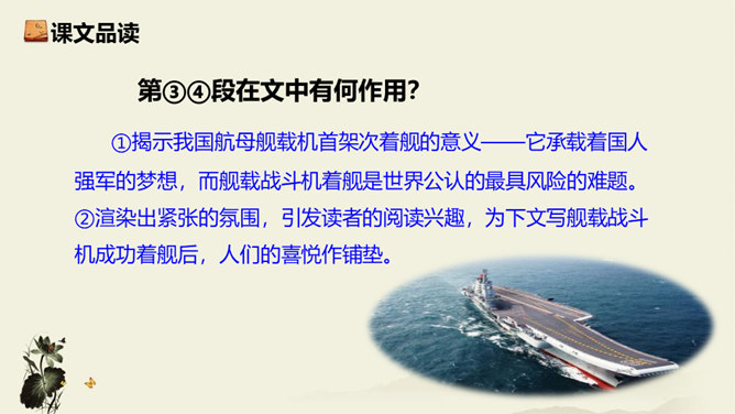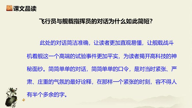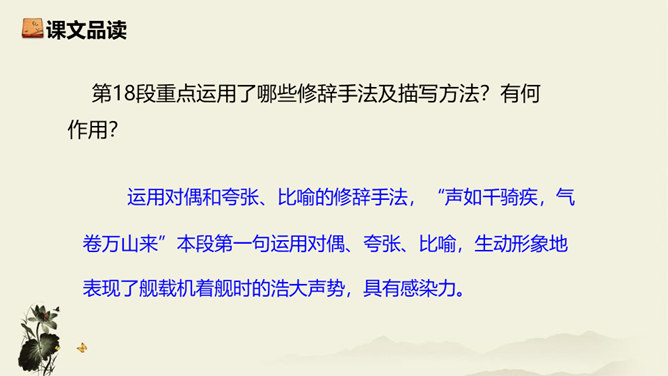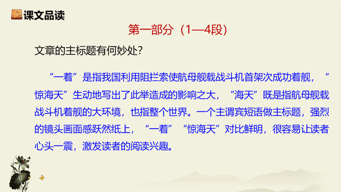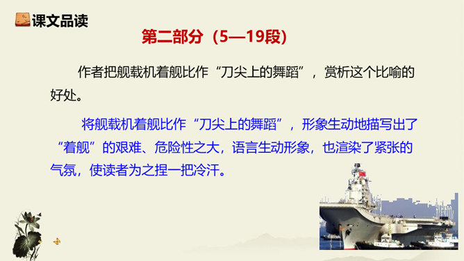 飞行员与舰载指挥员的对话为什么如此简短?此处的对话简洁准确,让读者更加直观易懂,让舰载战斗机着舰这一个高端的试验事件更加平实,为读者揭开高科技的神秘面纱。简简单单的对话,简简单单的口令,是对当时紧张、严肃、庄重的气氛的最好诠释,在那样一个紧张的时刻,容不得人有半个多余的字。第18段重点运用了哪些修辞手法及描写方法?有何作用? 运用对偶和夸张、比喻的修辞手法,“声如千骑疾,气卷万山来”本段第一句运用对偶、夸张、比喻,生动形象地表现了舰载机着舰时的浩大声势,具有感染力。所属专题:一着惊海天ppt。