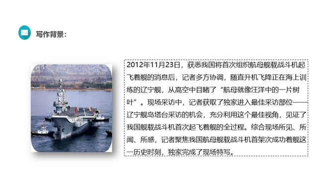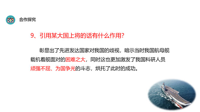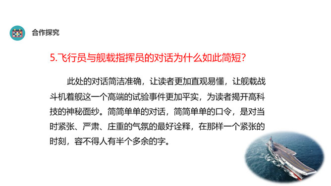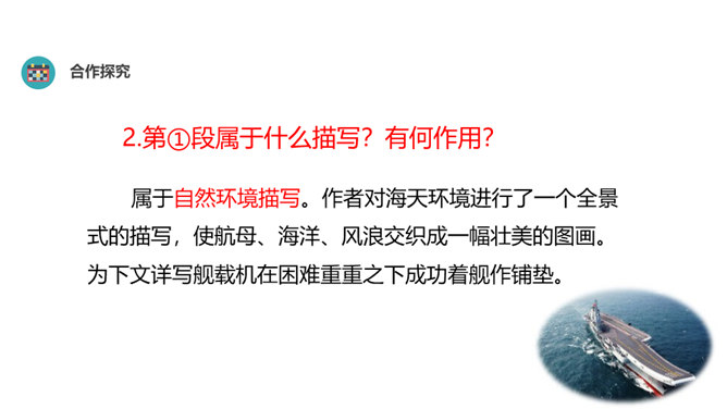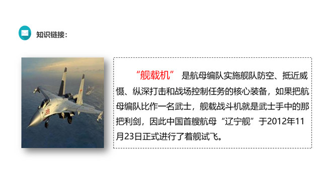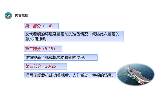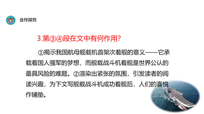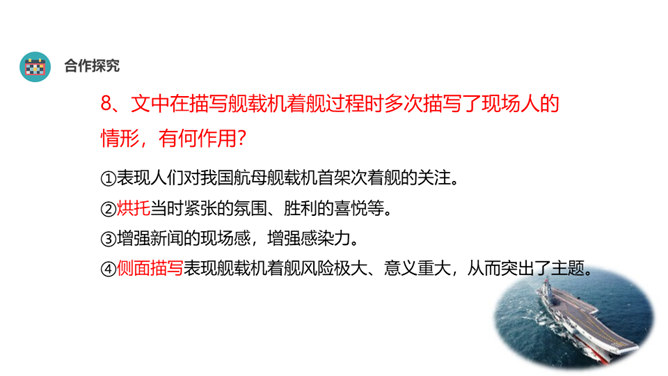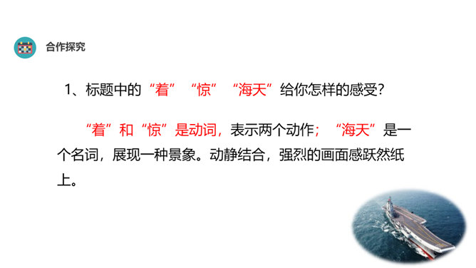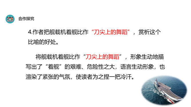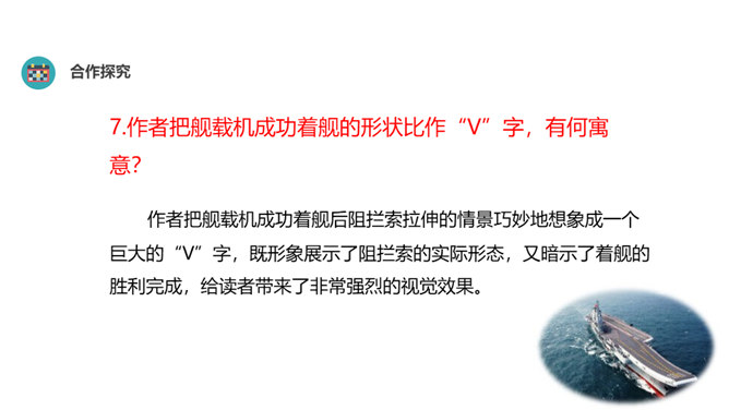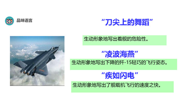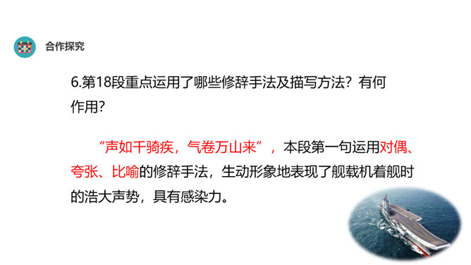 “着”和“惊”是动词,表示两个动作;“海天”是一个名词,展现一种景象。动静结合,强烈的画面感跃然纸上。第18段重点运用了哪些修辞手法及描写方法?有何作用? “声如千骑疾,气卷万山来”,本段第一句运用对偶、夸张、比喻的修辞手法,生动形象地表现了舰载机着舰时的浩大声势,具有感染力。作者把舰载机成功着舰的形状比作“V”字,有何寓意? 作者把舰载机成功着舰后阻拦索拉伸的情景巧妙地想象成一个巨大的“V”字,既形象展示了阻拦索的实际形态,又暗示了着舰的胜利完成,给读者带来了非常强烈的视觉效果。所属专题:一着惊海天ppt。