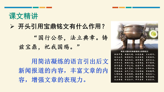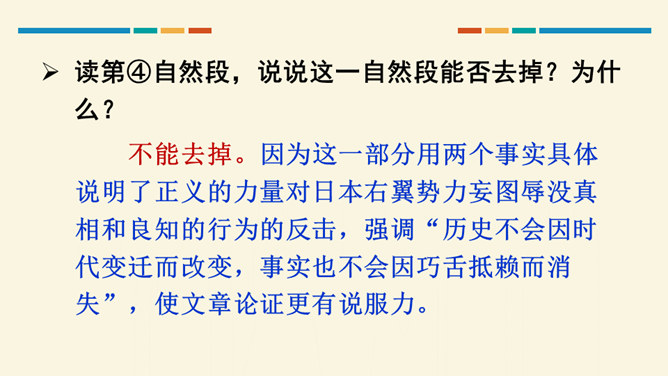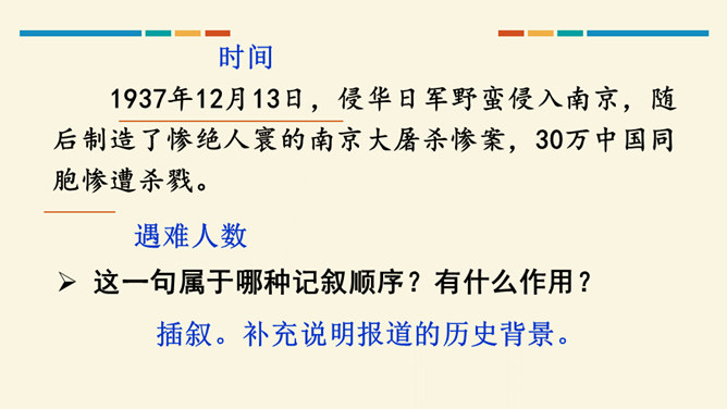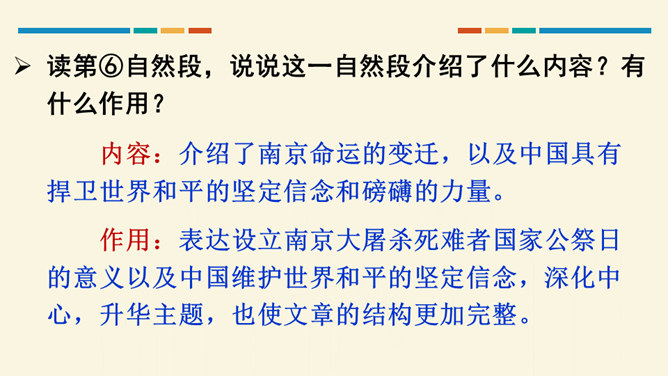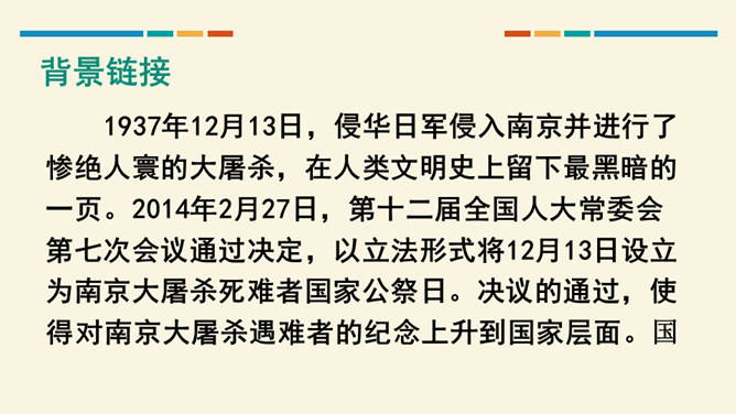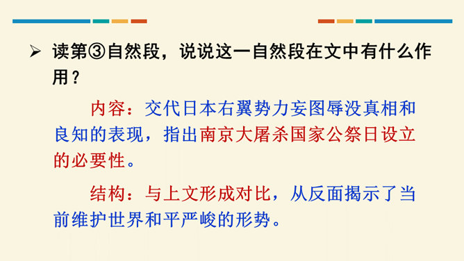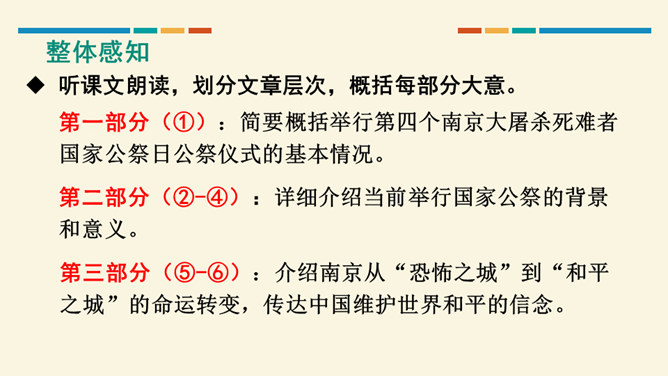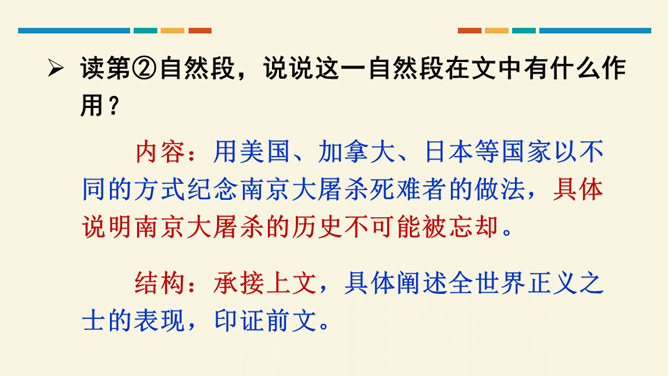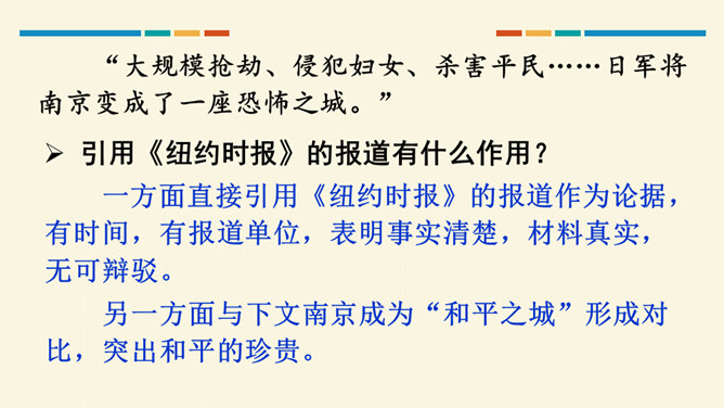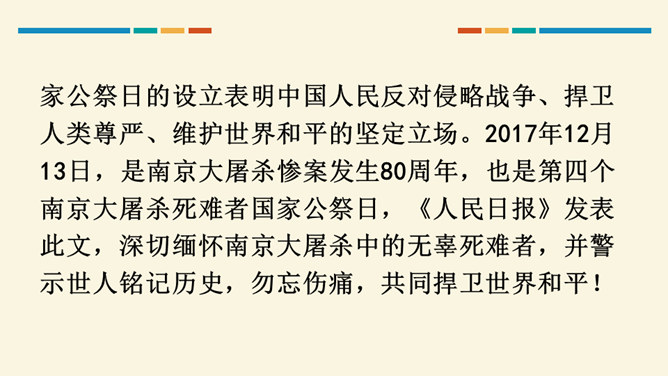 这篇文章开篇用概括性的语言简述举行第四次南京大屠杀死难者国家公祭仪式的基本情况,同时提出观点,即中国人民永远牢记南京大屠杀历史,与全世界爱好和平与正义的人们共同维护和平;然后从正反两方面展开论述,正面以美国、加拿大等全世界正义之士对南京大屠杀死难者的纪念为例,反面以日本右翼势力妄图否认历史的丑态为例,说明正义必将战胜邪恶,历史事实不会因巧舌抵赖而消失;最后以南京命运的变迁收束,表明中国铭记历史、缅怀先烈、珍爱和平、开创未来的信念和力量。全文思想深刻,针对性强,有“警钟”和“宣言”的双重作用。所属专题:国行公祭为佑世界和平ppt。