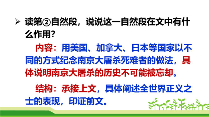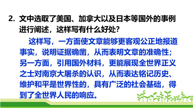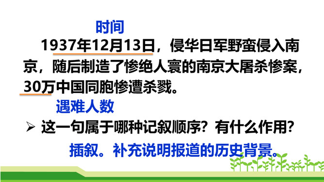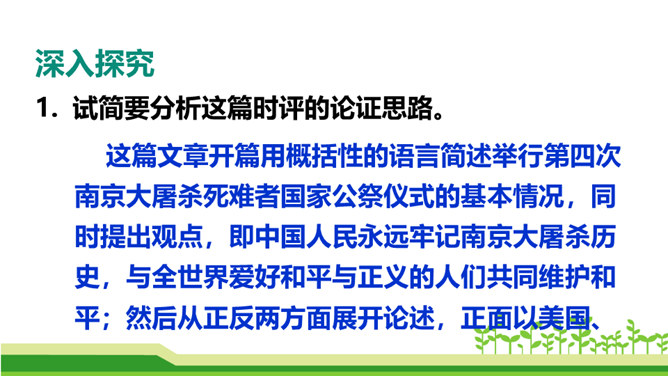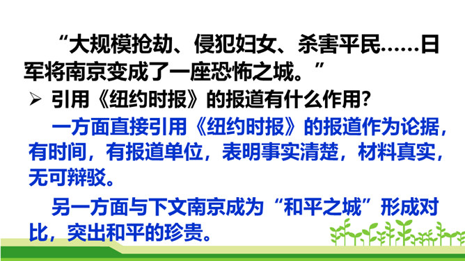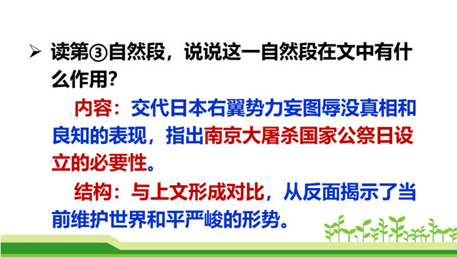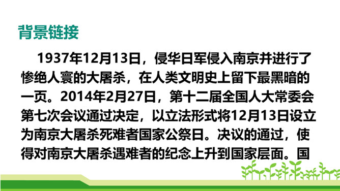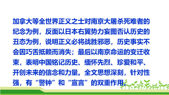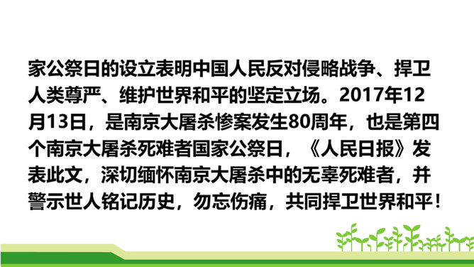 阅读本文后,你有怎样的体会?铭记历史,才能继往开来。遗忘历史的民族不可能有凝聚力,也不可能真正从灾难中吸取教训,并开启崭新的时代。在黑暗的南京大屠杀中,我们有30万同胞惨遭杀戮,只有铭记这样血的历史和教训,我们才能有志气不让历史重演。和平才是人间正道。今天的繁荣不代表永久繁荣,今天的和平更不代表永久和平。面对日本右翼势力丑态百出的表演,我们要时刻保持清醒,站在国家的高度,从灾难中吸取教训,积淀民族记忆,团结全世界维护和平的正义之士,共同维护世界和平。所属专题:国行公祭为佑世界和平ppt。