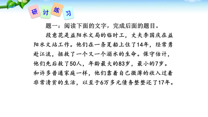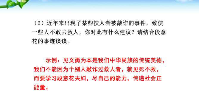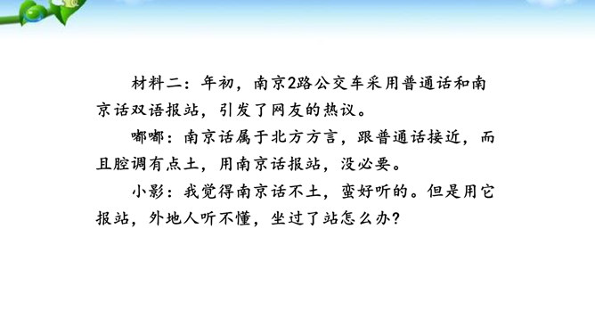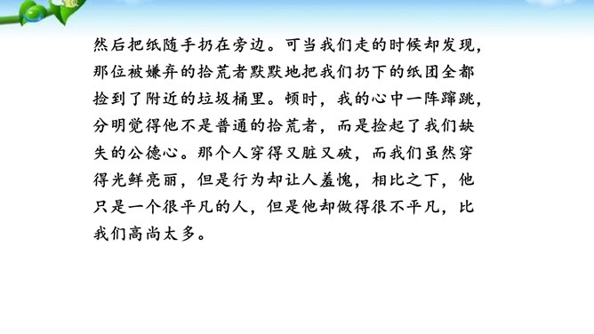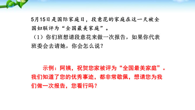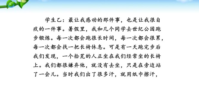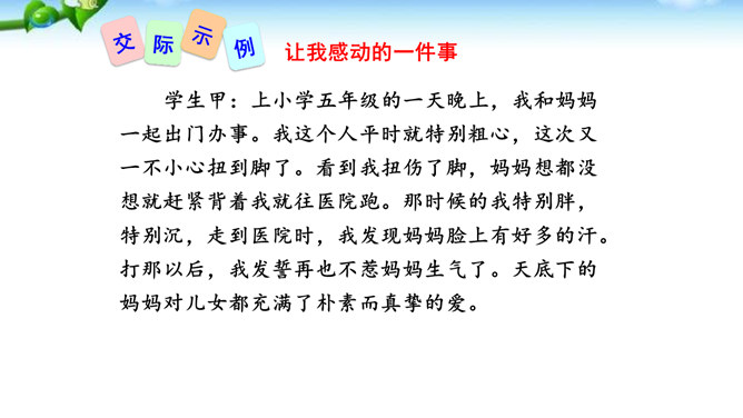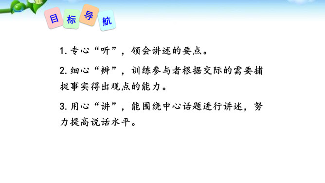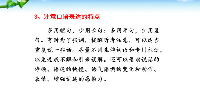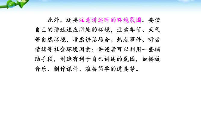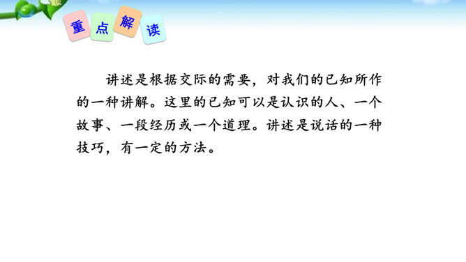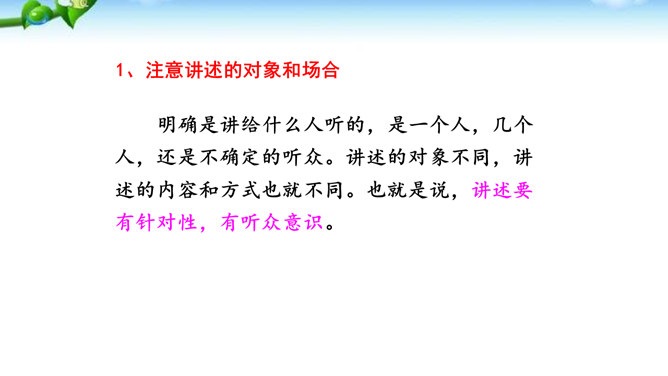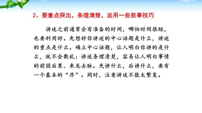 讲述之前通常会有准备的时间,哪怕时间很短,也要利用好。先想好你讲述的中心话题是什么,讲述的重点是什么。确立中心话题,让人明白你讲的是什么,就不会散乱;讲述条理清楚,容易让人明白事情的前因后果、来龙去脉。先讲什么,后讲什么,要有一个基本的“序”。同时,注意讲述不能太繁复。多用短句,少用长句;多用单句,少用复句。有时为了强调,提醒听者注意,可以适当重复说一些话。尽量不用生僻词语和专门术语,以免造成不解和引来误解。还可以借助说话的停顿、语速的快慢、语气语调的变化和动作、表情,增强讲述的感染力。所属专题:讲述ppt。