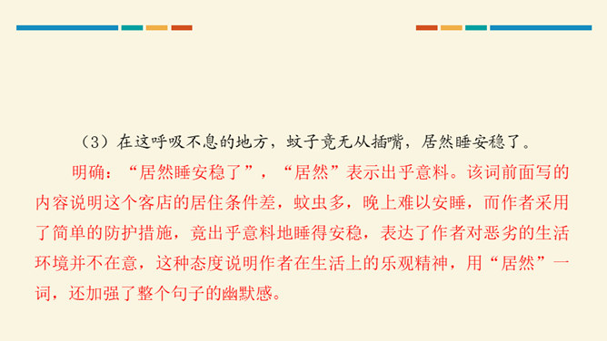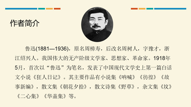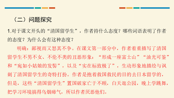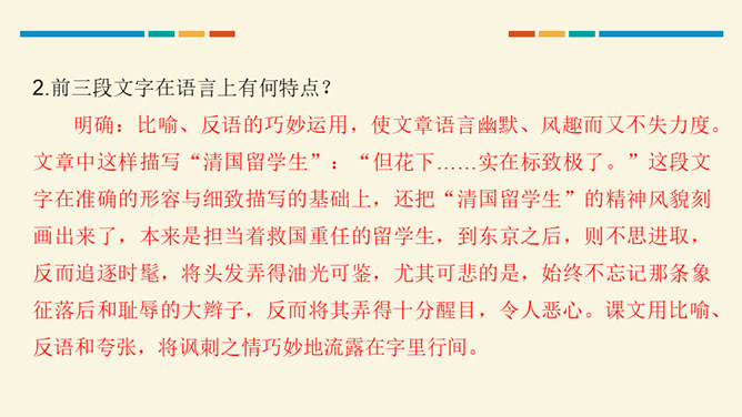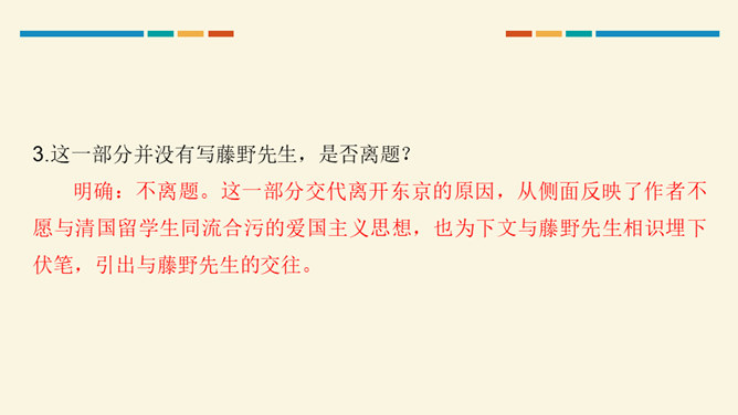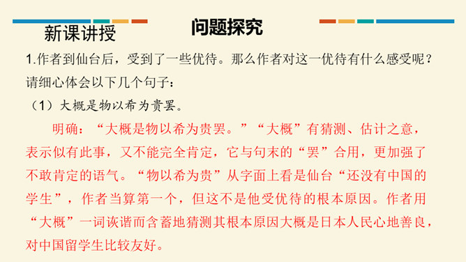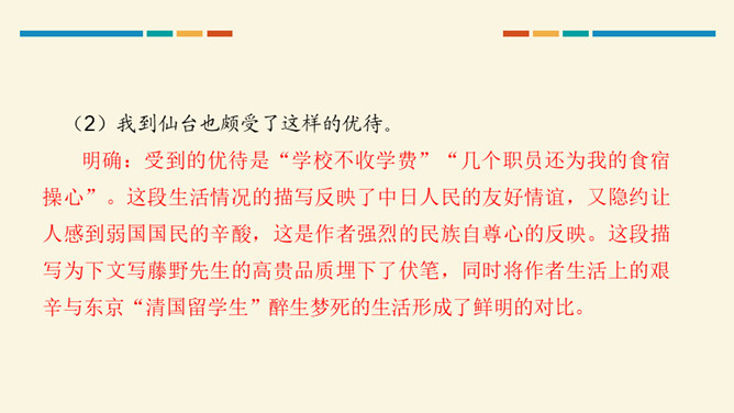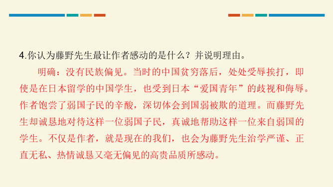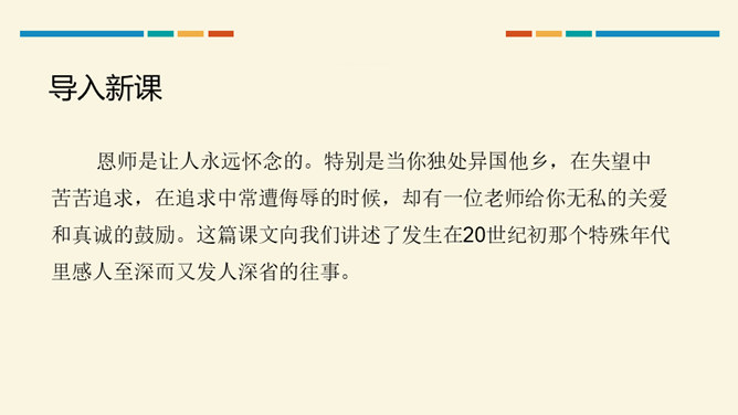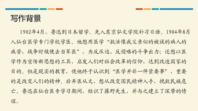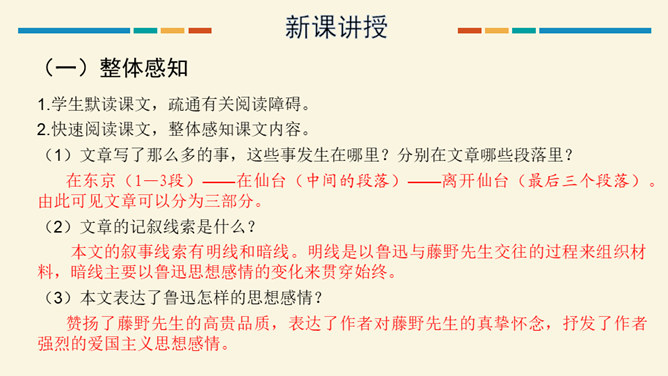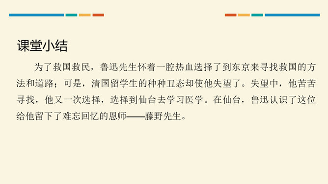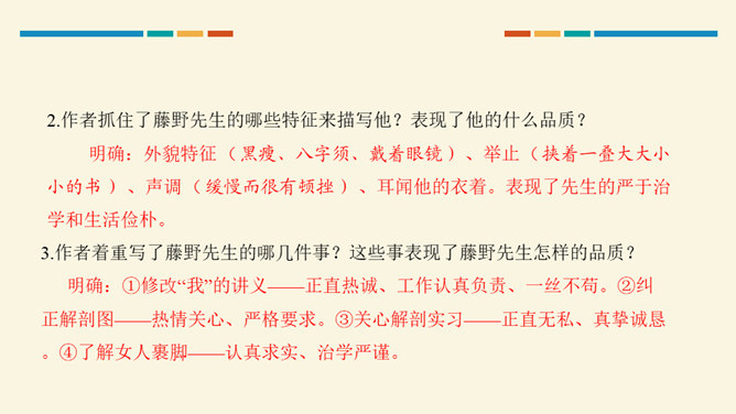 恩师是让人永远怀念的。特别是当你独处异国他乡,在失望中苦苦追求,在追求中常遭侮辱的时候,却有一位老师给你无私的关爱和真诚的鼓励。这篇课文向我们讲述了发生在20世纪初那个特殊年代里感人至深而又发人深省的往事。文章的记叙线索是什么?本文的叙事线索有明线和暗线。明线是以鲁迅与藤野先生交往的过程来组织材料,暗线主要以鲁迅思想感情的变化来贯穿始终。本文表达了鲁迅怎样的思想感情?赞扬了藤野先生的高贵品质,表达了作者对藤野先生的真挚怀念,抒发了作者强烈的爱国主义思想感情。所属专题:藤野先生ppt。