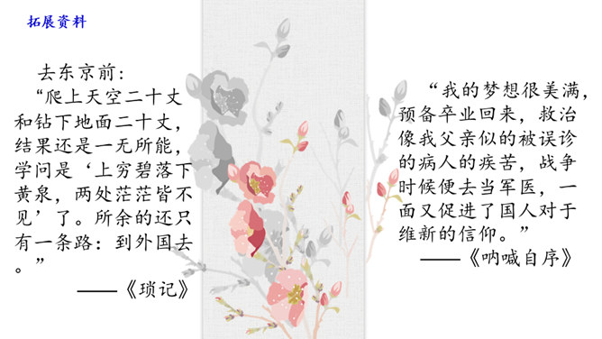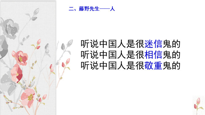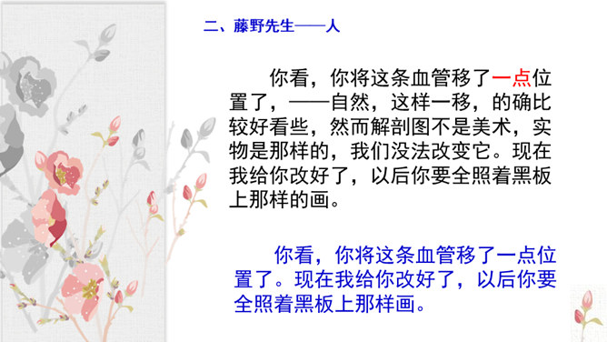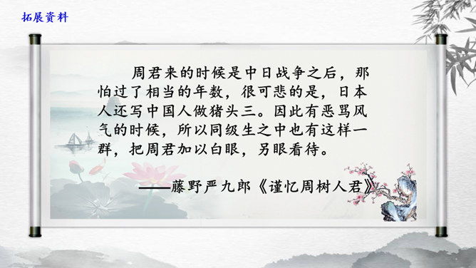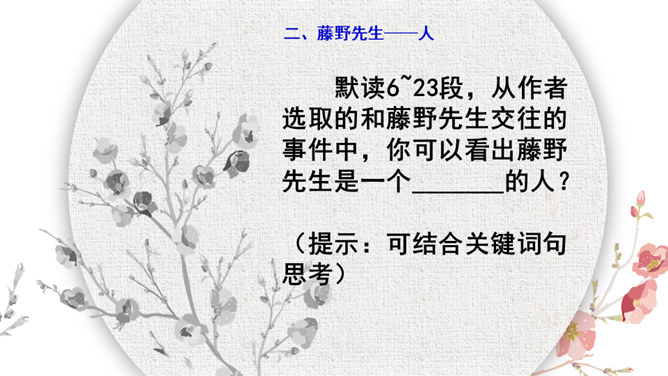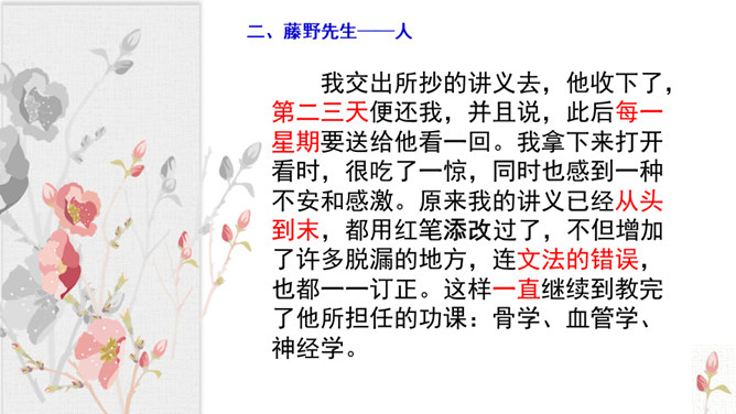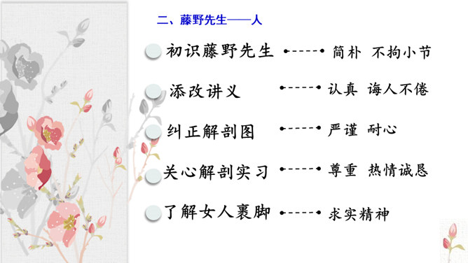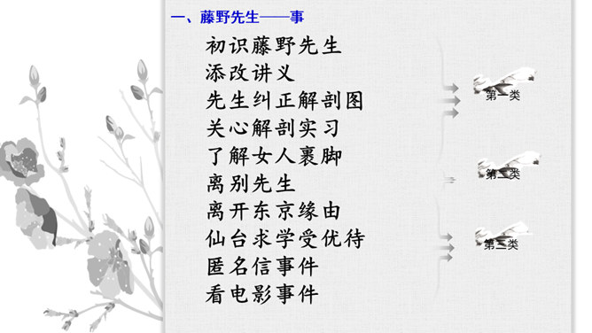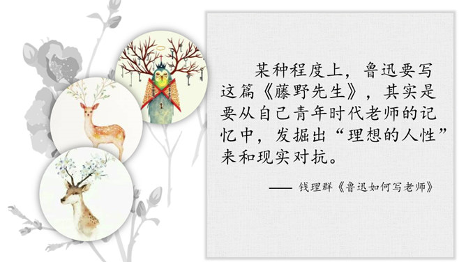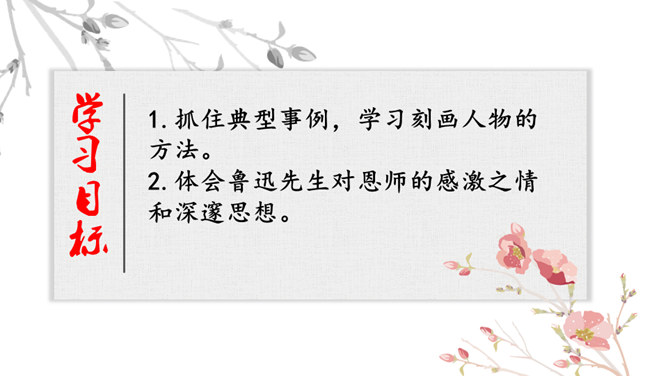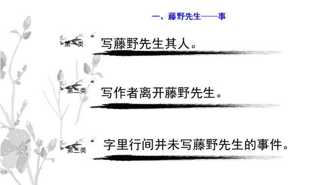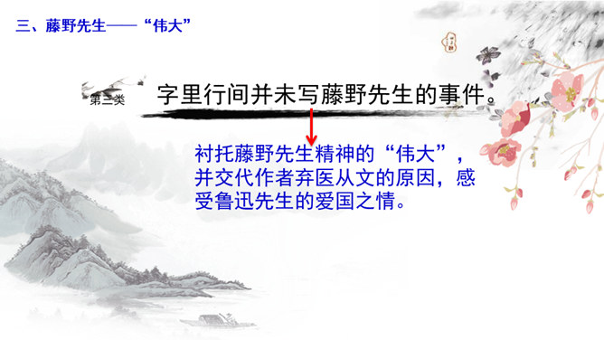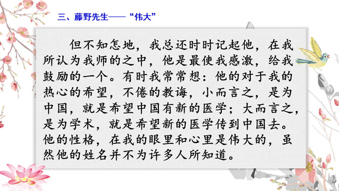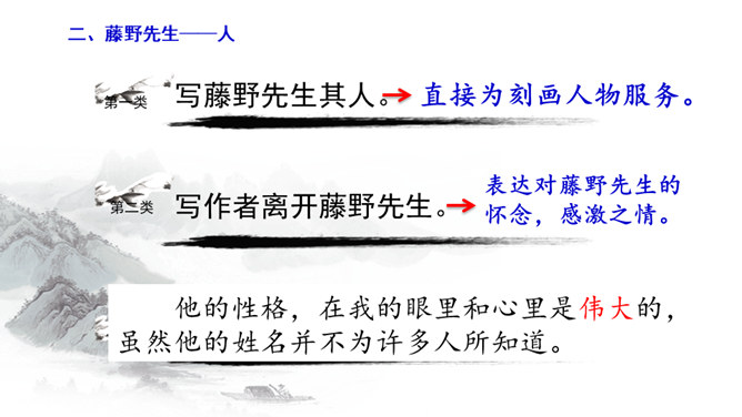 学习目标:1.抓住典型事例,学习刻画人物的方法。2.体会鲁迅先生对恩师的感激之情和深邃思想。第一类写藤野先生其人。第二类写作者离开藤野先生。第三类字里行间并未写藤野先生的事件。默读6~23段,从作者选取的和藤野先生交往的事件中,你可以看出藤野先生是一个怎样的人?衬托藤野先生精神的“伟大”,并交代作者弃医从文的原因,感受鲁迅先生的爱国之情。所属专题:藤野先生ppt。