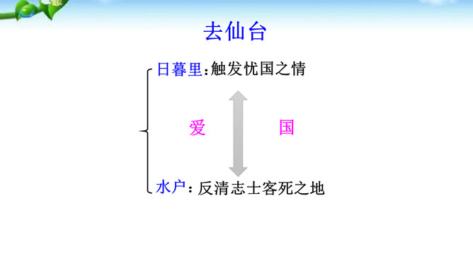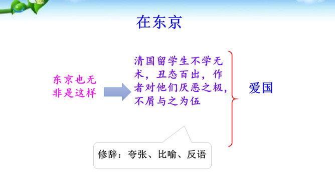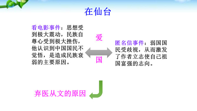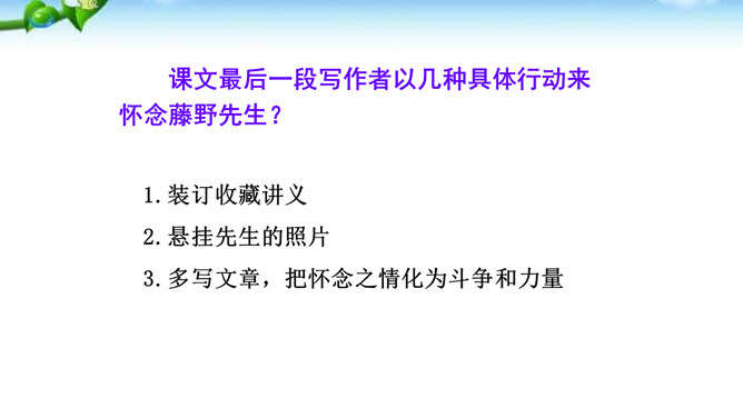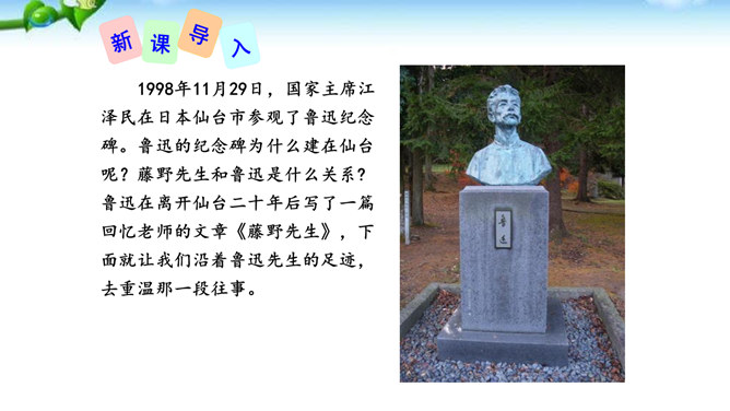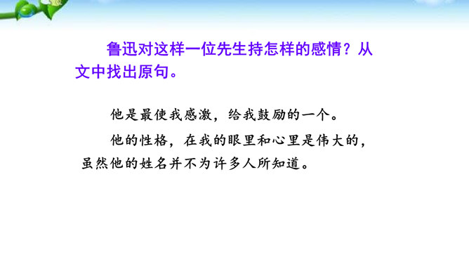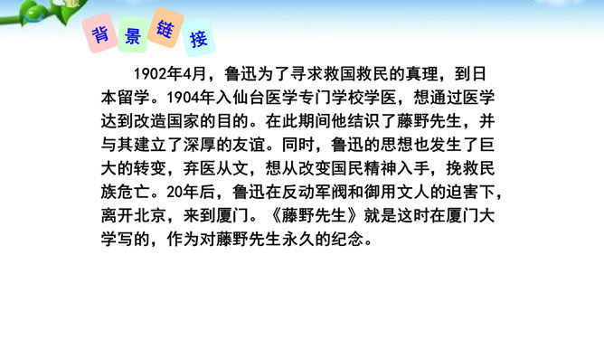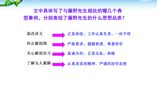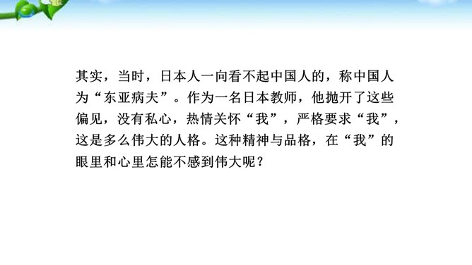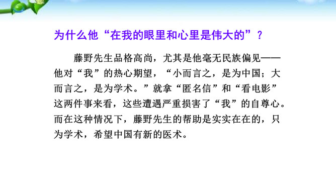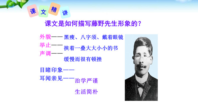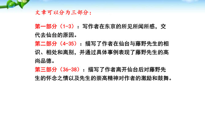 第一部分(1-3):写作者在东京的所见所闻所感,交代去仙台的原因。第二部分(4-35):描写了作者在仙台与藤野先生的相识、相处和离别,并通过具体事例表现了藤野先生的高尚品德。第三部分(36-38):描写了作者离开仙台后对藤野先生的怀念之情以及先生的崇高精神对作者的激励和鼓舞。鲁迅对这样一位先生持怎样的感情?从文中找出原句。与句末的语气“罢”合用,以诙谐的口气猜测在仙台受“优待”的原因,以“物以希为贵”为喻,表现出一个弱国国民的辛酸和强烈的民族自尊心。所属专题:藤野先生ppt。