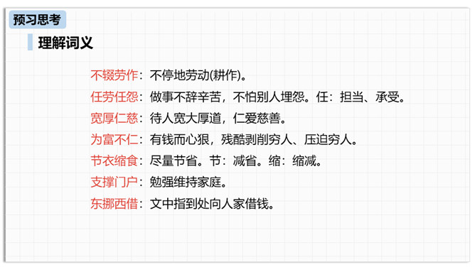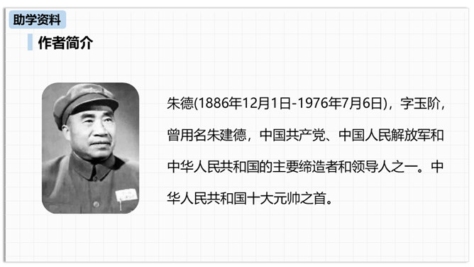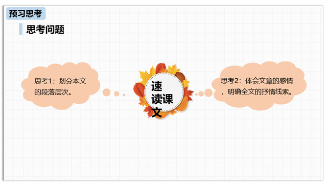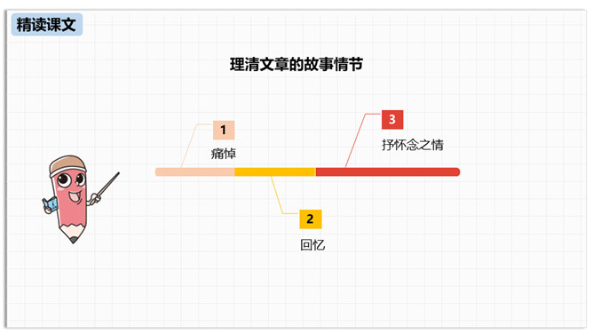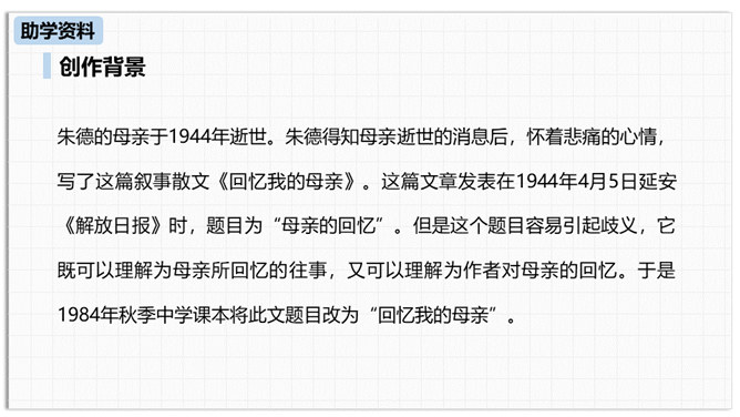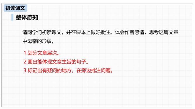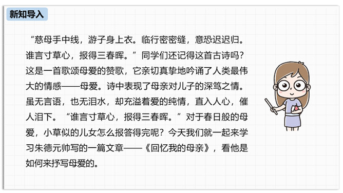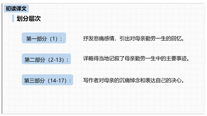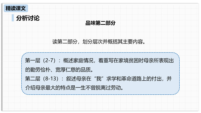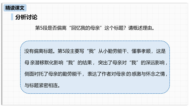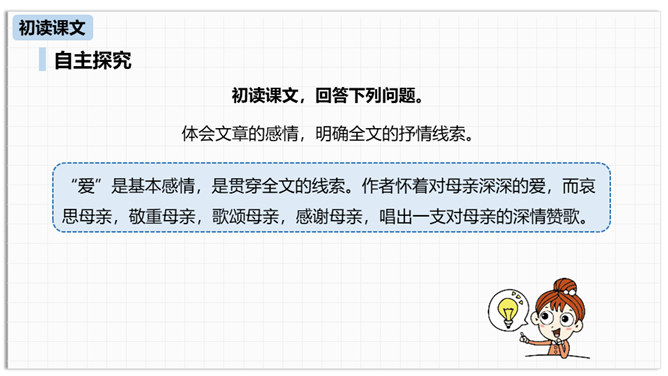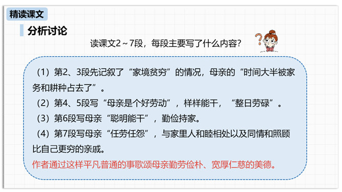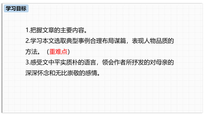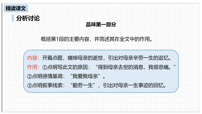 体会文章的感情,明确全文的抒情线索。“爱”是基本感情,是贯穿全文的线索。作者怀着对母亲深深的爱,而哀思母亲,敬重母亲,歌颂母亲,感谢母亲,唱出一支对母亲的深情赞歌。概括第1段的主要内容,并简述其在全文中的作用。内容:开篇点题,痛悼母亲的逝世,引出对母亲辛劳一生的追忆。作用:①点明写此文的原因:“得到母亲去世的消息,我很悲痛。”②点明感情基调:“我爱我母亲”。③点明叙事线索:“勤劳一生”,引出对母亲一生事迹的回忆。朗读技巧:语速缓慢,语调低沉,读出悲痛与挚爱之情。所属专题:回忆我的母亲ppt。