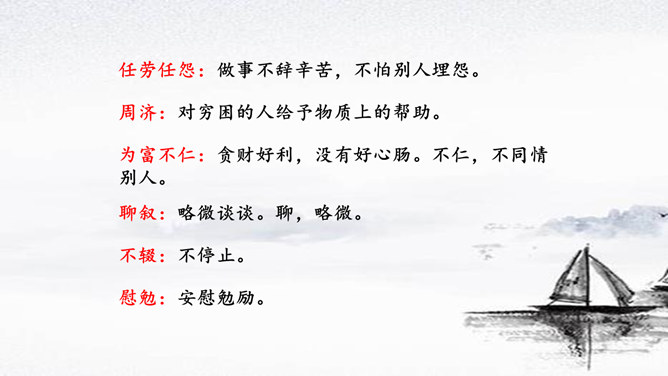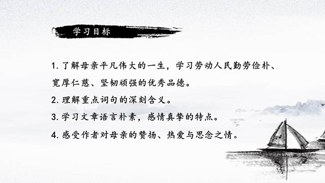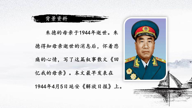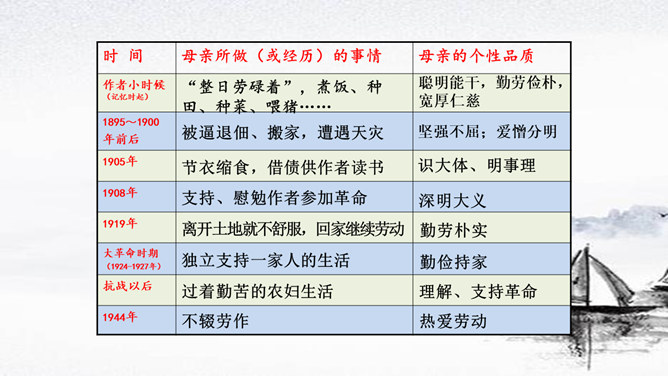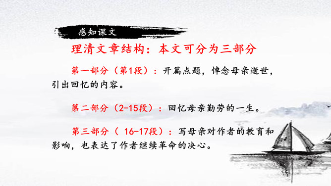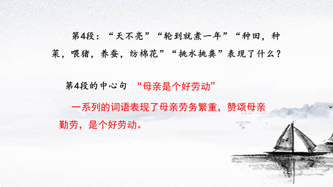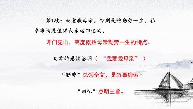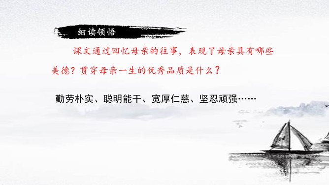 母亲一生值得叙述的事迹很多,本文选择了哪些材料?表现了母亲的什么品质?文章按照时间顺序选取八件最能表现普通劳动妇女的本质特征的事情来写。课文通过回忆母亲的往事,表现了母亲具有哪些美德?贯穿母亲一生的优秀品质是什么?第14、15段在前文叙述的基础上,用抒情的笔调说明母亲所给予的宝贵财产,在自己几十年的革命斗争历程中产生的巨大作用和深刻影响,并说明了母亲“值得我永远回忆”的原因,也与开头呼应,自然引出下文。以让人震惊的事实“母亲生我前一分钟还在灶上煮饭”,来说明母亲最大的特点是一生不曾脱离劳动。所属专题:回忆我的母亲ppt。