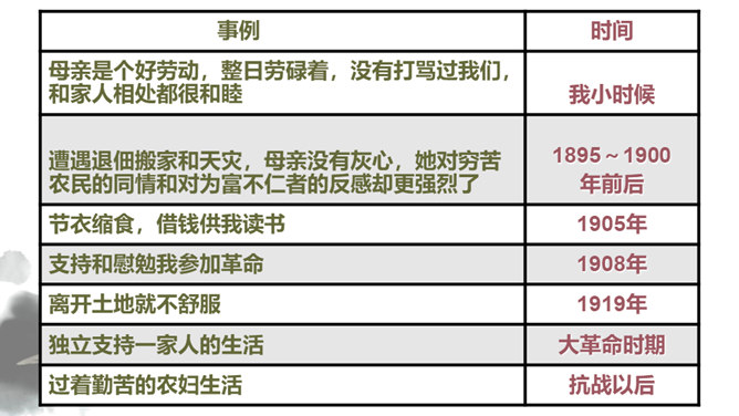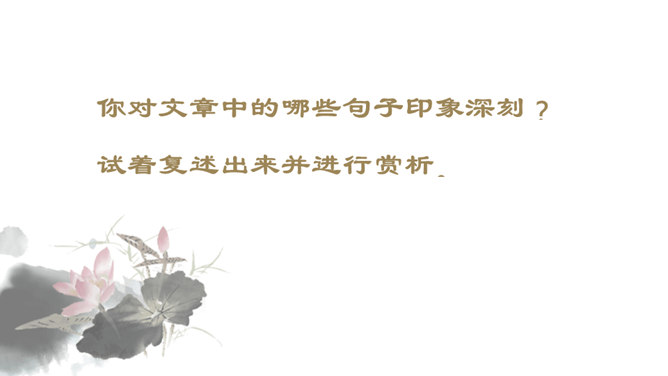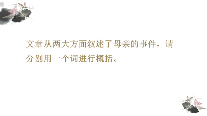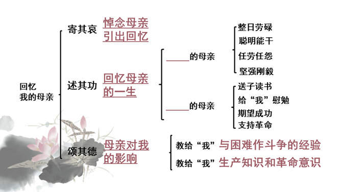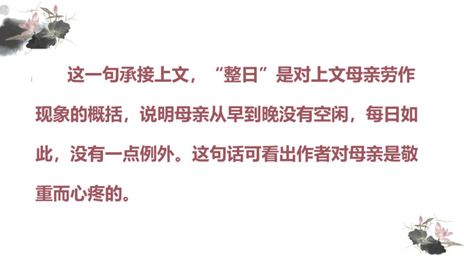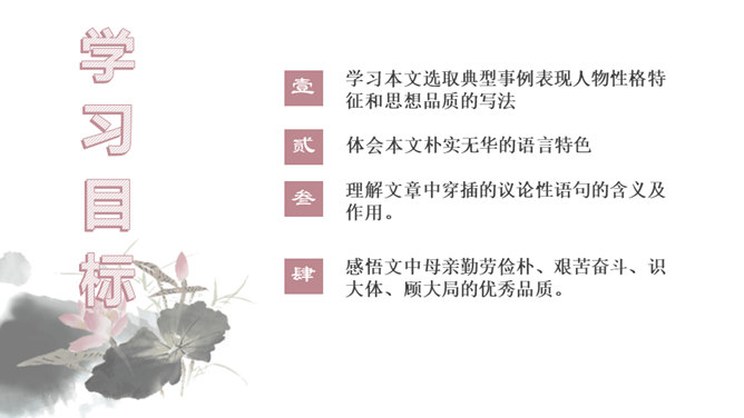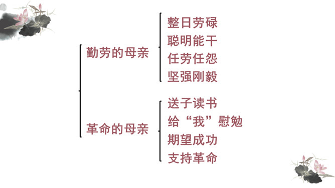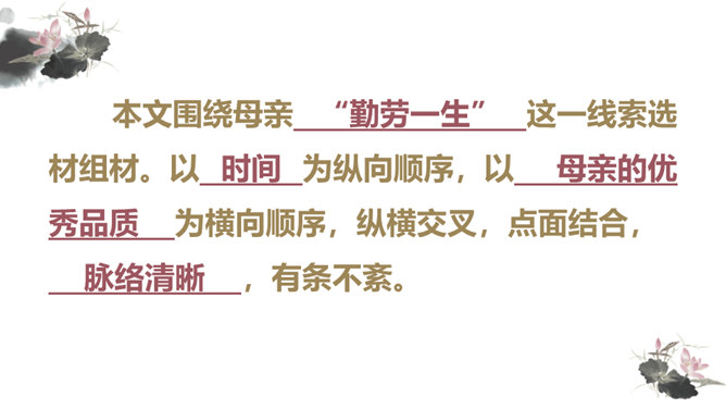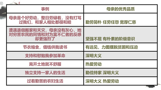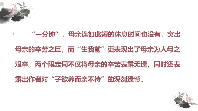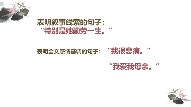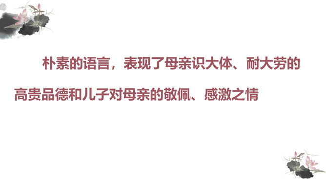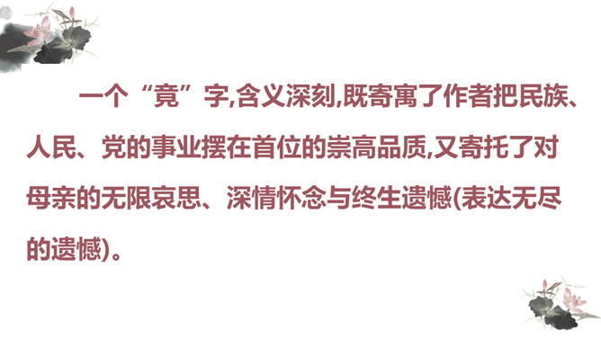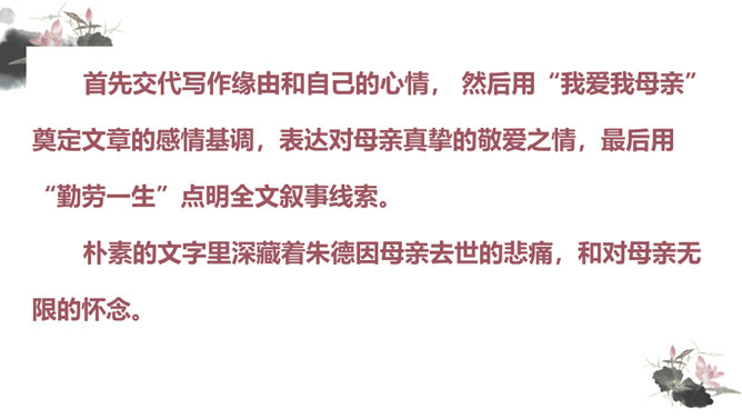 你对文章中的哪些句子印象深刻?试着复述出来并进行赏析。首先交代写作缘由和自己的心情, 然后用“我爱我母亲”奠定文章的感情基调,表达对母亲真挚的敬爱之情,最后用“勤劳一生”点明全文叙事线索。朴素的文字里深藏着朱德因母亲去世的悲痛,和对母亲无限的怀念。朴素的语言,表现了母亲识大体、耐大劳的高贵品德和儿子对母亲的敬佩、感激之情。一个“竟”字,含义深刻,既寄寓了作者把民族、人民、党的事业摆在首位的崇高品质,又寄托了对 母亲的无限哀思、深情怀念与终生遗憾(表达无尽的遗憾)。所属专题:回忆我的母亲ppt。