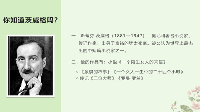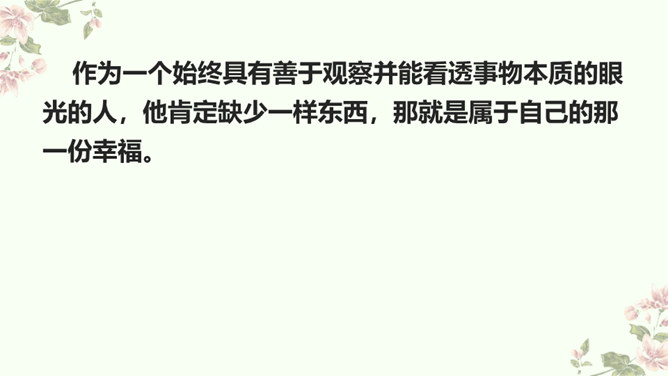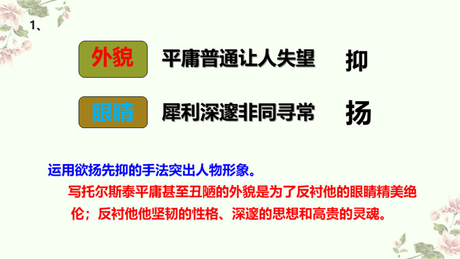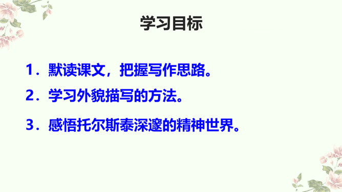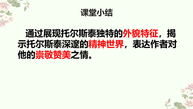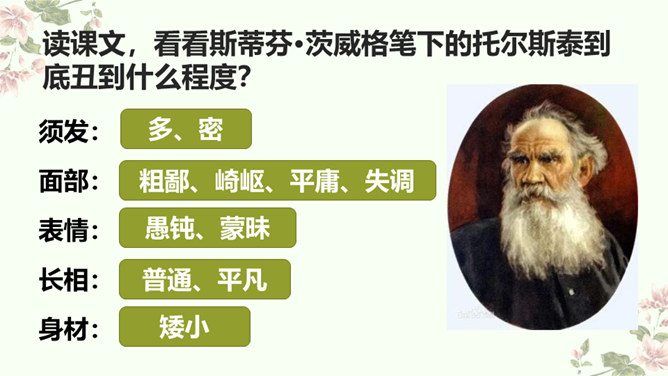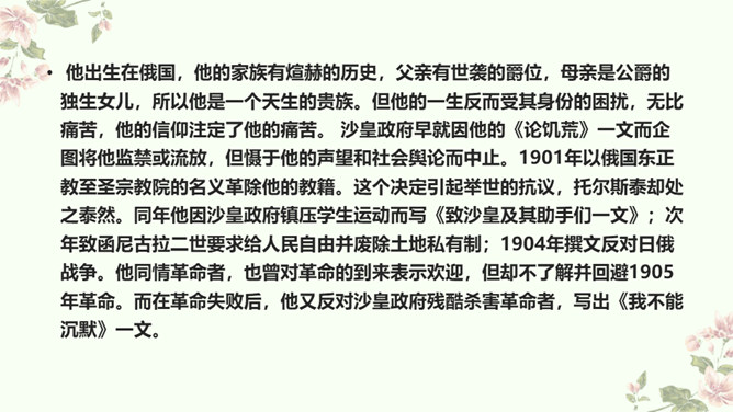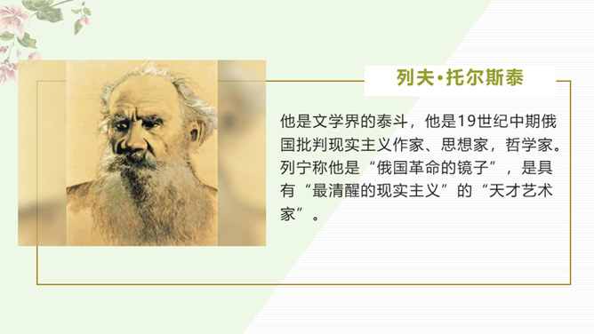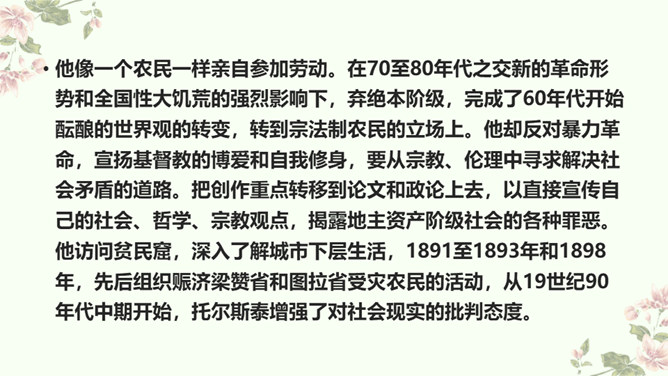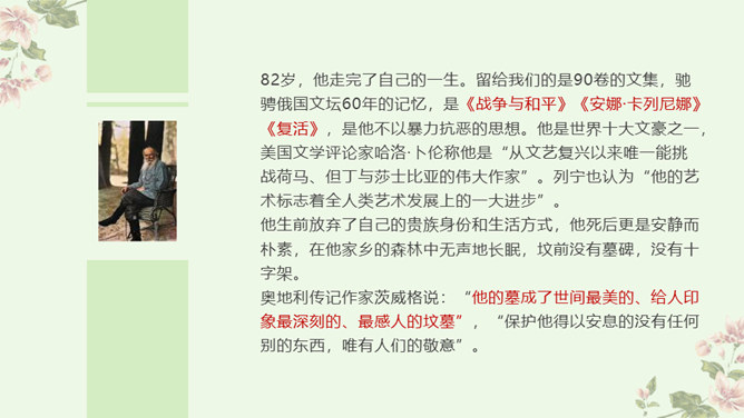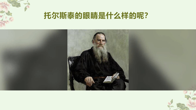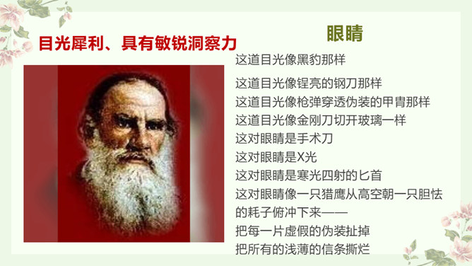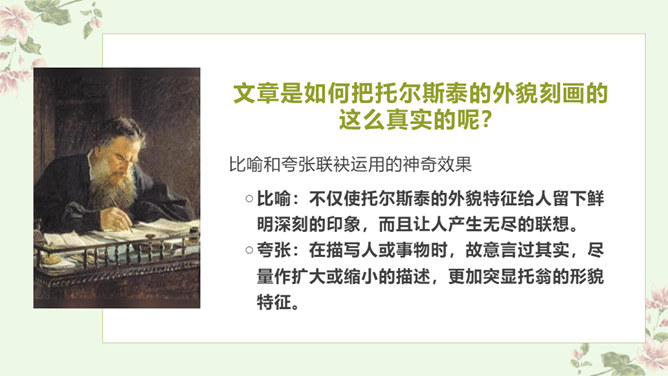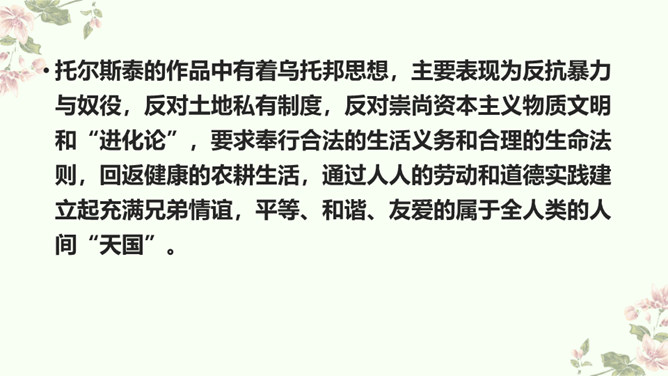 文章是如何把托尔斯泰的外貌刻画的这么真实的呢?比喻和夸张联袂运用的神奇效果。比喻:不仅使托尔斯泰的外貌特征给人留下鲜明深刻的印象,而且让人产生无尽的联想。夸张:在描写人或事物时,故意言过其实,尽量作扩大或缩小的描述,更加突显托翁的形貌特征。托尔斯泰的作品中有着乌托邦思想,主要表现为反抗暴力与奴役,反对土地私有制度,反对崇尚资本主义物质文明和“进化论”,要求奉行合法的生活义务和合理的生命法则,回返健康的农耕生活,通过人人的劳动和道德实践建立起充满兄弟情谊,平等、和谐、友爱的属于全人类的人间“天国”。所属专题:列夫托尔斯泰ppt。
