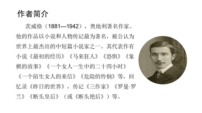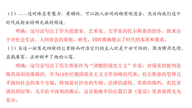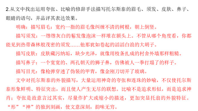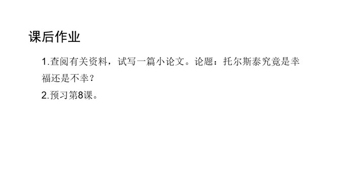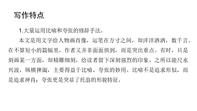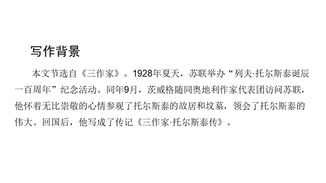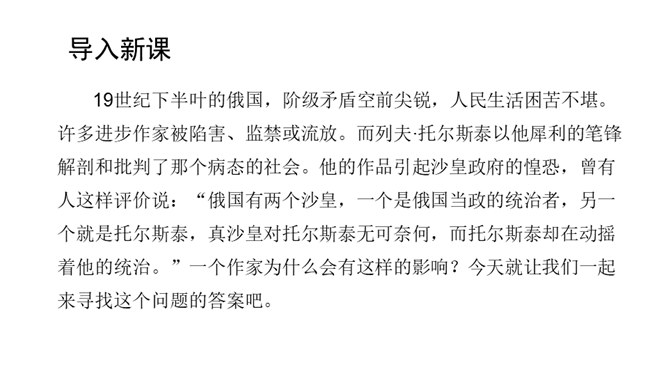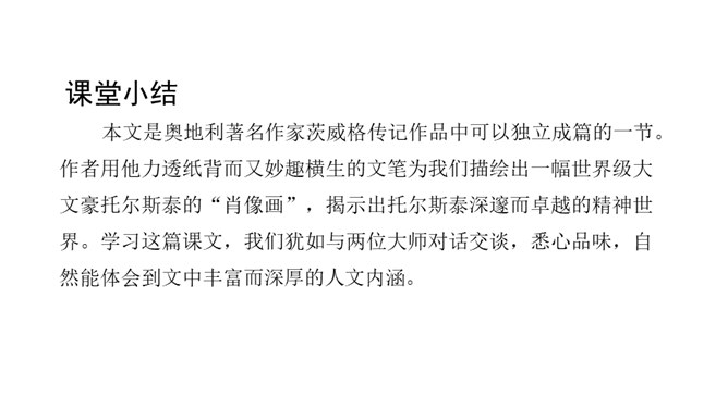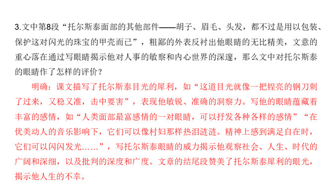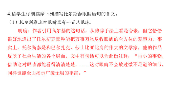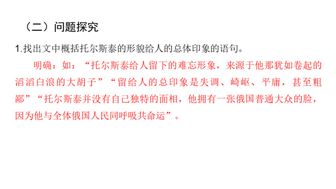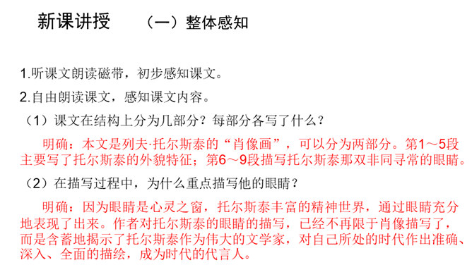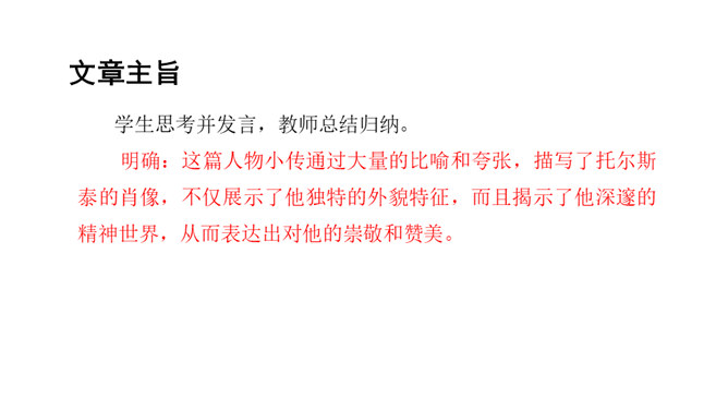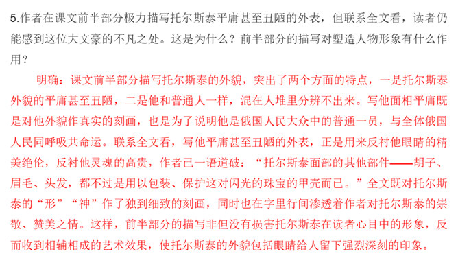 课文前半部分描写托尔斯泰的外貌,突出了两个方面的特点,一是托尔斯泰外貌的平庸甚至丑陋,二是他和普通人一样,混在人堆里分辨不出来。写他面相平庸既是对他外貌作真实的刻画,也是为了说明他是俄国人民大众中的普通一员,与全体俄国人民同呼吸共命运。联系全文看,写他平庸甚至丑陋的外表,正是用来反衬他眼睛的精美绝伦,反衬他灵魂的高贵,作者已一语道破:“托尔斯泰面部的其他部件——胡子、眉毛、头发,都不过是用以包装、保护这对闪光的珠宝的甲壳而已。”全文既对托尔斯泰的“形”“神”作了独到细致的刻画。所属专题:列夫托尔斯泰ppt。