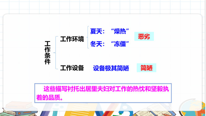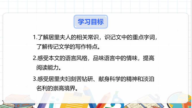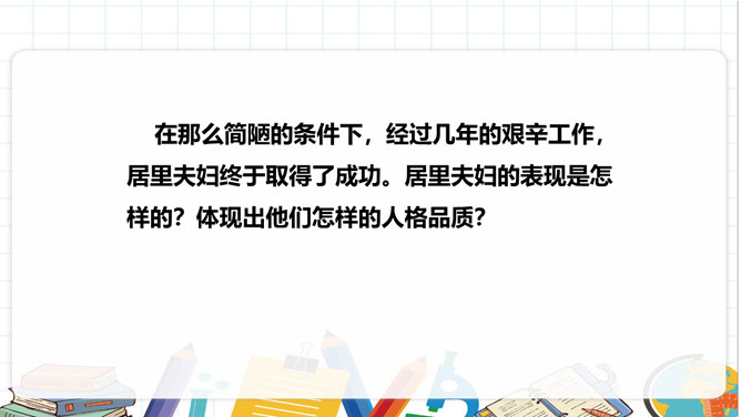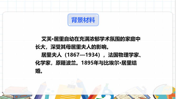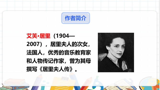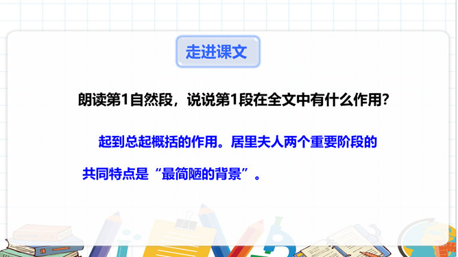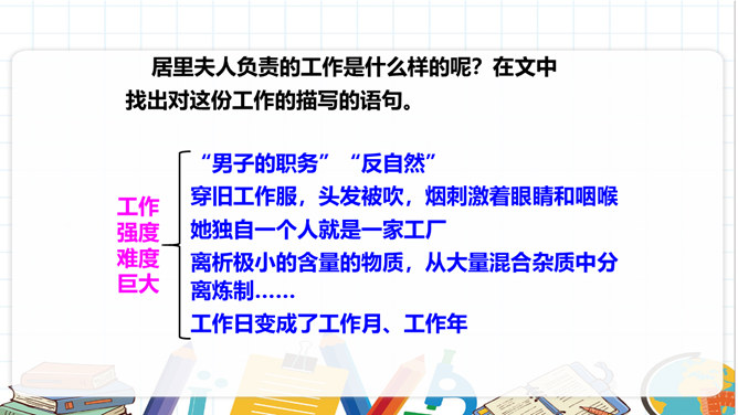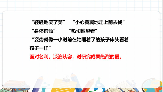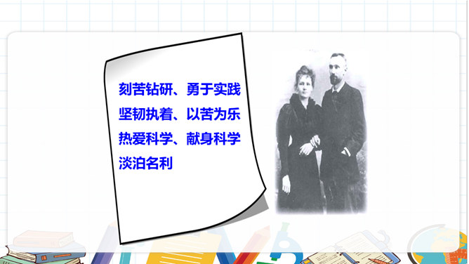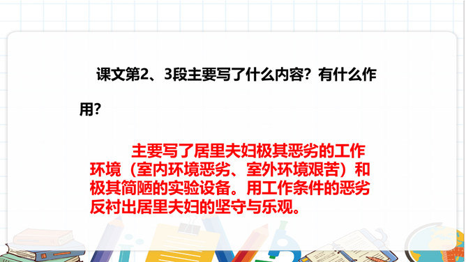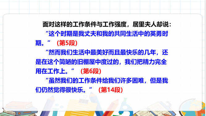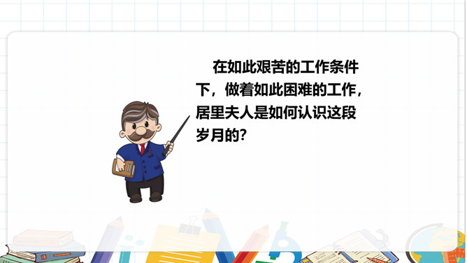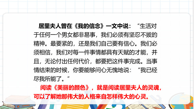 全文通过鲜明的对比,有力地揭示了人物的内心世界,突出了文章的中心。例如,工作条件的极端简陋与主人公的极大快乐相对比,突出人物不畏困难、献身科学、乐于追求的崇高精神;提炼镭的极其艰苦的过程和实验成功的幸福相对比,充分展示出主人公在科学研究的道路上历经艰辛获得成功后的喜悦。文中多处引用居里夫人自己的话,一方面增强了文章的真实性和可信度,另一方面直观地表现了居里夫人的内心世界,增强了文章的感染力。作者善于用轻松和节奏舒缓的段落来冲淡对居里夫妇紧张、艰苦而枯燥的研究生活的描述,使文章叙述的内容张弛有序。所属专题:美丽的颜色ppt。