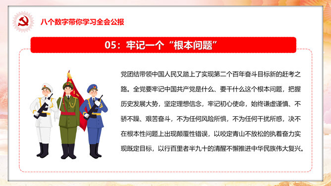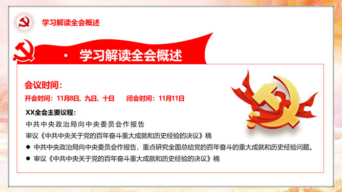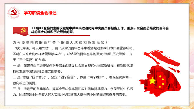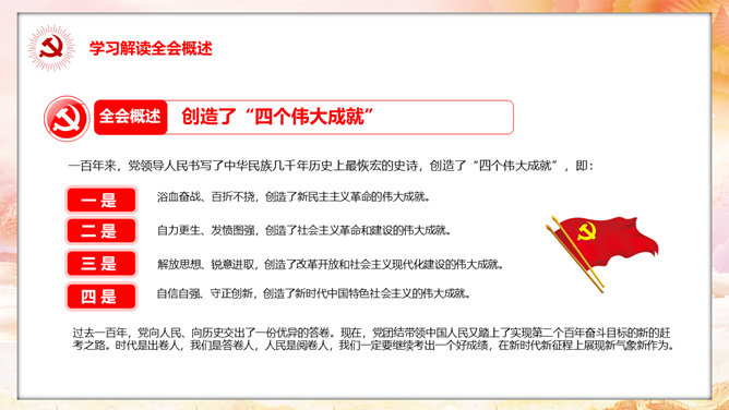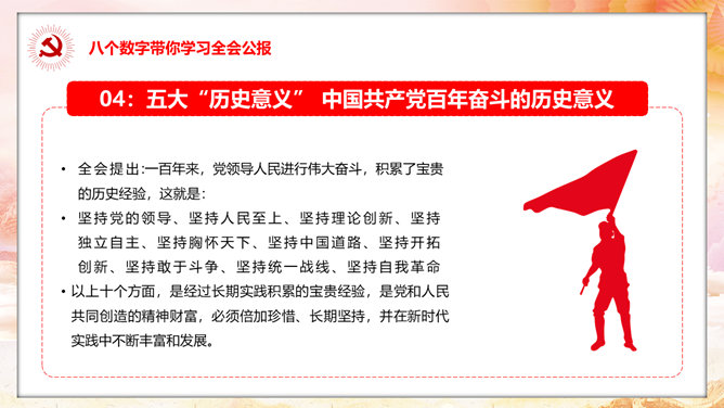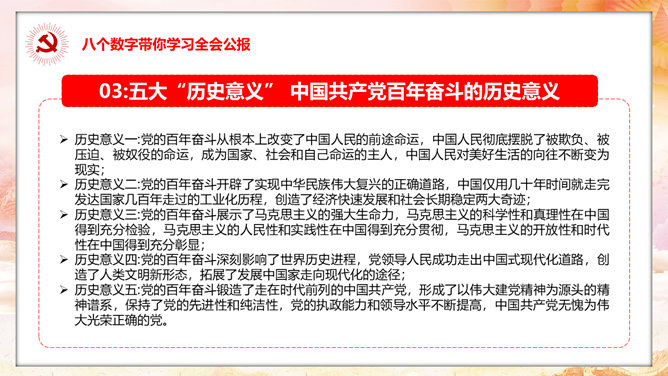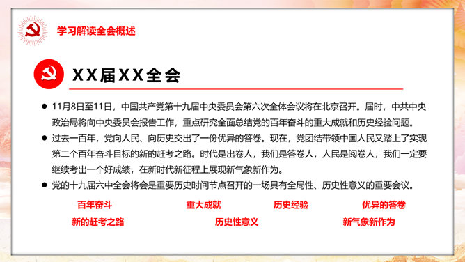 学习贯彻十九届六中全会PPT模板。学习解读全会概述、八个数字带你学习全会公报、百年奋斗的历史意义和历史经验、为何要总结党百年奋斗的重大成就和历史经验、党的百年奋斗历程、十八大以来党和国家事业取得的历史性成就。