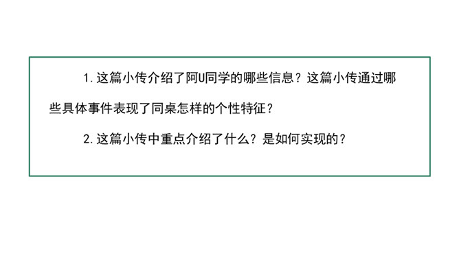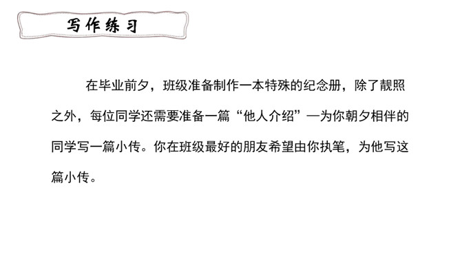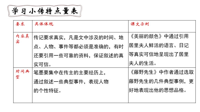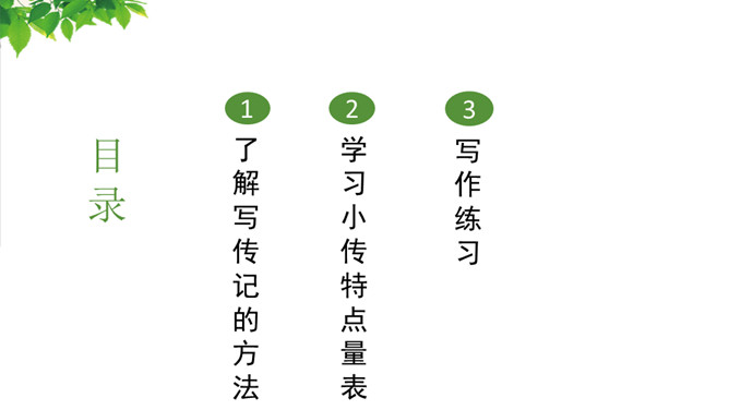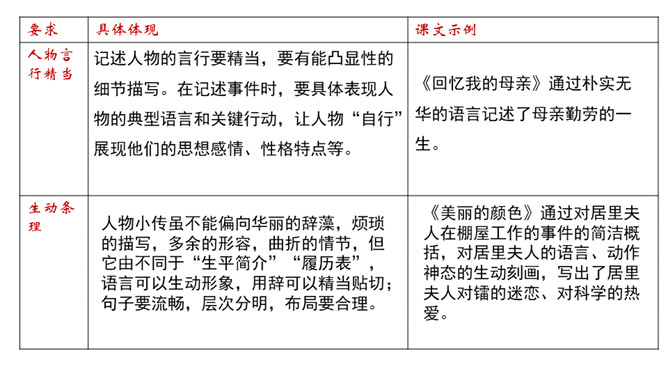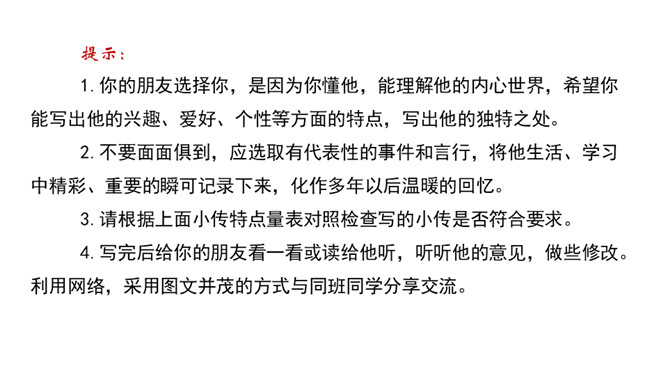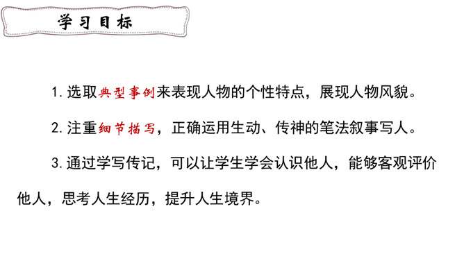 选取典型事例来表现人物的个性特点,展现人物风貌。注重细节描写,正确运用生动、传神的笔法叙事写人。通过学写传记,可以让学生学会认识他人,能够客观评价他人,思考人生经历,提升人生境界。凡是文中涉及的时间、地点、人物、事件等都必须是准确的,有时还要引用一些可靠的资料,保证叙述的真实可信。笔墨要集中在传主的主要经历上,通过叙述一些典型事件,表现人物的个性特征。记述人物的言行要精当,要有能凸显性的细节描写。在记述事件时,要具体表现人物的典型语言和关键行动,让人物“自行”展现他们的思想感情、性格特点等。所属专题:学写传记ppt。