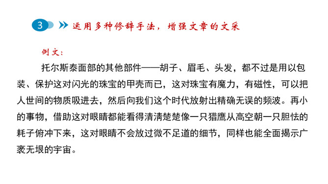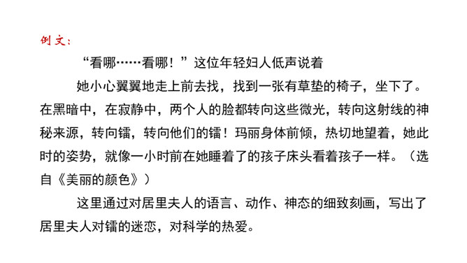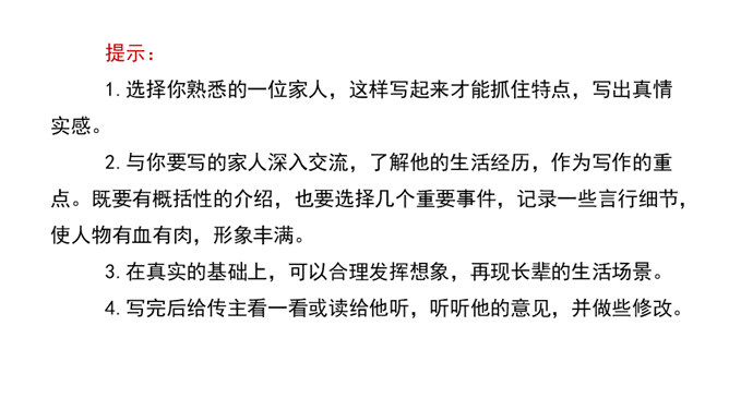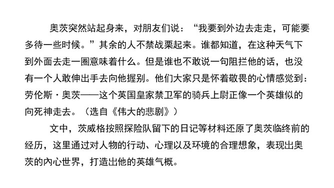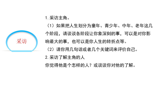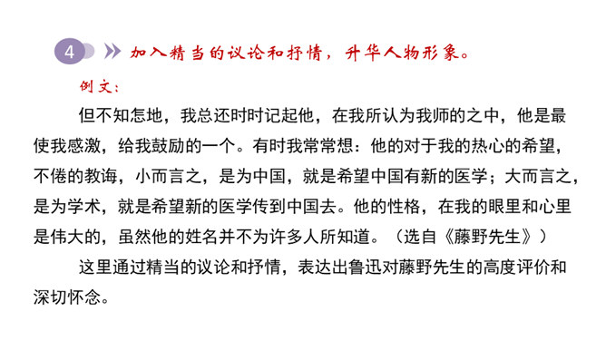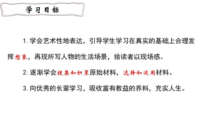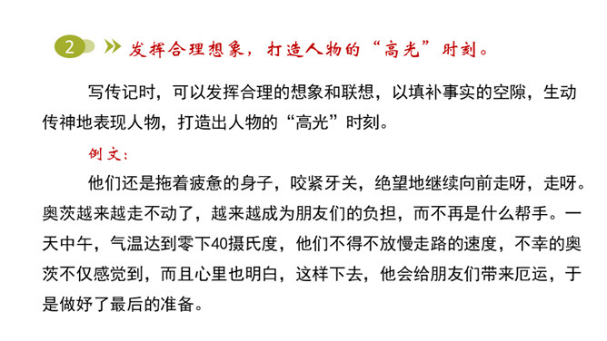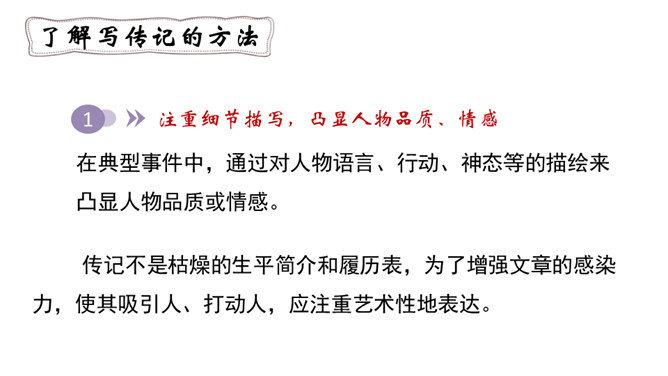 1.学会艺术性地表达,引导学生学习在真实的基础上合理发挥想象,再现所写人物的生活场景,给读者以现场感。2.逐渐学会搜集和积累原始材料,选择和运用材料。3.向优秀的长輩学习,吸收富有教益的养料,充实人生。在典型事件中,通过对人物语言、行动、神态等的描绘来凸显人物品质或情感。传记不是枯燥的生平简介和履历表,为了增强文章的感染力,使其吸引人、打动人,应注重艺术性地表达。写传记时,可以发挥合理的想象和联想,以填补事实的空隙,生动传神地表现人物,打造出人物的“高光”时刻。所属专题:学写传记ppt。