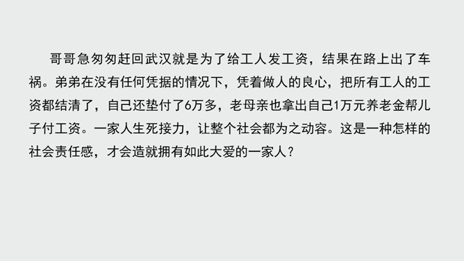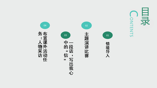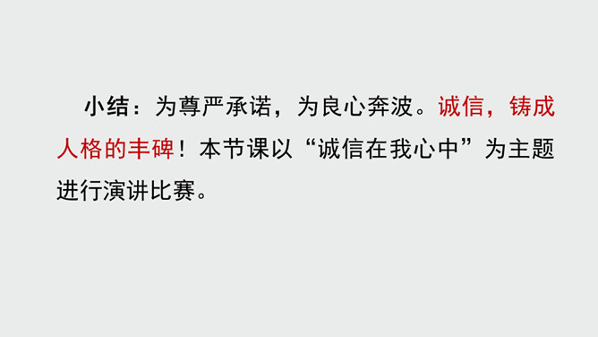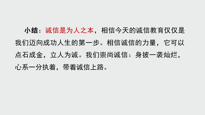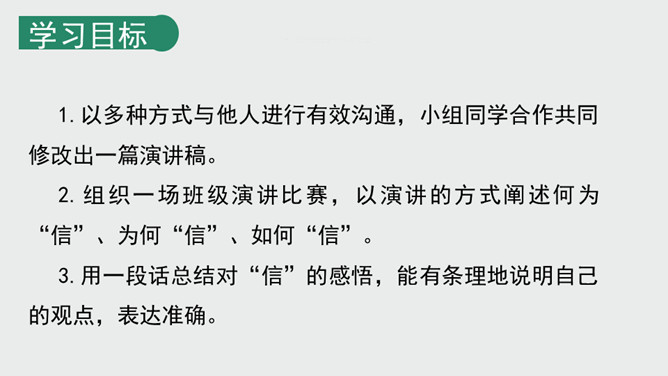 1.以多种方式与他人进行有效沟通,小组同学合作共同修改出一篇演讲稿。2.组织一场班级演讲比赛,以演讲的方式阐述何为“信”、为何“信”、如何“信”。3.用一段话总结对“信”的感悟,能有条理地说明自己的观点,表达准确。诚信是为人之本,相信今天的诚信教育仅仅是我们迈向成功人生的第一步。相信诚信的力量,它可以点石成金,立人为诚。我们崇尚诚信:身披一袭灿烂,心系一分执着,带着诚信上路。所属专题:人无信不立ppt。