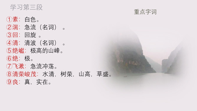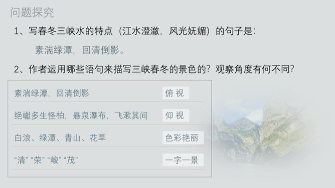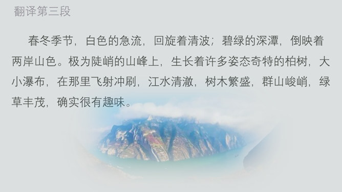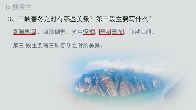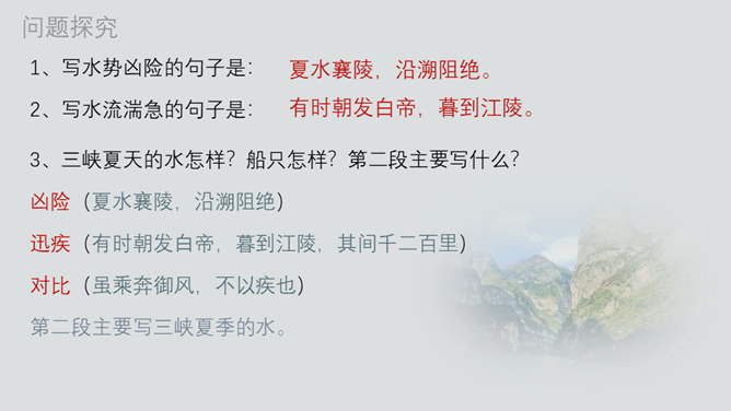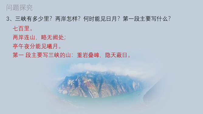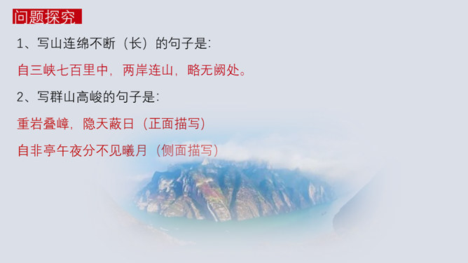 文章的第二层与这首诗的一、二、四句相印证,都表现了夏天三峡水流速度极快;文章第四层与诗的第三句相对应,都是写连续不断的猿啼;文章第一层则和诗中的“万重山”相应。假如你是导游,请写一段段关于三峡的导游词:各位旅客,欢迎你们来三峡观光。七百里三峡,雄奇险拔,清幽秀丽,四季美景风格迥异。欢迎各位常游此地。我们伟大的祖国,有雄伟的崇山峻岭,有奔腾的长江黄河,有珍贵的文物古迹,有秀丽的园林风光。这是一篇很好的古代写景散文,作者描述了三峡雄伟壮丽的景色,抒发了作者热爱祖国山河的情怀,使我们从中受益匪浅。所属专题:三峡ppt。
