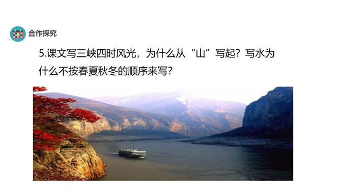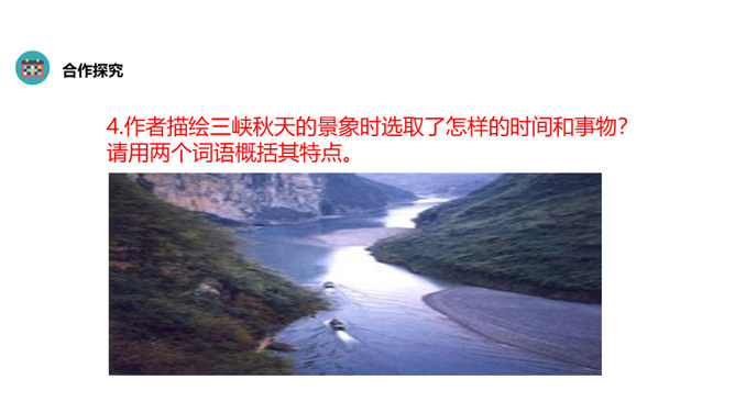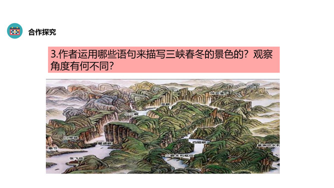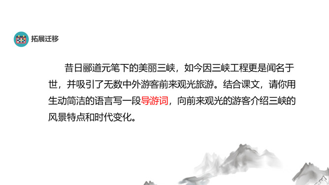 昔日郦道元笔下的美丽三峡,如今因三峡工程更是闻名于世,并吸引了无数中外游客前来观光旅游。结合课文,请你用生动简洁的语言写一段导游词,向前来观光的游客介绍三峡的风景特点和时代变化。各位旅客:欢迎你们来三峡参观,七百里三峡,雄奇险拔,清幽秀丽.四季风景风格迥异.春冬之时,潭水碧绿,清波回旋,怪柏凌峰,瀑布飞悬;夏季水涨,江流汹涌;秋景凄寒,猿鸣哀转.走进三峡,品尝金黄的蜜橘,登上三峡大坝,感受磅礴气势,多情的三峡风光,热情的三峡人民欢迎各位常游此地。所属专题:三峡ppt。