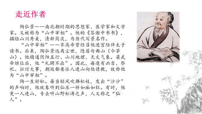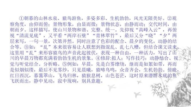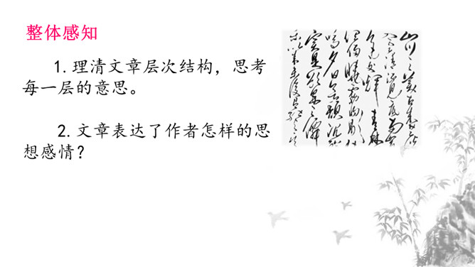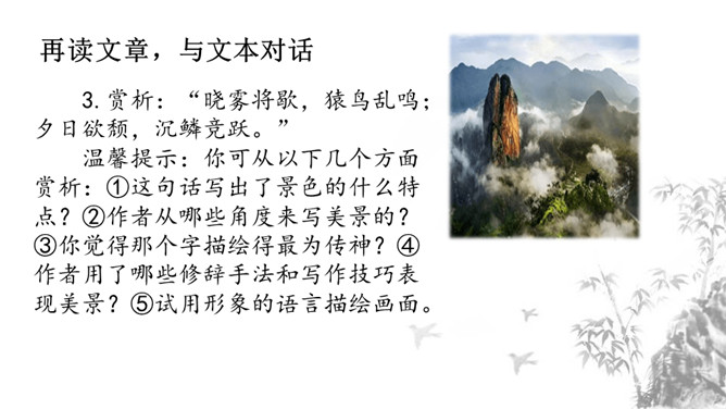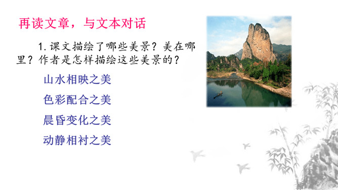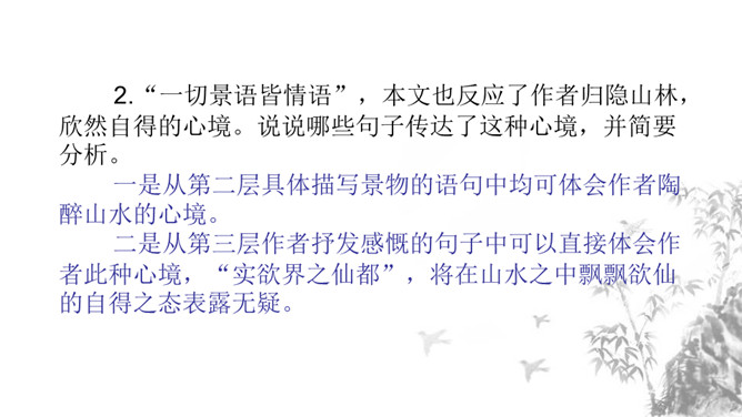1.课文描绘了哪些美景?美在哪里?作者是怎样描绘这些美景的? 山水相映之美、色彩配合之美、晨昏变化之美、动静相衬之美。2.“一切景语皆情语”,本文也反应了作者归隐山林,欣然自得的心境。说说哪些句子传达了这种心境,并简要分析。一是从第二层具体描写景物的语句中均可体会作者陶醉山水的心境。二是从第三层作者抒发感慨的句子中可以直接体会作者此种心境,“实欲界之仙都”,将在山水之中飘飘欲仙的自得之态表露无疑。1.理清文章层次结构,思考每一层的意思。2.文章表达了作者怎样的思想感情?所属专题:答谢中书书ppt。