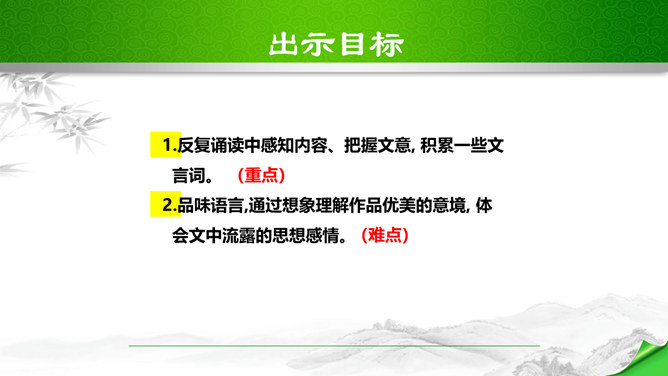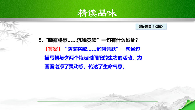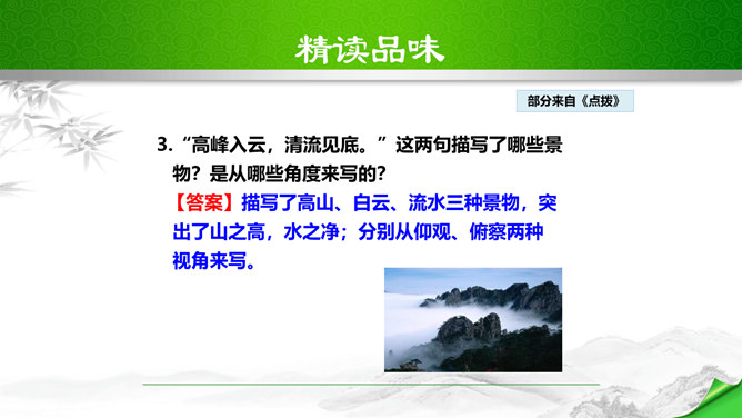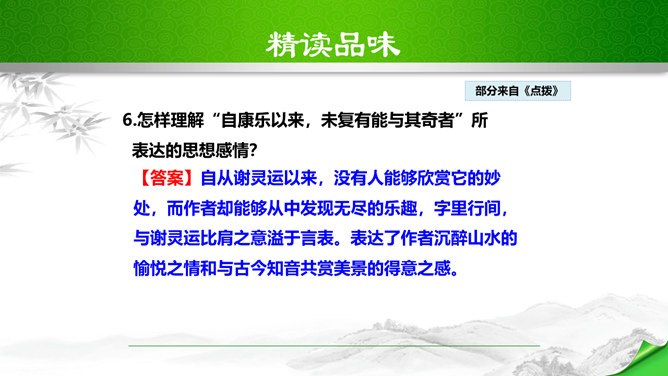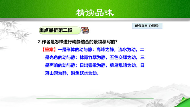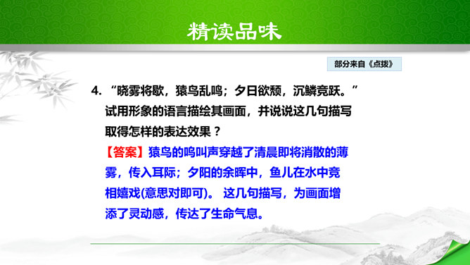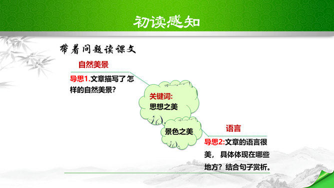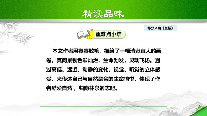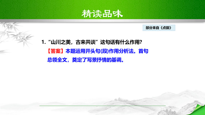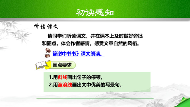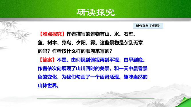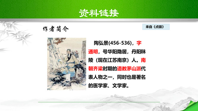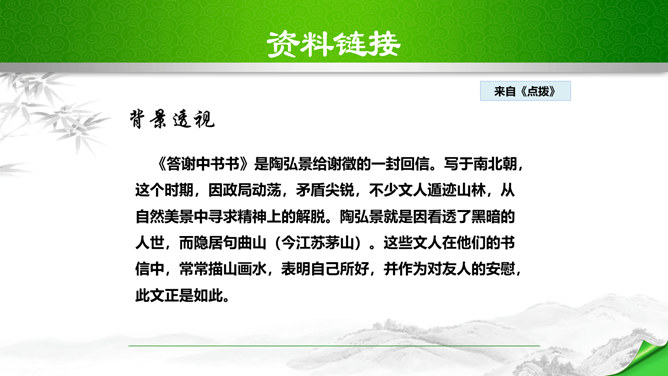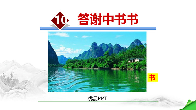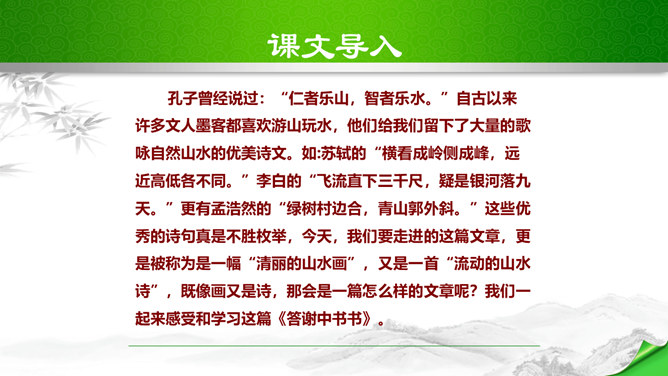 孔子曾经说过:“仁者乐山,智者乐水。”自古以来许多文人墨客都喜欢游山玩水,他们给我们留下了大量的歌咏自然山水的优美诗文。如:苏轼的“横看成岭侧成峰,远近高低各不同。”李白的“飞流直下三千尺,疑是银河落九天。”更有孟浩然的“绿树村边合,青山郭外斜。”这些优秀的诗句真是不胜枚举,今天,我们要走进的这篇文章,更是被称为是一幅“清丽的山水画”,又是一首“流动的山水诗”,既像画又是诗,那会是一篇怎么样的文章呢?我们一起来感受和学习这篇文章。所属专题:答谢中书书ppt。