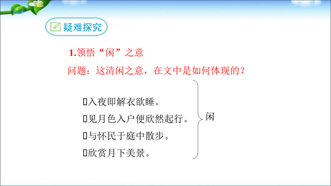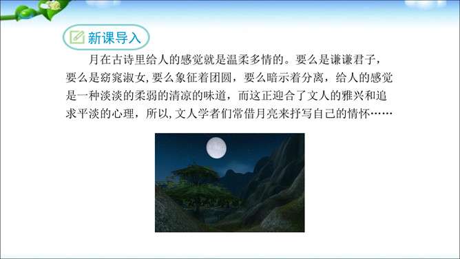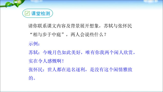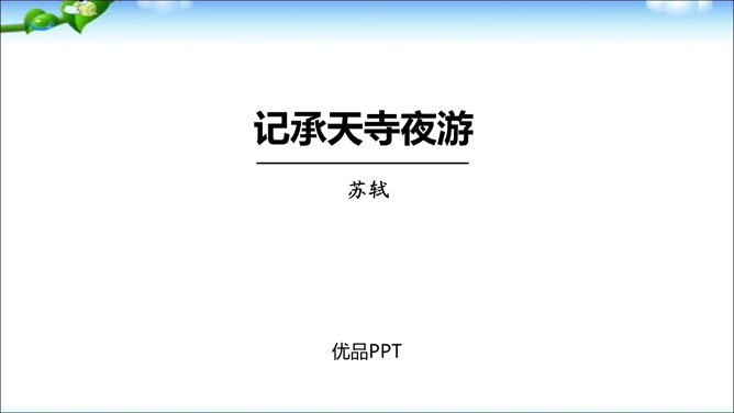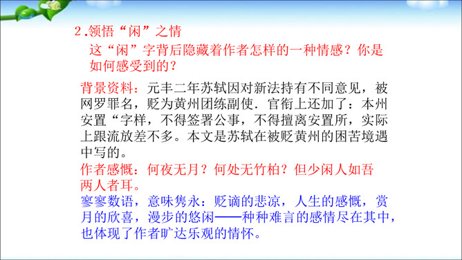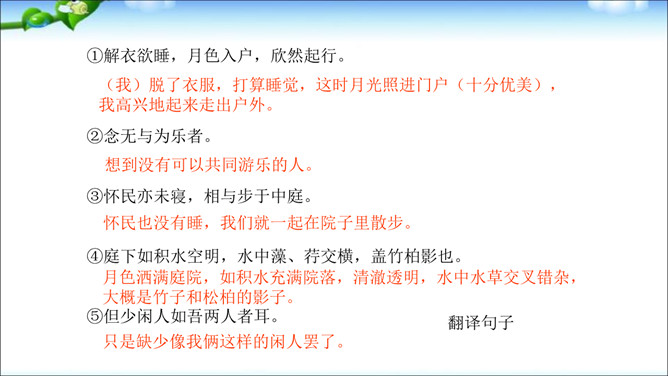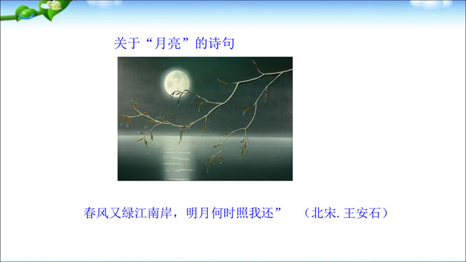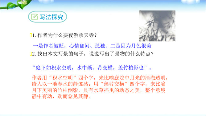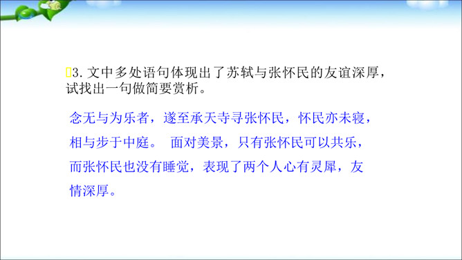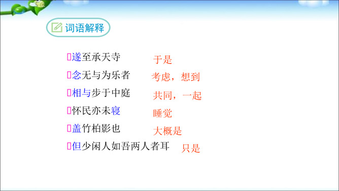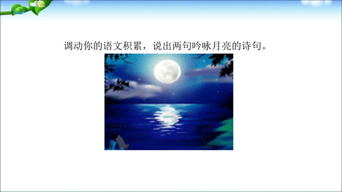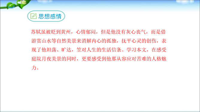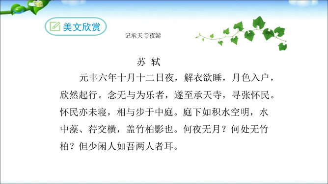 月在古诗里给人的感觉就是温柔多情的。要么是谦谦君子,要么是窈窕淑女,要么象征着团圆,要么暗示着分离,给人的感觉是一种淡淡的柔弱的清凉的味道,而这正迎合了文人的雅兴和追求平淡的心理,所以,文人学者们常借月亮来抒写自己的情怀……调动你的语文积累,说出两句吟咏月亮的诗句。作者为什么要夜游承天寺?一是作者被贬,心情郁闷、孤独;二是因为月色很美。找出本文写景的句子,说说写出了景物的什么特点?作者用“积水空明”四个字,来比喻庭院中月光的清澈透明,给人以一池春水的静谧感。所属专题:记承天寺夜游ppt。