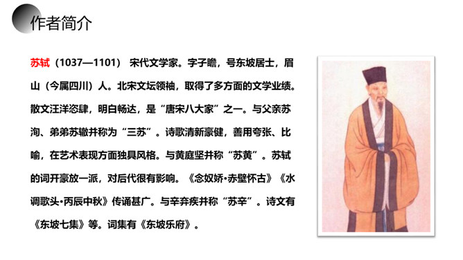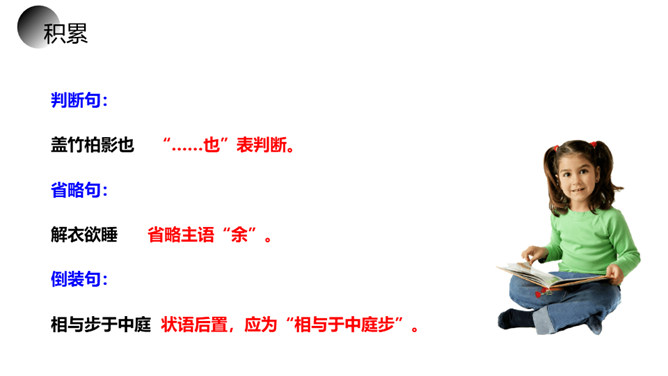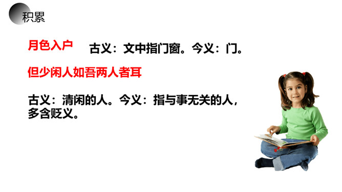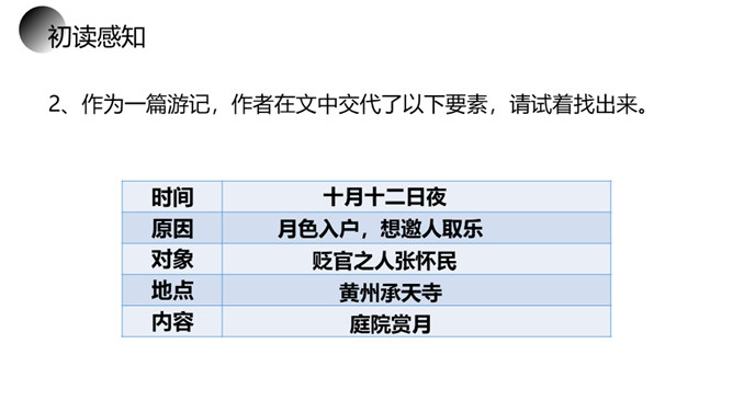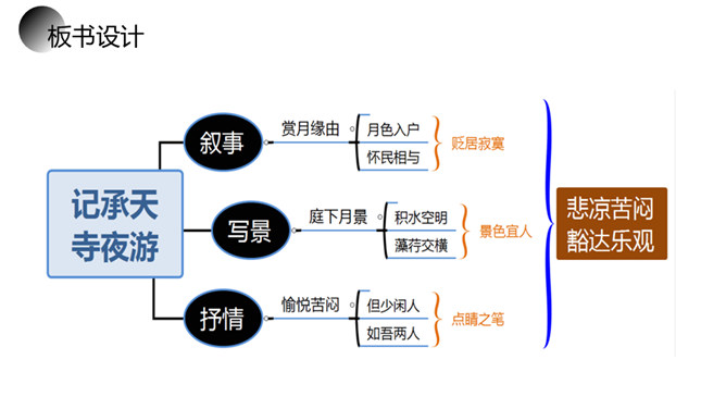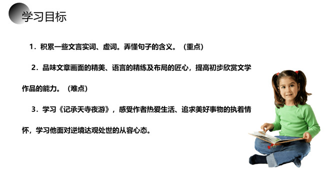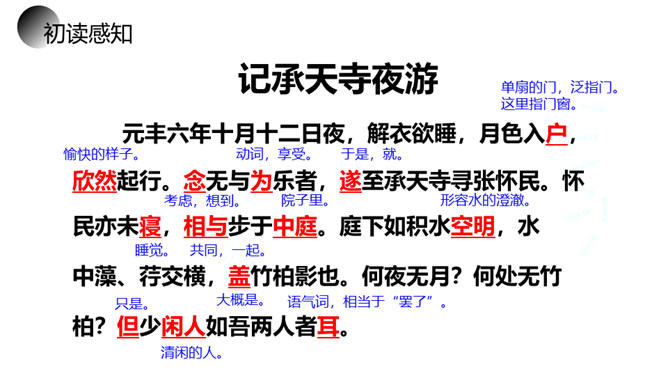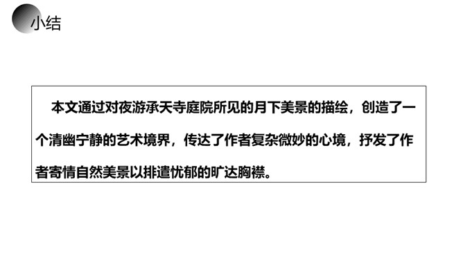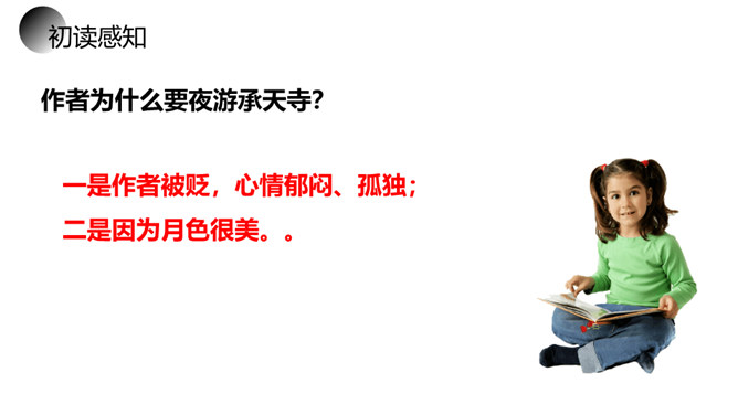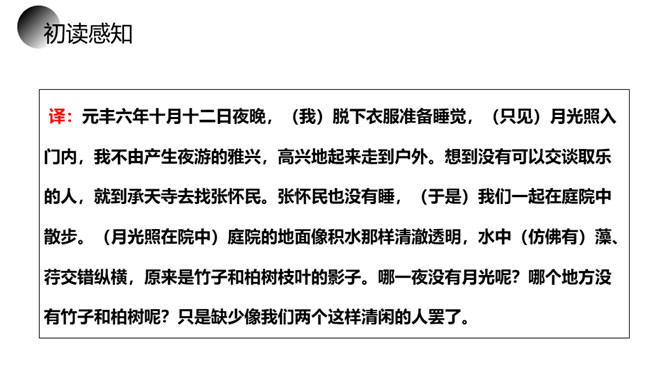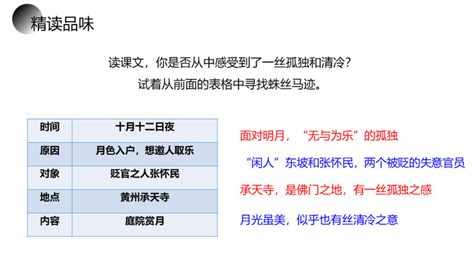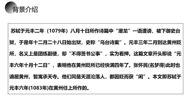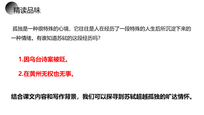 1.积累一些文言实词、虚词。弄懂句子的含义。(重点) 2.品味文章画面的精美、语言的精练及布局的匠心,提高初步欣赏文学作品的能力。(难点)3.感受作者热爱生活、追求美好事物的执着情怀,学习他面对逆境达观处世的从容心态。 孤独是一种很特殊的心境,它往往是人在经历了一段特殊的人生后所沉淀下来的一种情绪。有谁知道苏轼的这段经历吗?1.因乌台诗案被贬。2.在黄州无权也无事。结合课文内容和写作背景,我们可以探寻到苏轼超越孤独的旷达情怀。所属专题:记承天寺夜游ppt。