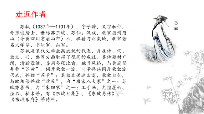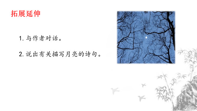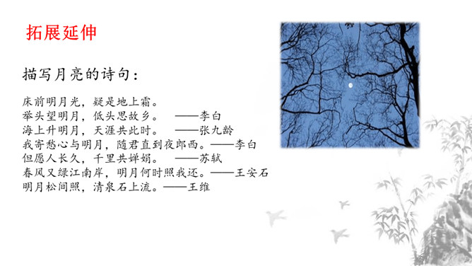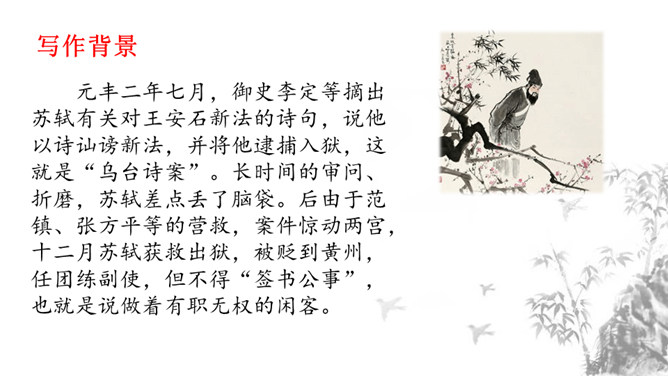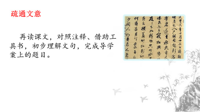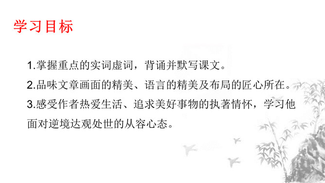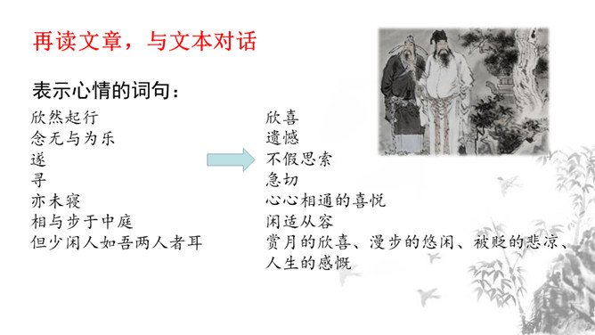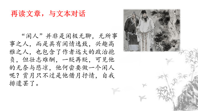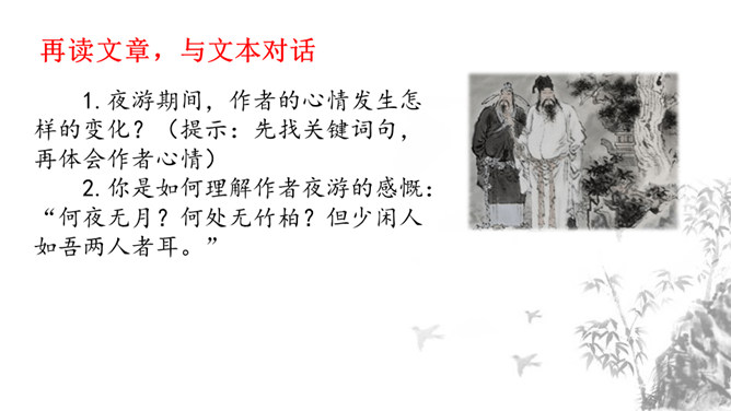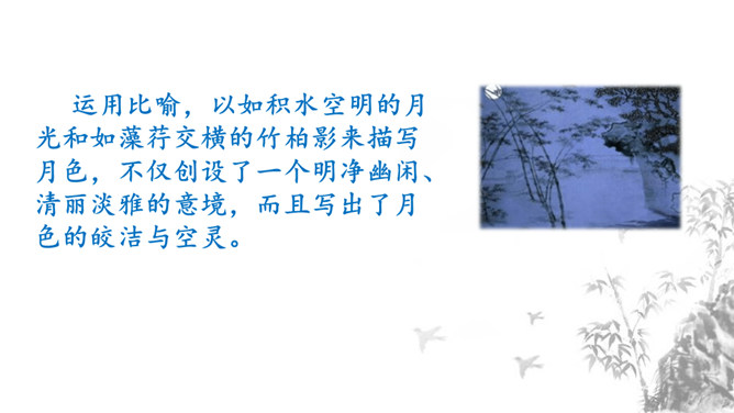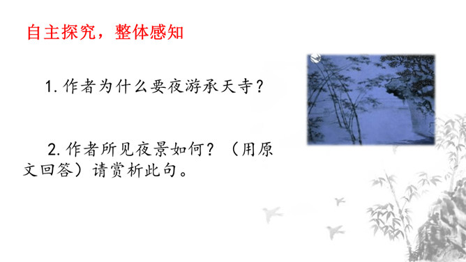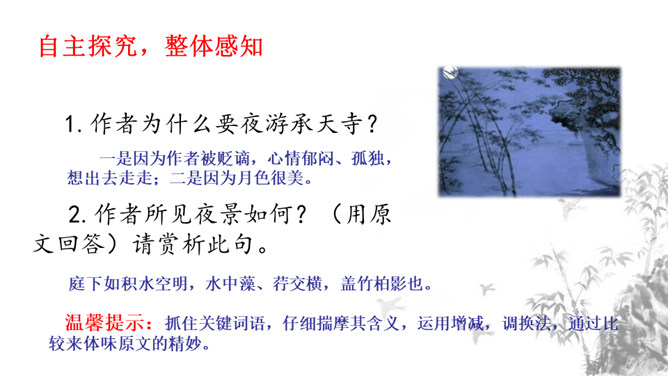 1.掌握重点的实词虚词,背诵并默写课文。2.品味文章画面的精美、语言的精美及布局的匠心所在。3.感受作者热爱生活、追求美好事物的执著情怀,学习他面对逆境达观处世的从容心态。再读课文,对照注释、借助工具书,初步理解文句,完成导学案上的题目。运用比喻,以如积水空明的月光和如藻荇交横的竹柏影来描写月色,不仅创设了一个明净幽闲、清丽淡雅的意境,而且写出了月色的皎洁与空灵。你是如何理解作者夜游的感慨:“何夜无月?何处无竹柏?但少闲人如吾两人者耳。”所属专题:记承天寺夜游ppt。