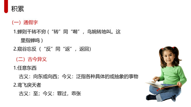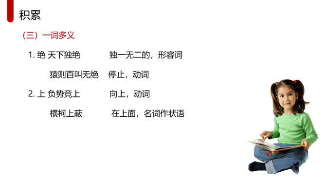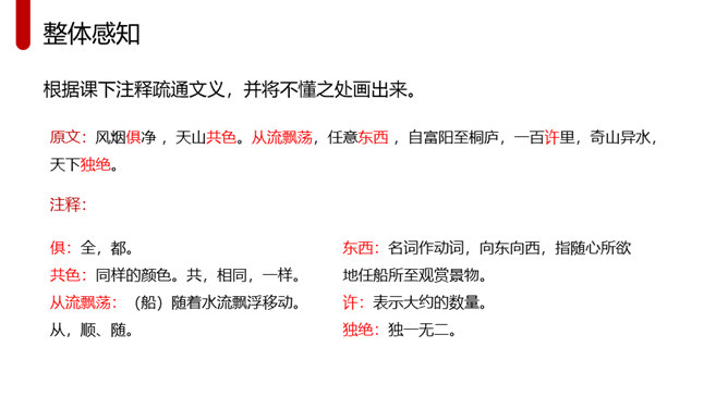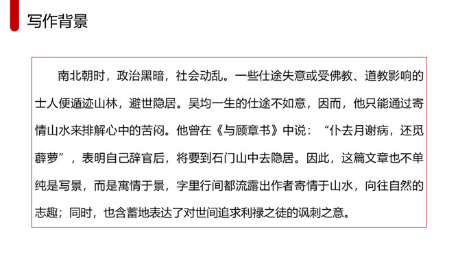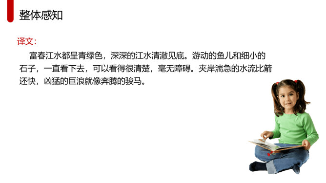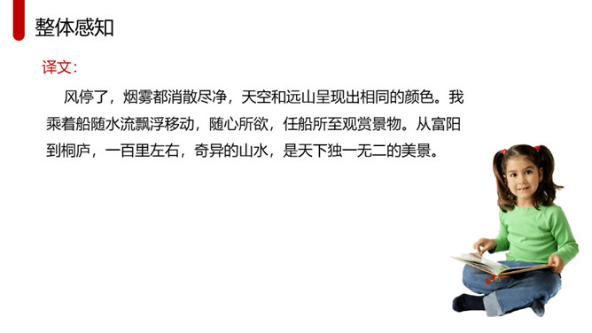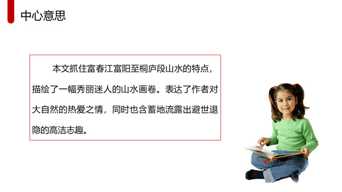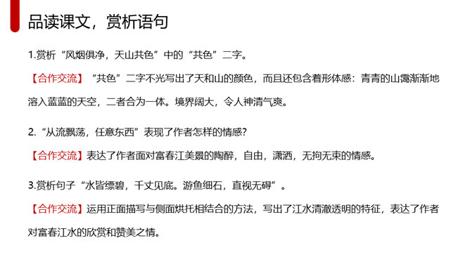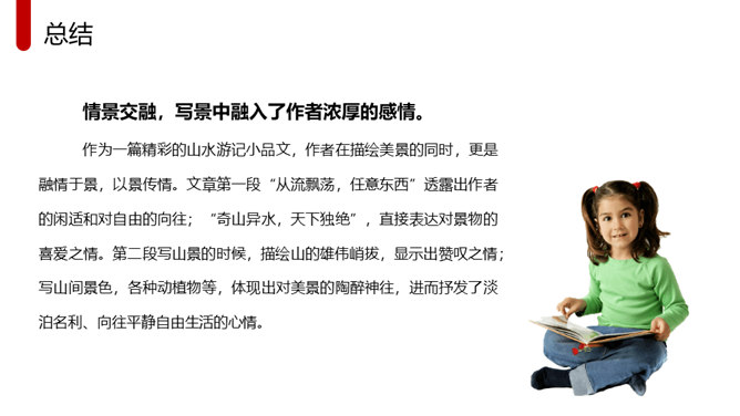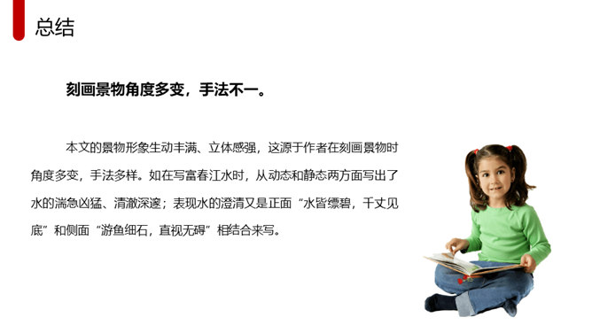 情景交融,写景中融入了作者浓厚的感情。作为一篇精彩的山水游记小品文,作者在描绘美景的同时,更是融情于景,以景传情。文章第一段“从流飘荡,任意东西”透露出作者的闲适和对自由的向往;“奇山异水,天下独绝”,直接表达对景物的喜爱之情。第二段写山景的时候,描绘山的雄伟峭拔,显示出赞叹之情;写山间景色,各种动植物等,体现出对美景的陶醉神往,进而抒发了淡泊名利、向往平静自由生活的心情。刻画景物角度多变,手法不一。本文的景物形象生动丰满、立体感强,这源于作者在刻画景物时角度多变,手法多样。所属专题:与朱元思书ppt。