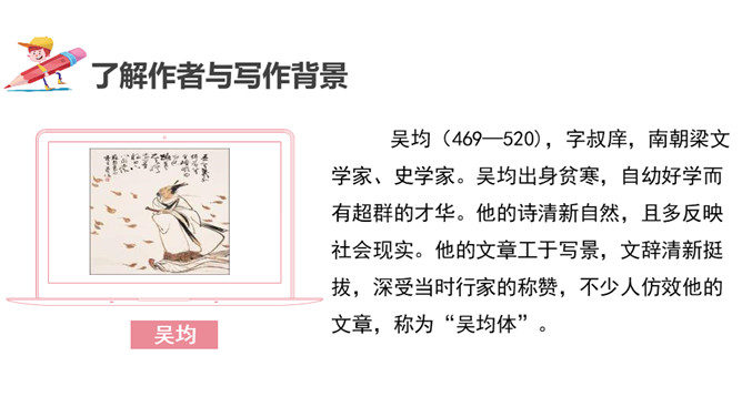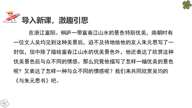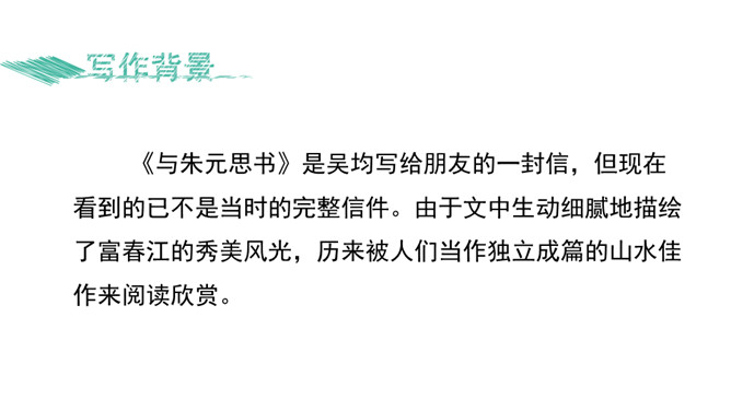 在浙江富阳、桐庐一带富春江山水的景色特别优美,南朝时有一位文人吴均见到这种美景后,迫不及待地给他的友人朱元思写了一封信,信中除了描绘富春江山水的优美景色外,他还表达了欣赏这种优美景色后与众不同的情感。那么究竟他描写了怎样一幅优美的景色呢? 又表达了怎样一种与众不同的情感呢?我们来共同欣赏吴均的这篇短文吧。这是吴均写给朋友的一封信,但现在看到的已不是当时的完整信件。由于文中生动细腻地描绘了富春江的秀美风光,历来被人们当作独立成篇的山水佳作来阅读欣赏。所属专题:与朱元思书ppt。