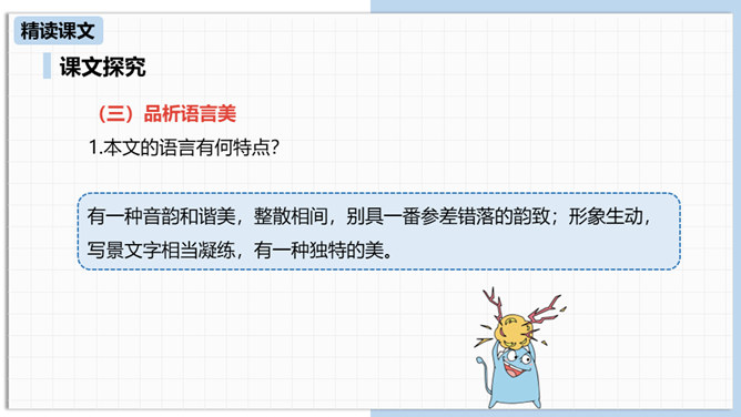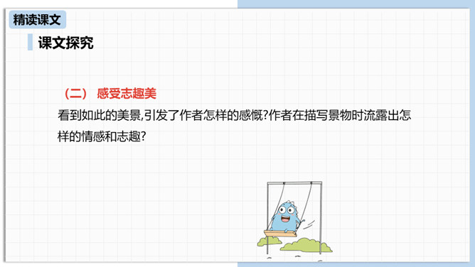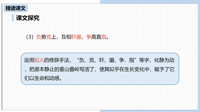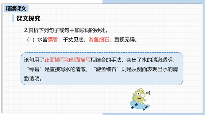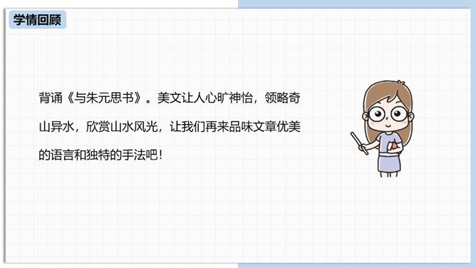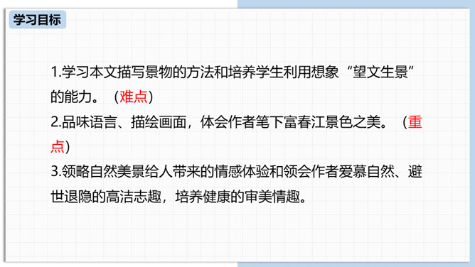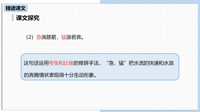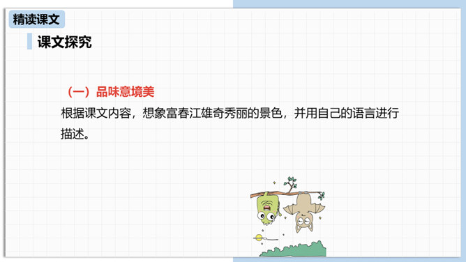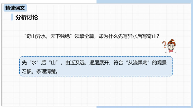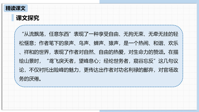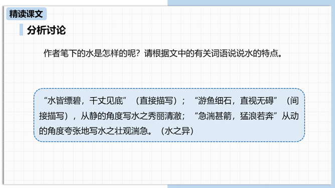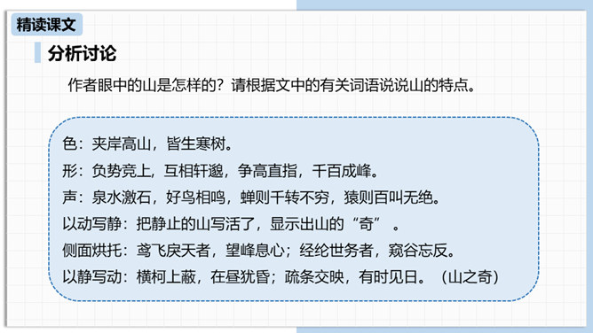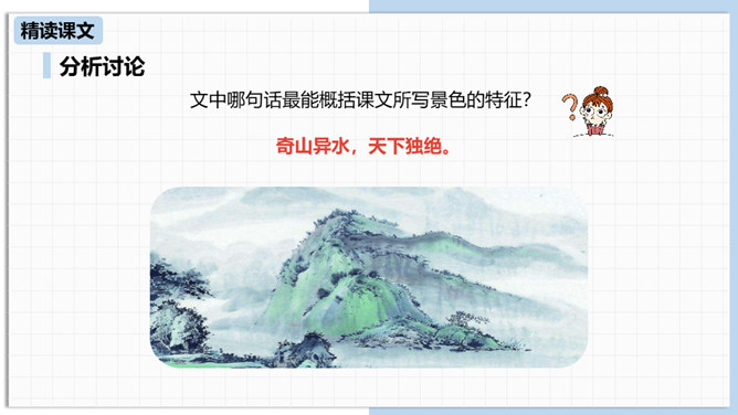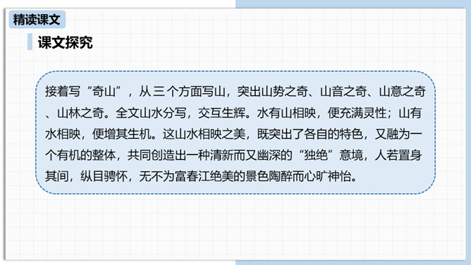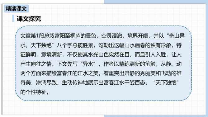 文章第1段总叙富阳至桐庐的景色,空灵澄澈,境界开阔,并以“奇山异水,天下独绝”八个字总揽胜景,勾勒出这幅山水画卷的独有形象,特征鲜明,意境清新,不仅使其水光山色宛然在目,而且引人入胜,让人产生向往之情。下文先写“异水”,作者以精练清新的笔触,从静、动两个方面来描绘富春江的江水之美,着重突出肃静的秀丽美和飞动的雄奇美,淋漓尽致、生动传神地展示出富春江水千姿百态、“天下独绝”的个性特征。接着写“奇山”,从三个方面写山,突出山势之奇、山音之奇、山意之奇、山林之奇。所属专题:与朱元思书ppt。
