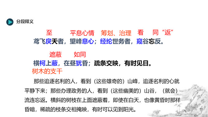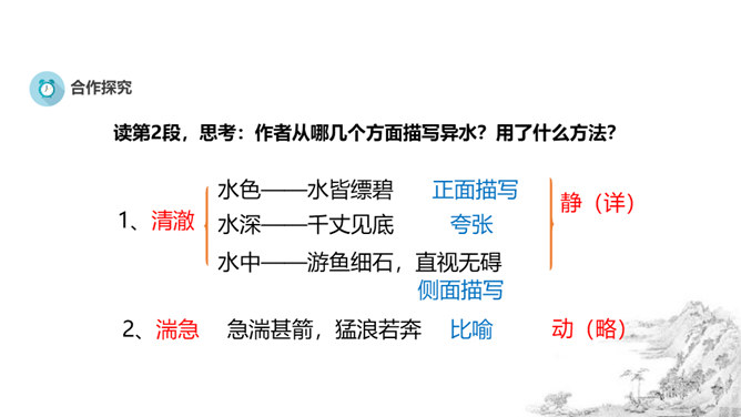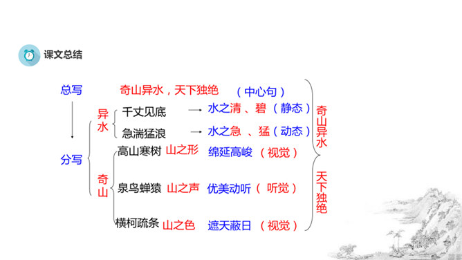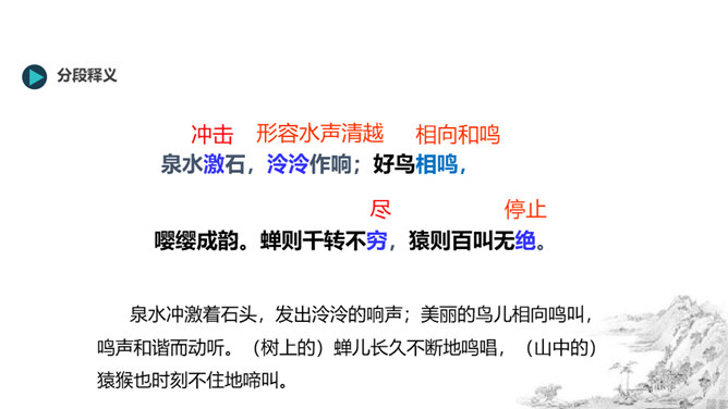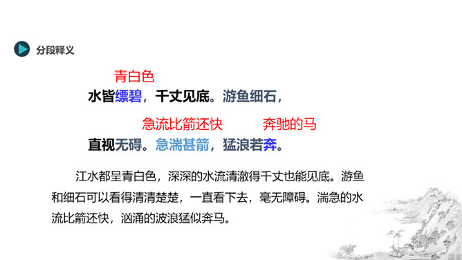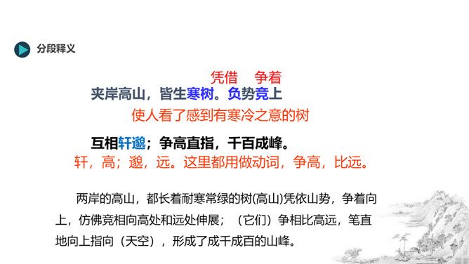 风停了,烟雾都消散尽净,天空和远山呈现出相同的颜色。(我乘着船)随水流漂浮移动,随心所欲,任船所致观赏景物。从富阳到桐庐大约(相距)一百里左右,奇异的山水,是天下绝无仅有的。江水都呈青白色,深深的水流清澈得千丈也能见底。游鱼和细石可以看得清清楚楚,一直看下去,毫无障碍。湍急的水流比箭还快,汹涌的波浪猛似奔马。两岸的高山,都长着耐寒常绿的树(高山)凭依山势,争着向上,仿佛竞相向高处和远处伸展;(它们)争相比高远,笔直地向上指向(天空),形成了成千成百的山峰。所属专题:与朱元思书ppt。