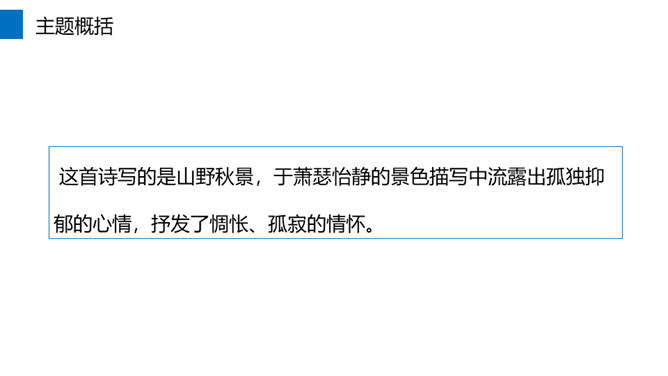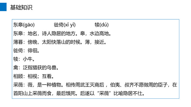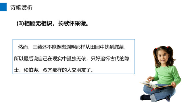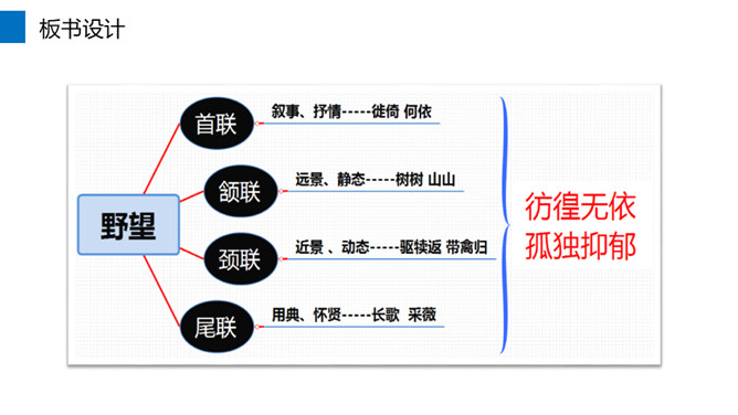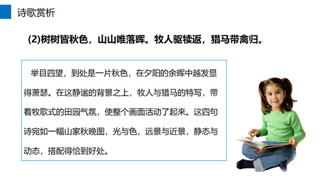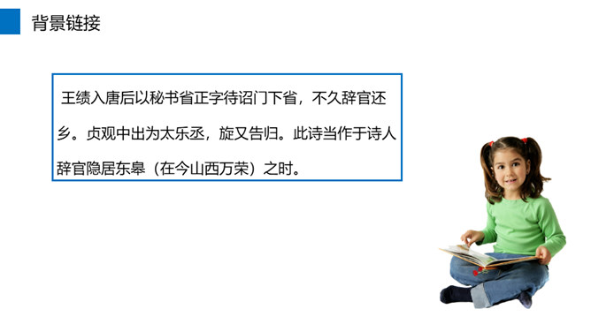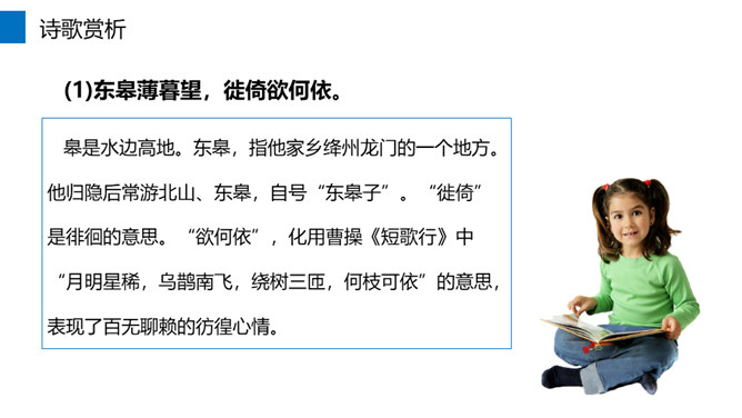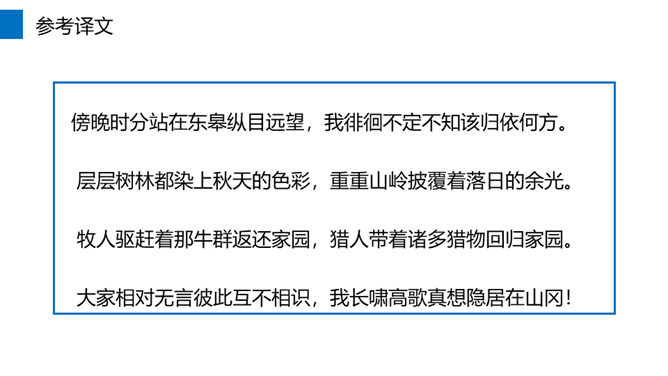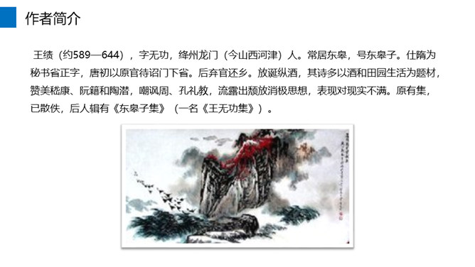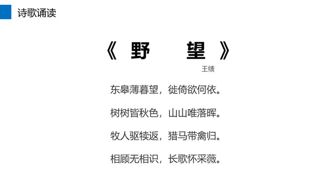 皋是水边高地。东皋,指他家乡绛州龙门的一个地方。他归隐后常游北山、东皋,自号“东皋子”。“徙倚”是徘徊的意思。“欲何依”,化用曹操《短歌行》中“月明星稀,乌鹊南飞,绕树三匝,何枝可依”的意思,表现了百无聊赖的彷徨心情。举目四望,到处是一片秋色,在夕阳的余晖中越发显得萧瑟。在这静谧的背景之上,牧人与猎马的特写,带着牧歌式的田园气氛,使整个画面活动了起来。这四句诗宛如一幅山家秋晚图,光与色,远景与近景,静态与动态,搭配得恰到好处。所属专题:野望ppt。