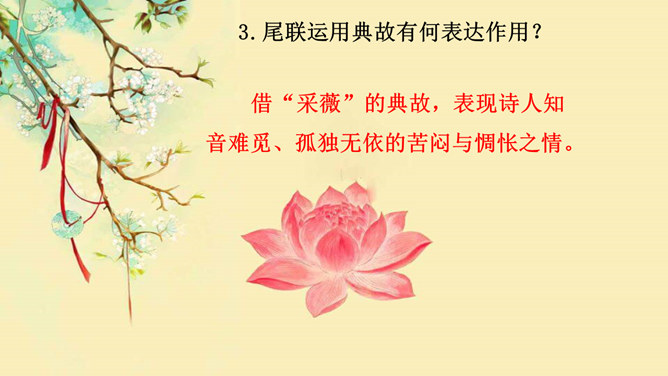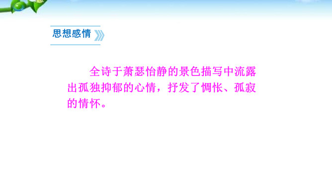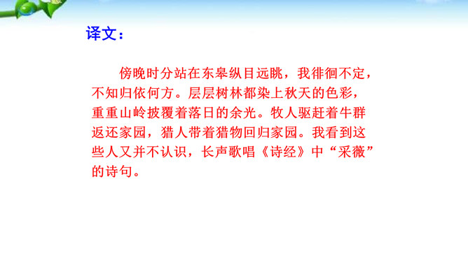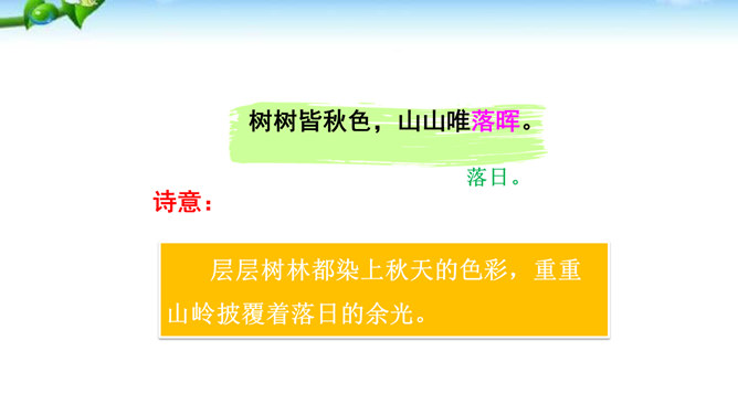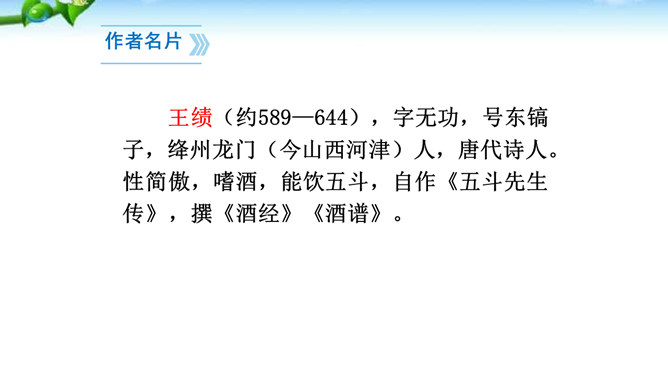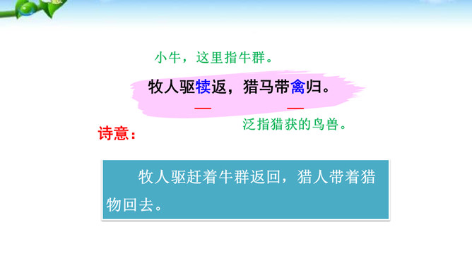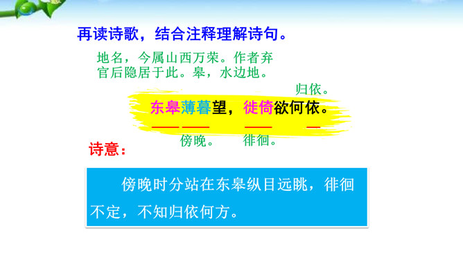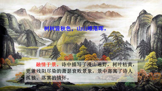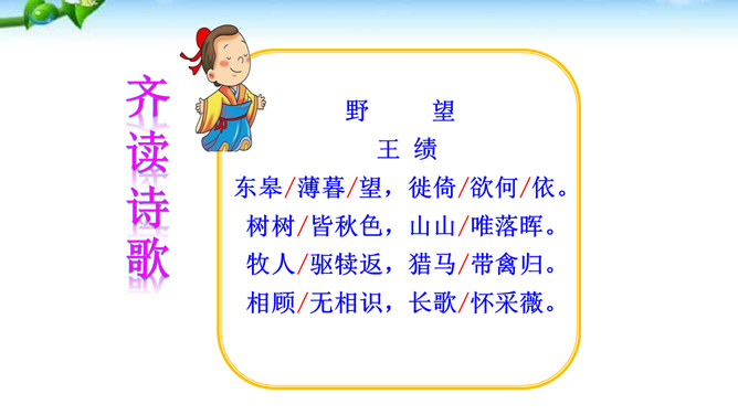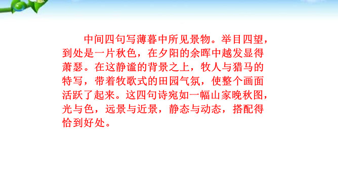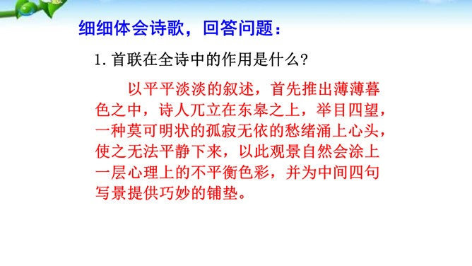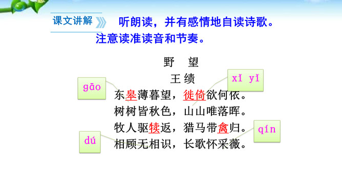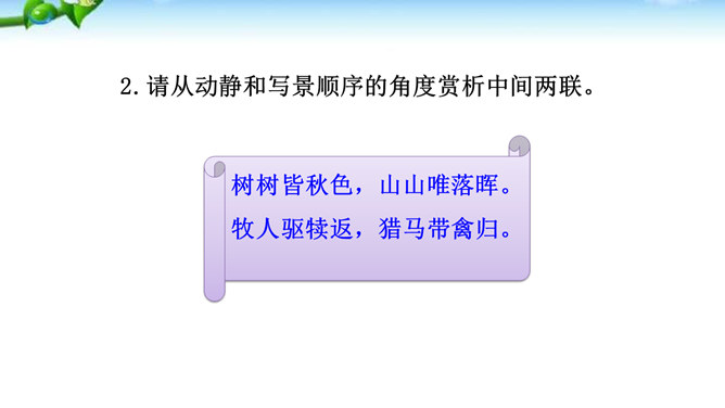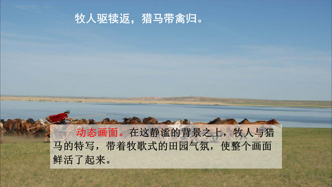 首联在全诗中的作用是什么?以平平淡淡的叙述,首先推出薄薄暮色之中,诗人兀立在东皋之上,举目四望,一种莫可明状的孤寂无依的愁绪涌上心头,使之无法平静下来,以此观景自然会涂上一层心理上的不平衡色彩,并为中间四句写景提供巧妙的铺垫。请从动静和写景顺序的角度赏析中间两联。中间四句写薄暮中所见景物。举目四望,到处是一片秋色,在夕阳的余晖中越发显得萧瑟。在这静谧的背景之上,牧人与猎马的特写,带着牧歌式的田园气氛,使整个画面活跃了起来。这四句诗宛如一幅山家晚秋图,光与色,远景与近景,静态与动态,搭配得恰到好处。所属专题:野望ppt。