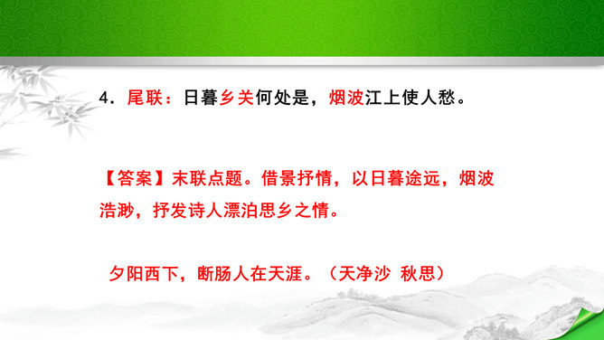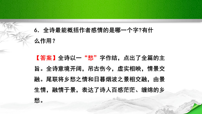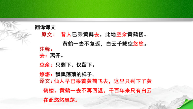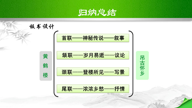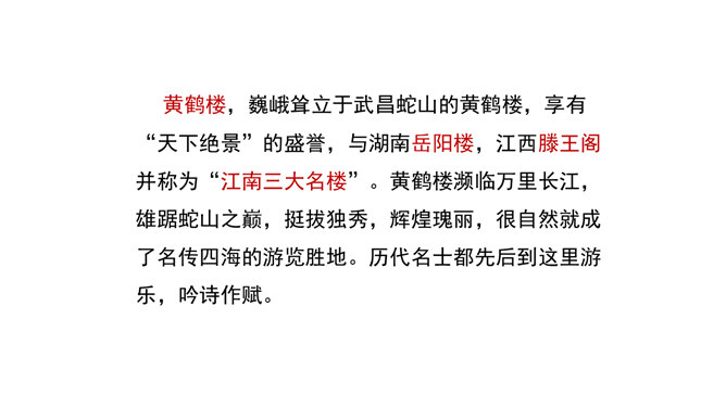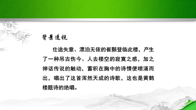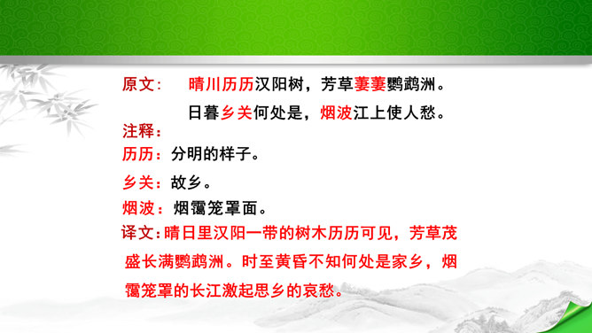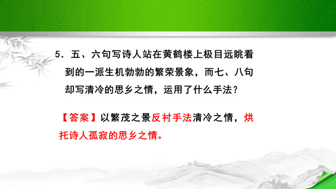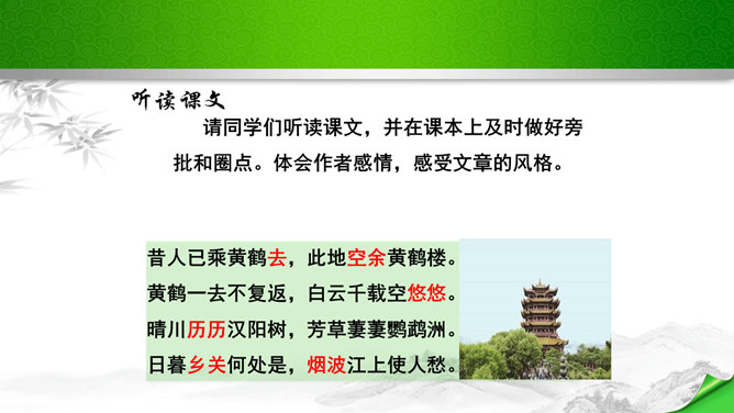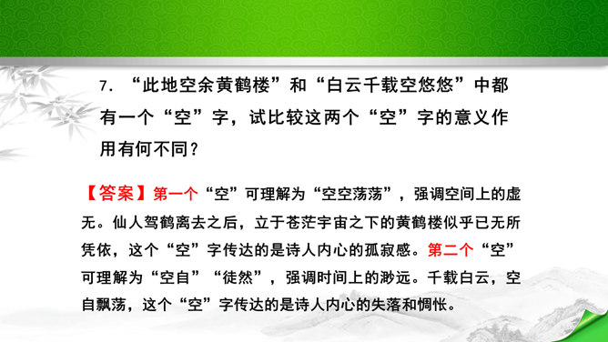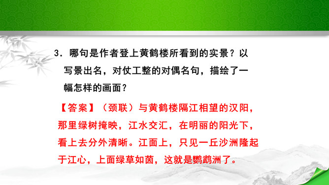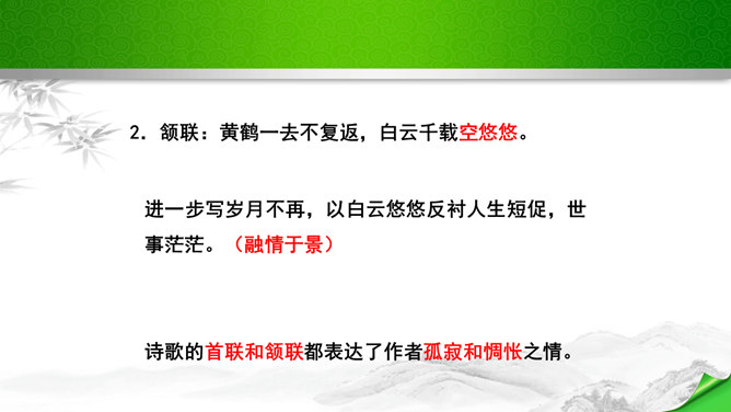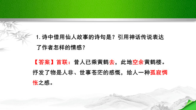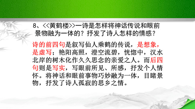 是怎样将神话传说和眼前景物融为一体的?抒发了诗人怎样的情感?诗的前四句是叙写仙人乘鹤的传说,是想象,是虚写;艳阳高照,澄空流碧,恍惚中,汉水北岸的树木化作久久思念的亲爱之人。而后四句则是写实,写眼前所见、所感,抒发个人情怀。将神话和眼前事物巧妙融为一体,目睹景物,抒发了诗人孤寂的思乡之情。这首诗首联和颔联从传说入笔,讲述“昔人”“黄鹤”,这是虚写,给人无限缥缈的感受,气势苍茫。颈联和尾联转而写楼上的所见所闻,这是实写,很自然地引起诗人浓浓的乡愁。所属专题:黄鹤楼ppt。