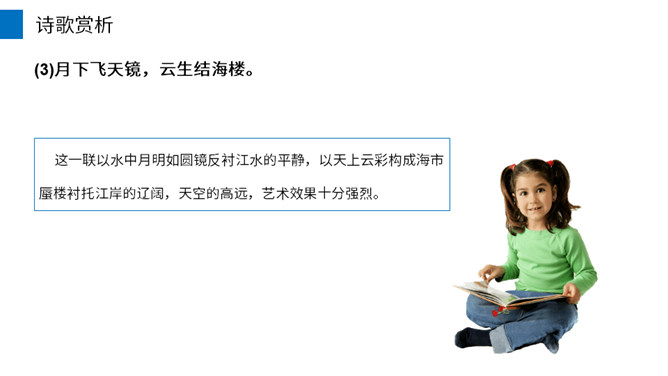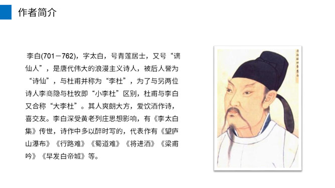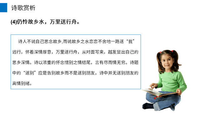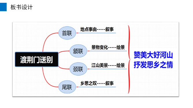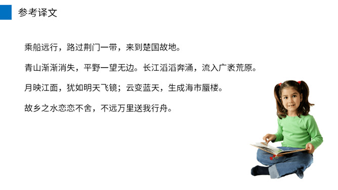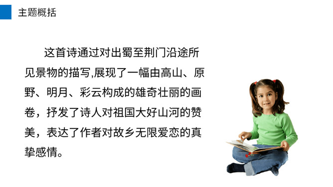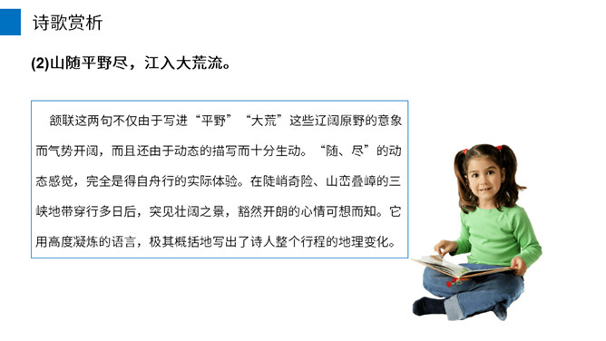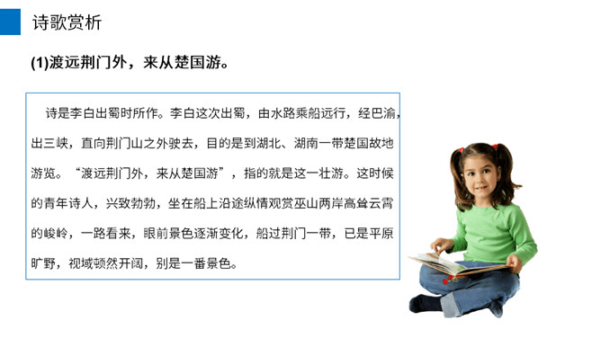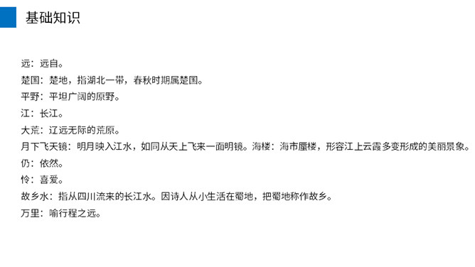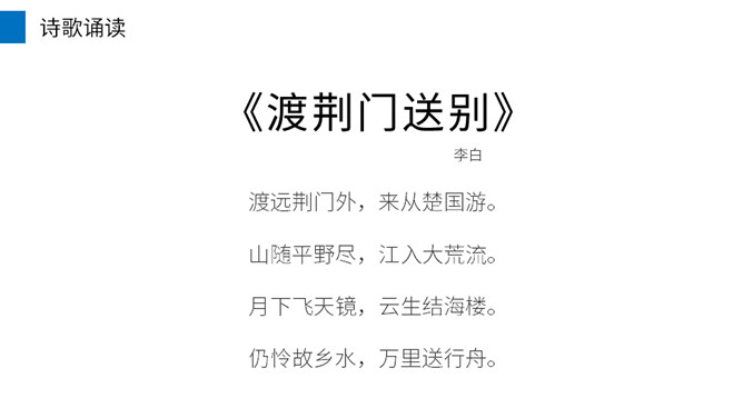 李白这次出蜀,由水路乘船远行,经巴渝,出三峡,直向荆门山之外驶去,目的是到湖北、湖南一带楚国故地游览。“渡远荆门外,来从楚国游”,指的就是这一壮游。这时候的青年诗人,兴致勃勃,坐在船上沿途纵情观赏巫山两岸高耸云霄的峻岭,一路看来,眼前景色逐渐变化,船过荆门一带,已是平原旷野,视域顿然开阔,别是一番景色。颔联这两句不仅由于写进“平野”“大荒”这些辽阔原野的意象而气势开阔,而且还由于动态的描写而十分生动。“随、尽”的动态感觉,完全是得自舟行的实际体验。所属专题:渡荆门送别ppt。
