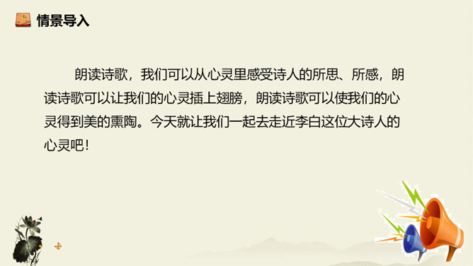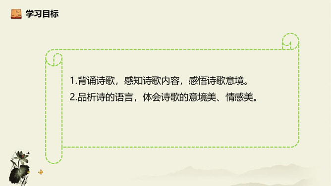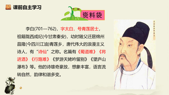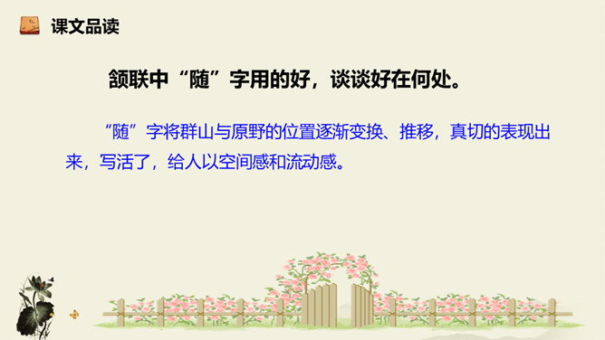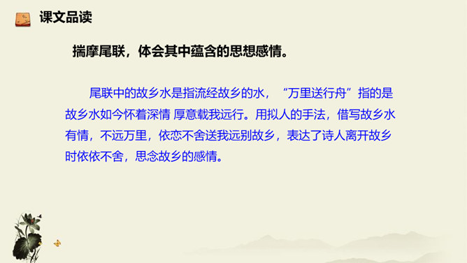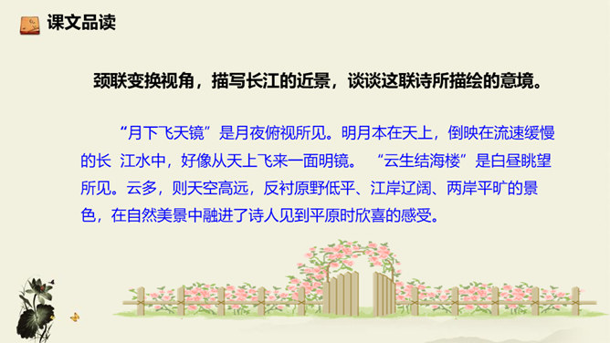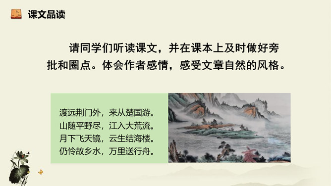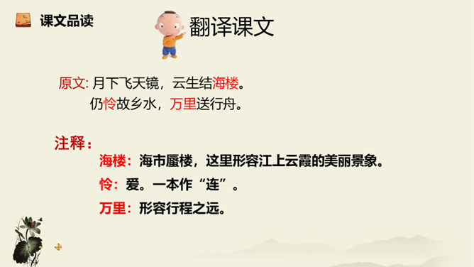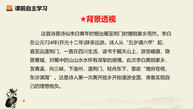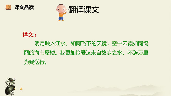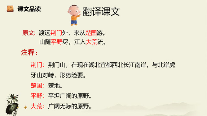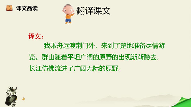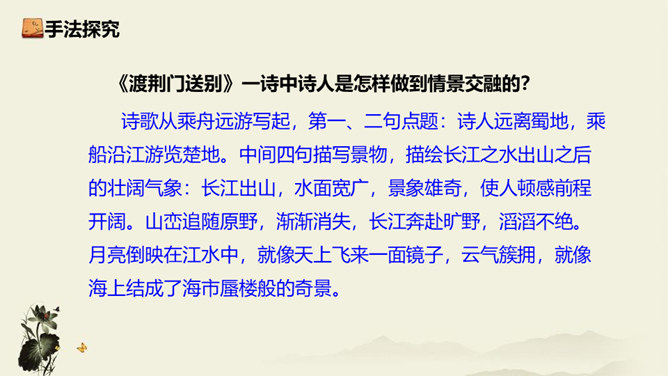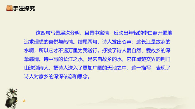 诗歌从乘舟远游写起,第一、二句点题:诗人远离蜀地,乘船沿江游览楚地。中间四句描写景物,描绘长江之水出山之后的壮阔气象:长江出山,水面宽广,景象雄奇,使人顿感前程开阔。山峦追随原野,渐渐消失,长江奔赴旷野,滔滔不绝。月亮倒映在江水中,就像天上飞来一面镜子,云气簇拥,就像海上结成了海市蜃楼般的奇景。这四句写景层次分明,且景中寓情,反映出年轻的李白离开蜀地追求理想的喜悦与热情。结尾两句,诗人发出心声:这长江是故乡的水啊,所以它才不远万里为我送行,抒发了诗人爱自然、爱故乡的深挚感情。所属专题:渡荆门送别ppt。