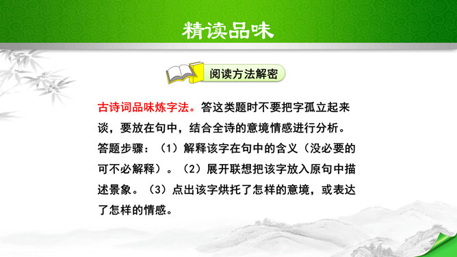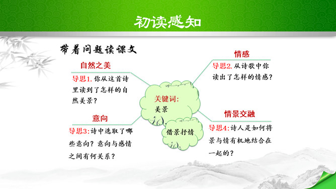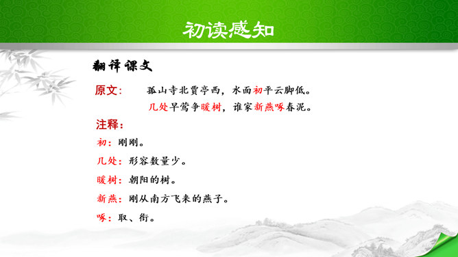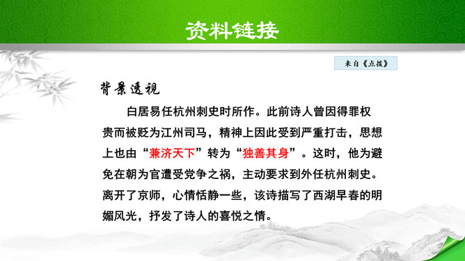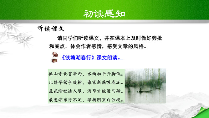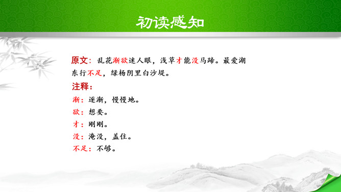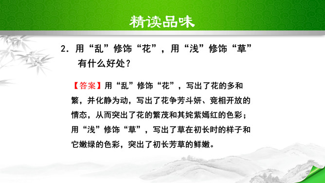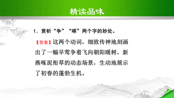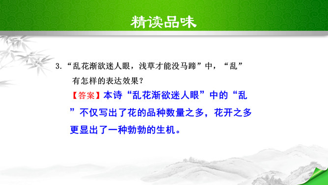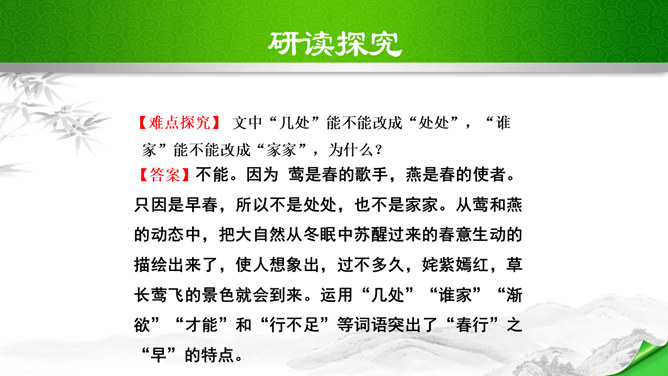 文中“几处”能不能改成“处处”,“谁家”能不能改成“家家”,为什么?不能。因为 莺是春的歌手,燕是春的使者。只因是早春,所以不是处处,也不是家家。从莺和燕的动态中,把大自然从冬眠中苏醒过来的春意生动的描绘出来了,使人想象出,过不多久,姹紫嫣红,草长莺飞的景色就会到来。运用“几处”“谁家”“渐欲”“才能”和“行不足”等词语突出了“春行”之“早”的特点。“行不足”是因为看不够,说明诗人流连忘返,心情愉悦,完全沉浸在美好的湖光山色之中了。所属专题:钱塘湖春行ppt。