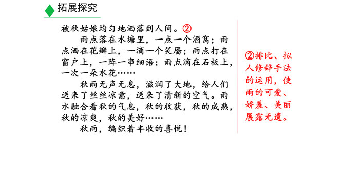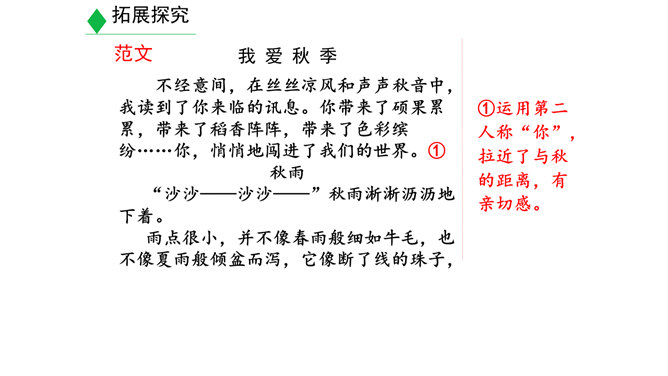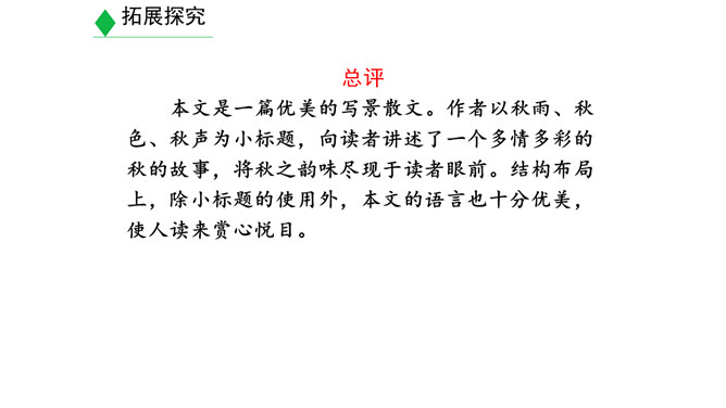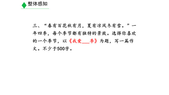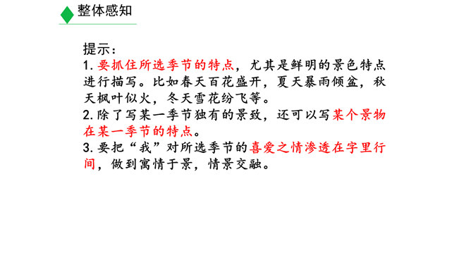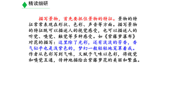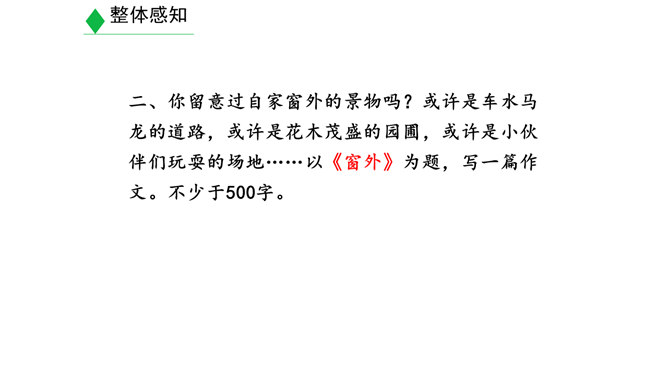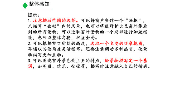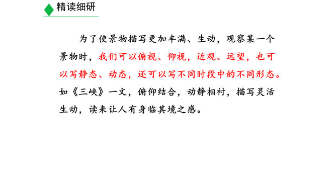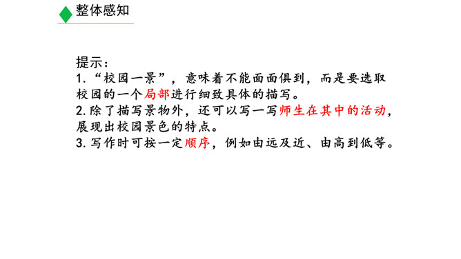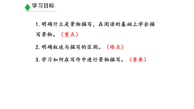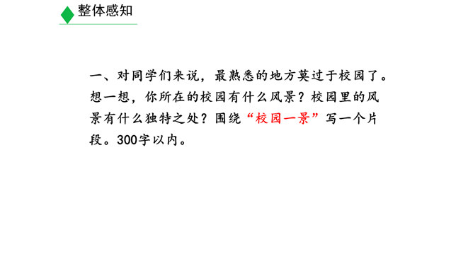 学习目标:1.明确什么是景物描写,在阅读的基础上学会描写景物。(重点)2.明确叙述与描写的区别。(难点)3.学习如何在写作中进行景物描写。(素养)对同学们来说,最熟悉的地方莫过于校园了。想一想,你所在的校园有什么风景?校园里的风景有什么独特之处?围绕“校园一景”写一个片段。300字以内。提示:1.“校园一景”,意味着不能面面俱到,而是要选取校园的一个局部进行细致具体的描写。2.除了描写景物外,还可以写一写师生在其中的活动,展现出校园景色的特点。3.写作时可按一定顺序,例如由远及近、由高到低等。所属专题:学习描写景物ppt。