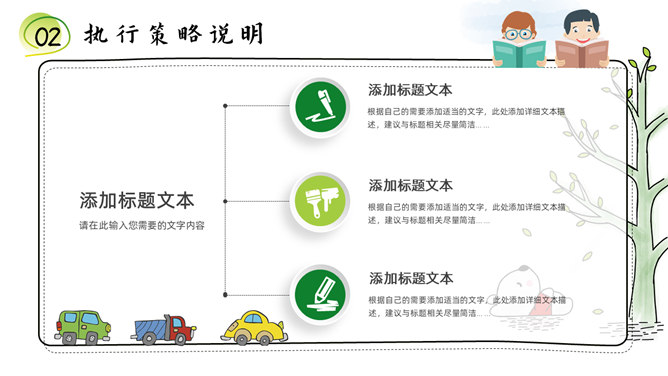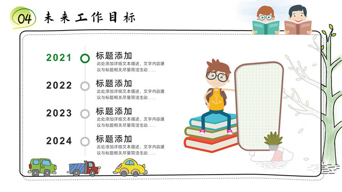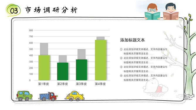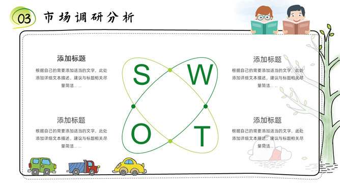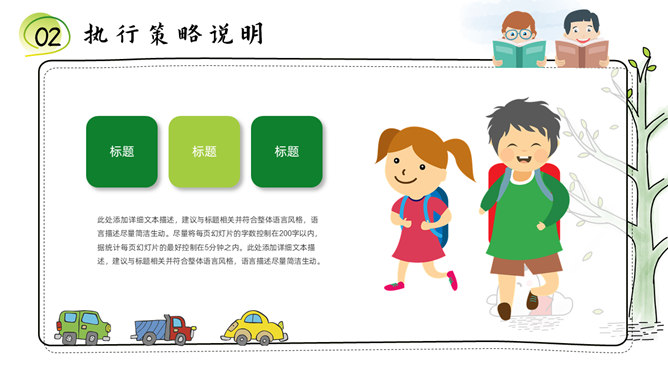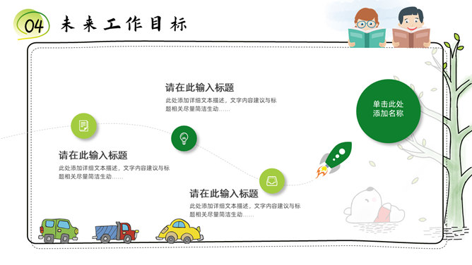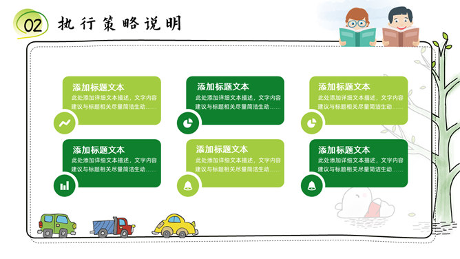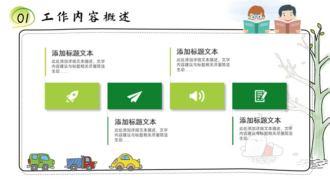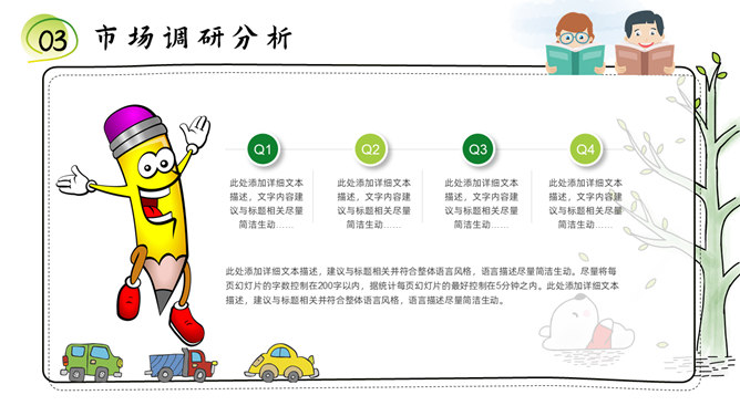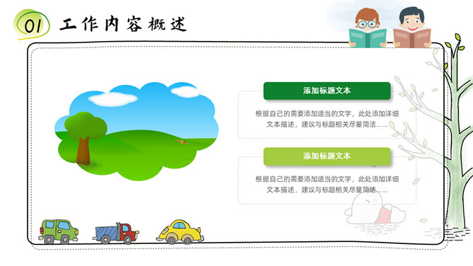 可爱卡通说课教学课件PPT模板。一套教育教学说课课件幻灯片模板,可爱卡通设计风格,清新绿色主色调。