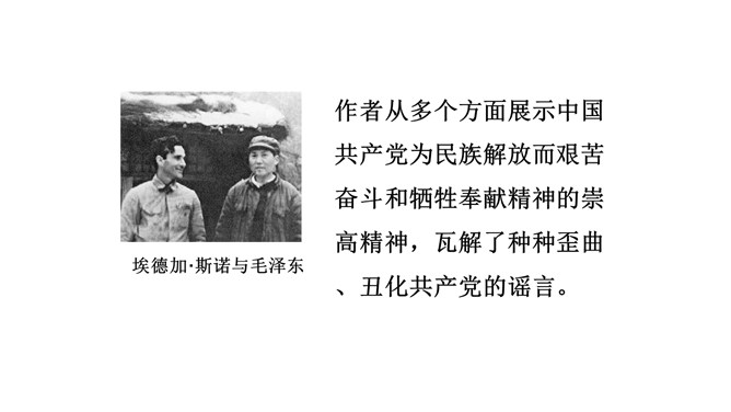 1927年4月12日,以蒋介石为首的国民党右派发动了反革命政变,大肆屠杀迫害共产党员、国民党左派和革命群众。与此同时,与中国共产党、红军有关的消息也被严密封锁。埃德加·斯诺,美国著名记者。他于1928年来华,曾任欧美几家报社驻华记者、通讯员。1933年4月到1935年6月,斯诺同时兼任北平燕京大学新闻系讲师。1936年6月斯诺访问陕甘宁边区,写了大量通讯报道,成为第一个采访红区的西方记者。作者从多个方面展示中国共产党为民族解放而艰苦奋斗和牺牲奉献精神的崇高精神,瓦解了种种歪曲、丑化共产党的谣言。所属专题:红星照耀中国ppt。