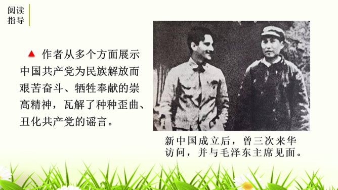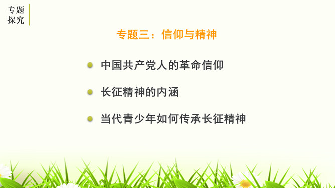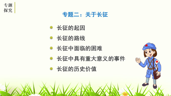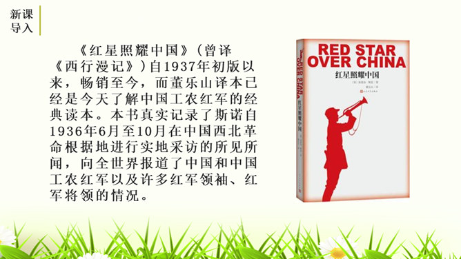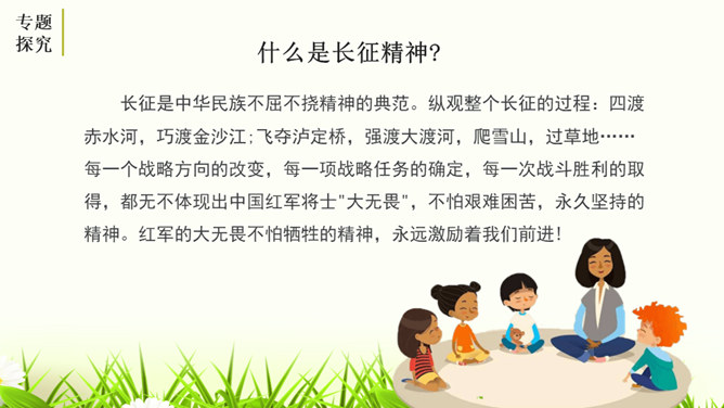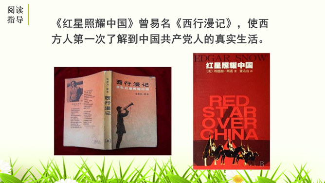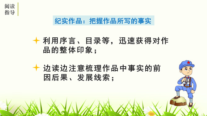 纪实作品:把握作品所写的事实。利用序言、目录等,迅速获得对作品的整体印象;边读边注意梳理作品中事实的前因后果、发展线索;把握作品中的“事实”之后,还要读明白作者想用事实说什么“话”;要从中获得启迪,用来指导自己的学习与生活。什么是长征精神?长征是中华民族不屈不挠精神的典范。纵观整个长征的过程:四渡赤水河,巧渡金沙江;飞夺泸定桥,强渡大渡河,爬雪山,过草地……每一个战略方向的改变,每一项战略任务的确定,每一次战斗胜利的取得,都无不体现出中国红军将士"大无畏",不怕艰难困苦,永久坚持的精神。所属专题:红星照耀中国ppt。