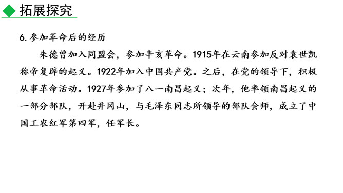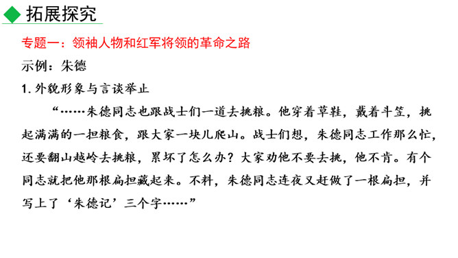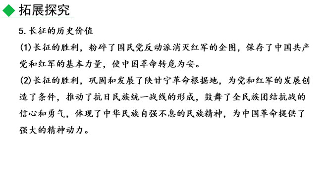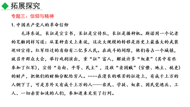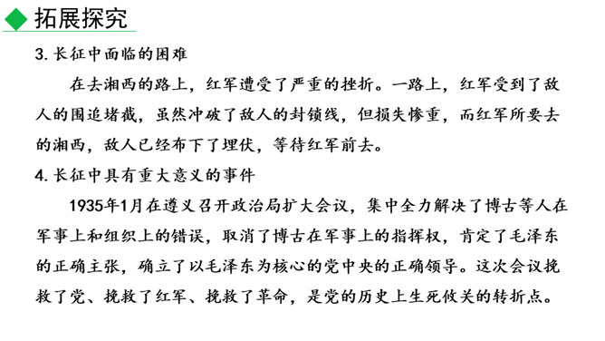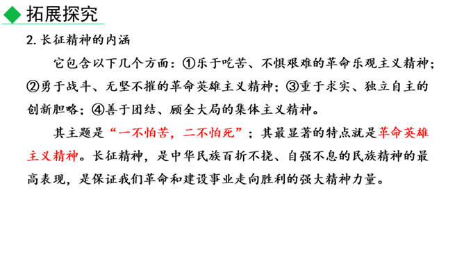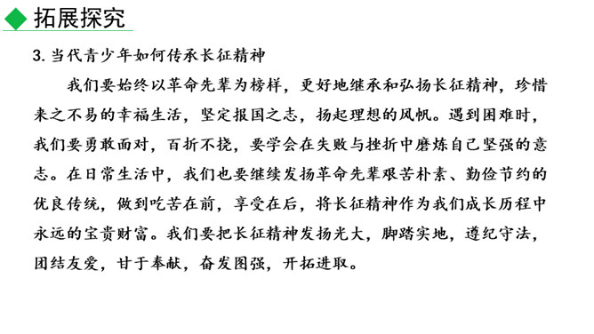我们要始终以革命先辈为榜样,更好地继承和弘扬长征精神,珍惜来之不易的幸福生活,坚定报国之志,扬起理想的风帆。遇到困难时,我们要勇敢面对,百折不挠,要学会在失败与挫折中磨炼自己坚强的意志。在日常生活中,我们也要继续发扬革命先辈艰苦朴素、勤俭节约的优良传统,做到吃苦在前,享受在后,将长征精神作为我们成长历程中永远的宝贵财富。我们要把长征精神发扬光大,脚踏实地,甘于奉献,奋发图强,开拓进取。所属专题:红星照耀中国ppt。