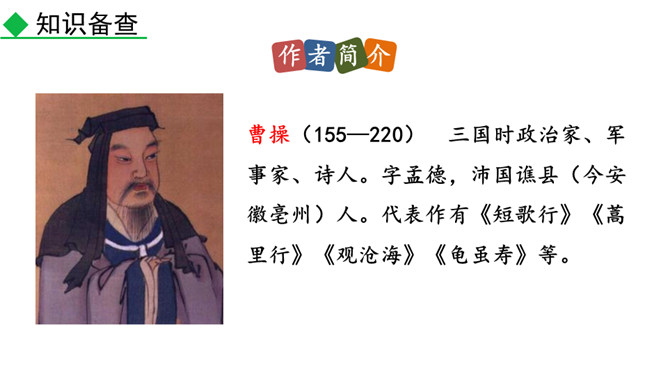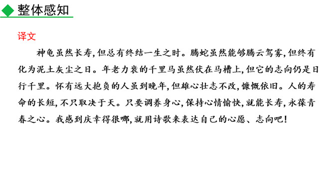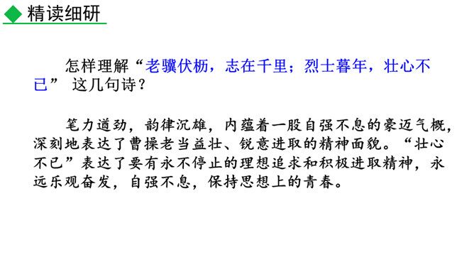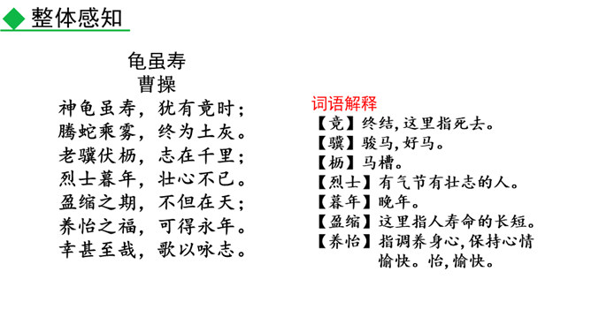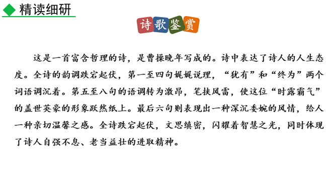 这是一首富含哲理的诗,是曹操晚年写成的。诗中表达了诗人的人生态度。全诗的韵调跌宕起伏,第一至四句娓娓说理,“犹有”和“终为”两个词语调沉着。第五至八句的语调转为激昂,笔挟风雷,使这位“时露霸气”的盖世英豪的形象跃然纸上。最后六句则表现出一种深沉委婉的风情,给人一种亲切温馨之感。全诗跌宕起伏,文思缜密,闪耀着智慧之光,同时体现了诗人自强不息、老当益壮的进取精神。所属专题:龟虽寿ppt。