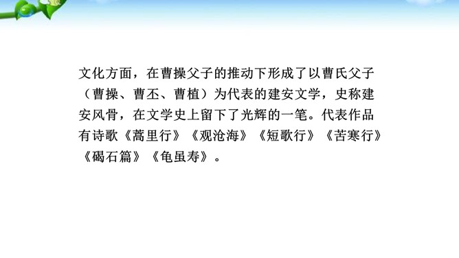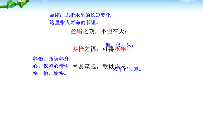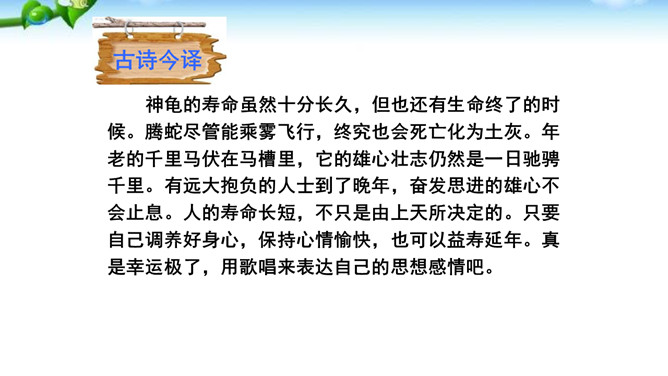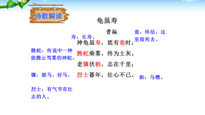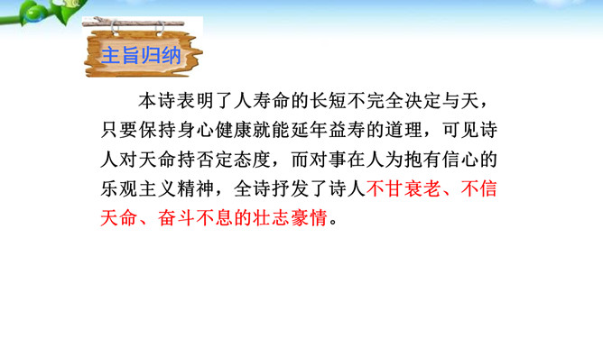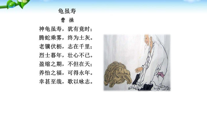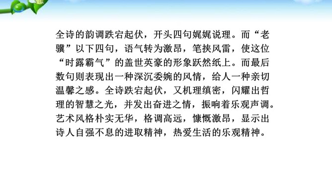 全诗的韵调跌宕起伏,开头四句娓娓说理。而“老骥”以下四句,语气转为激昂,笔挟风雷,使这位“时露霸气”的盖世英豪的形象跃然纸上。而最后数句则表现出一种深沉委婉的风情,给人一种亲切温馨之感。全诗跌宕起伏,又机理缜密,闪耀出哲理的智慧之光,并发出奋进之情,振响着乐观声调。艺术风格朴实无华,格调高远,慷慨激昂,显示出诗人自强不息的进取精神,热爱生活的乐观精神。所属专题:龟虽寿ppt。